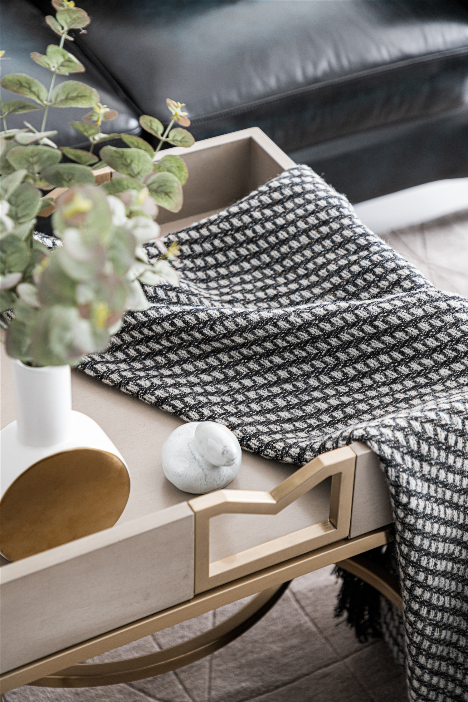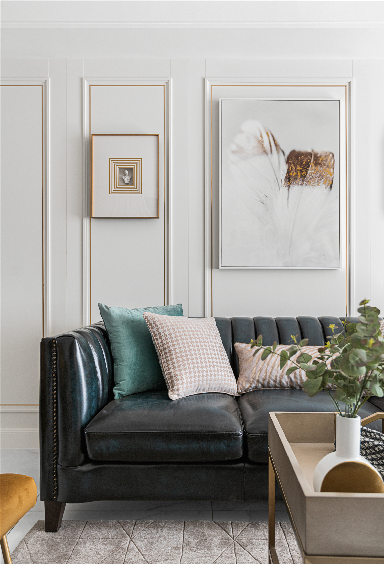 做旧皮质美式沙发、极具设计感几何茶几、抽象的装饰画,每一个细节都饱含对生活的热情和对艺术的欣赏。整体色调为居家中性色系为基础,强调简洁、明晰的线条和优雅、得体有度的装饰。浅米色的墙面搭配金属线条使得空间柔和中带着精致,更切合业主追求的自由生活的想法。