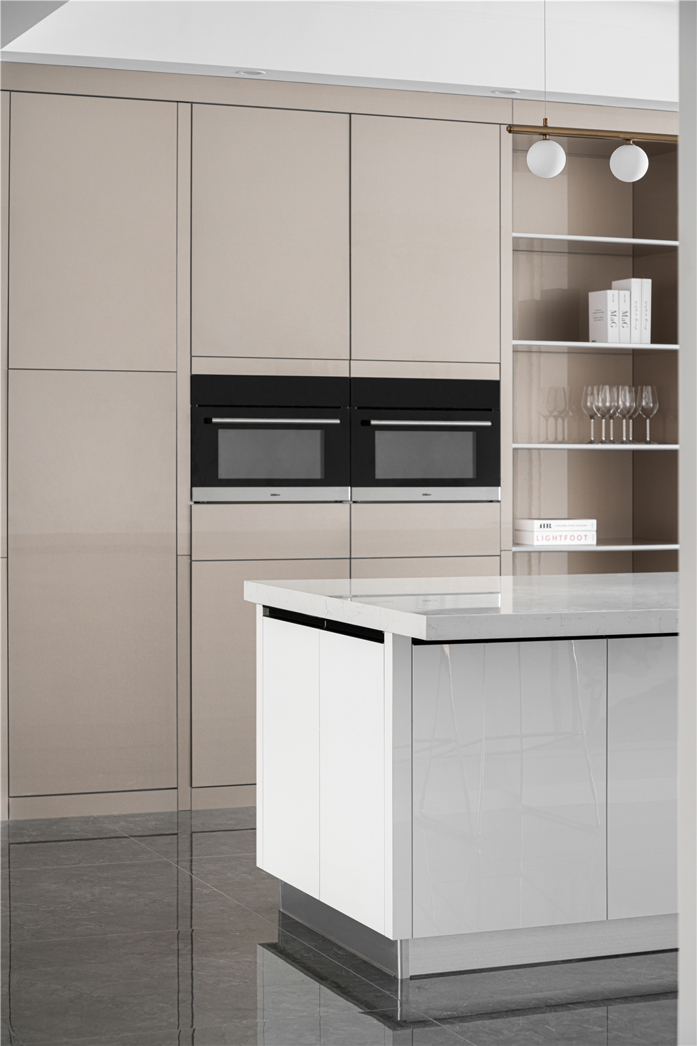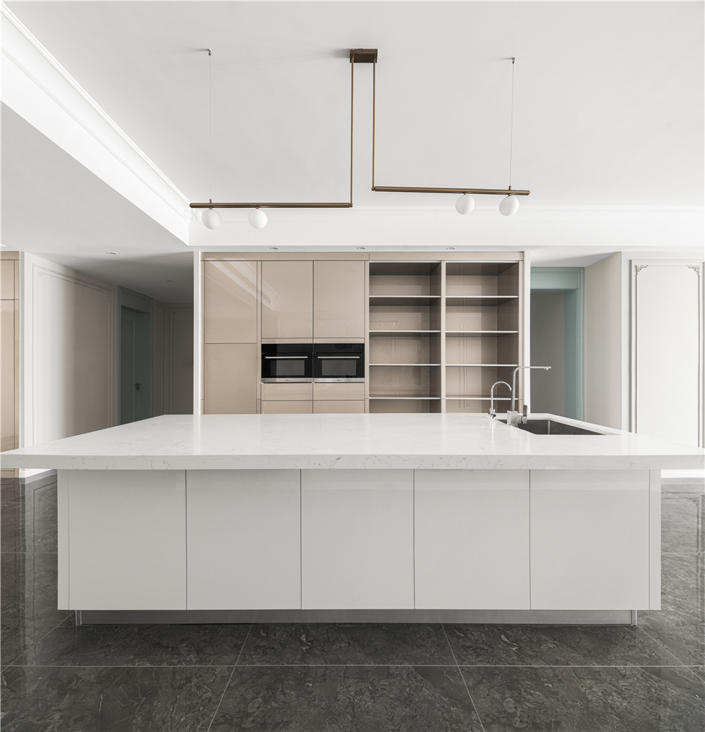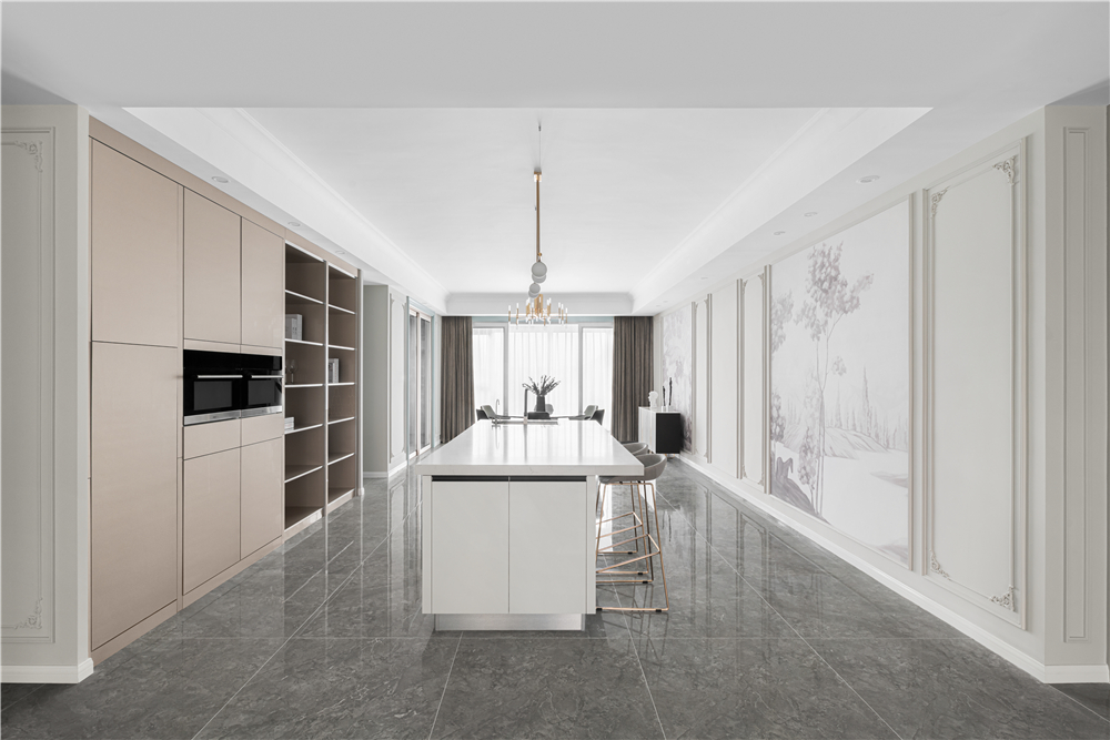 空间布局:宽敞通透的餐厅在有了岛台、电器高柜之后成了动区的生活焦点,茶水、料理、切配、甜品一副其乐融融的生活场景就此铺成开