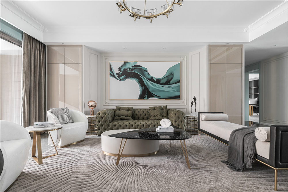 设计选材:高级灰搭配绿色,从奢华到简约、从典雅到艺术,勾勒着新潮而又充满韵味的生活写照。再议华丽的现代材质以及金属元素加以辅助,及时是简约的设计也能瞬间惊艳世人的感官。