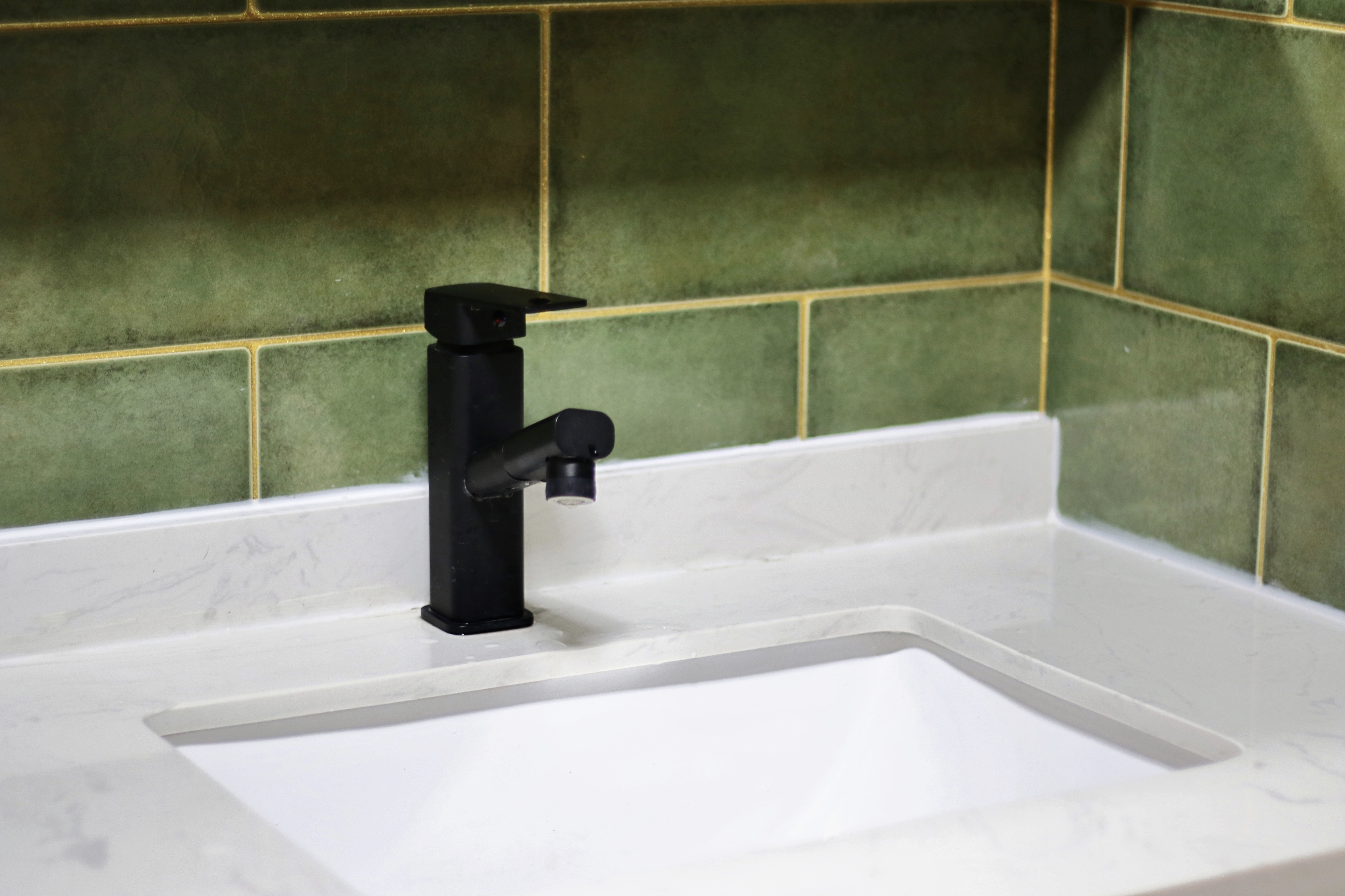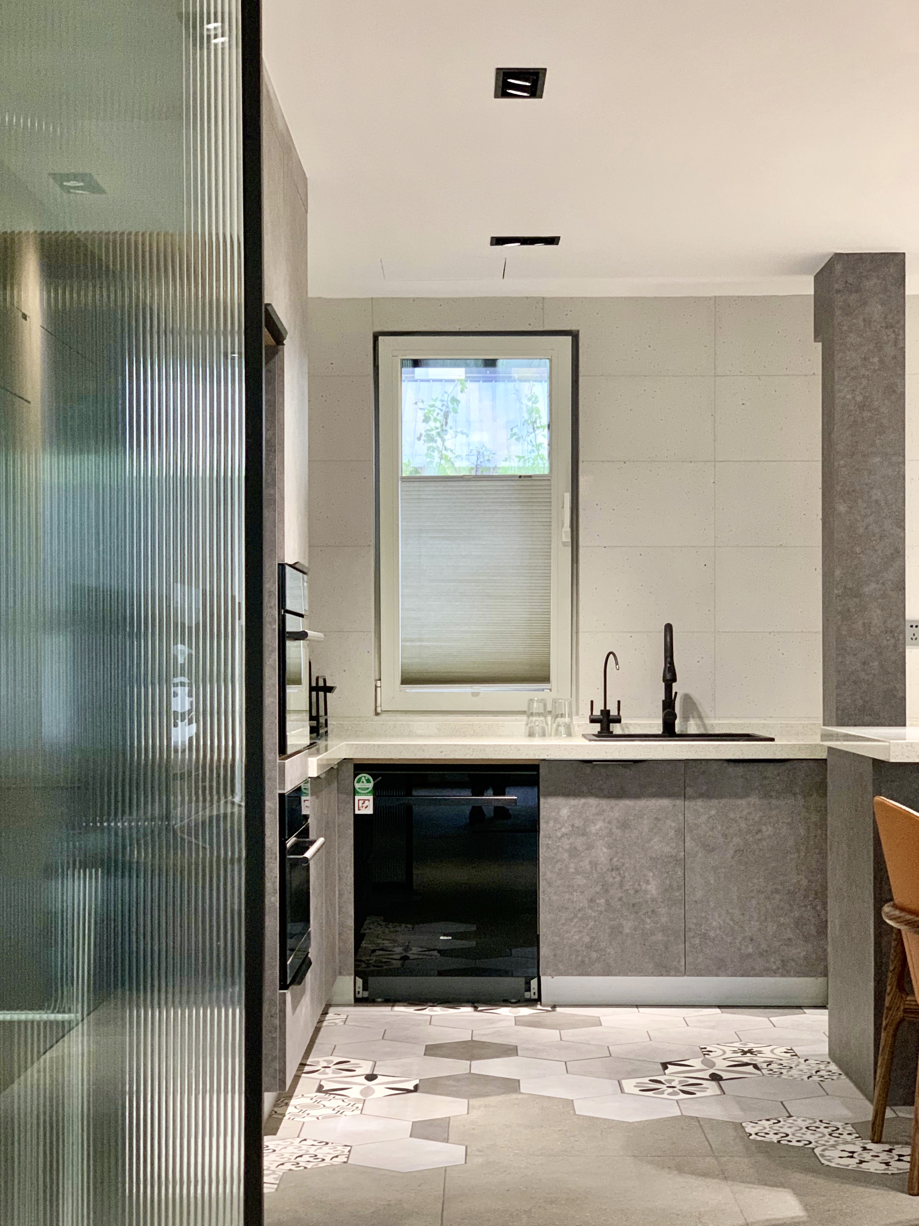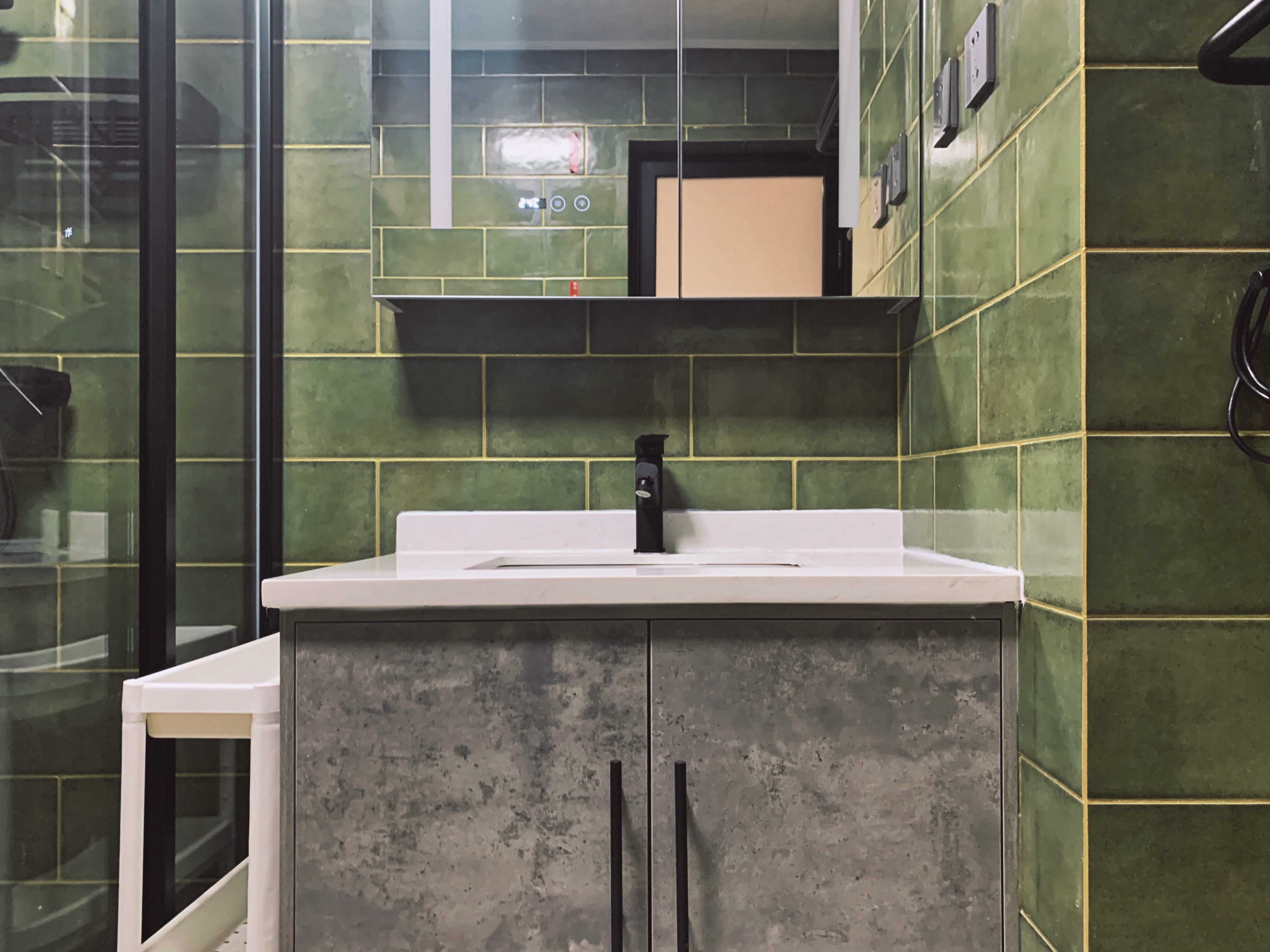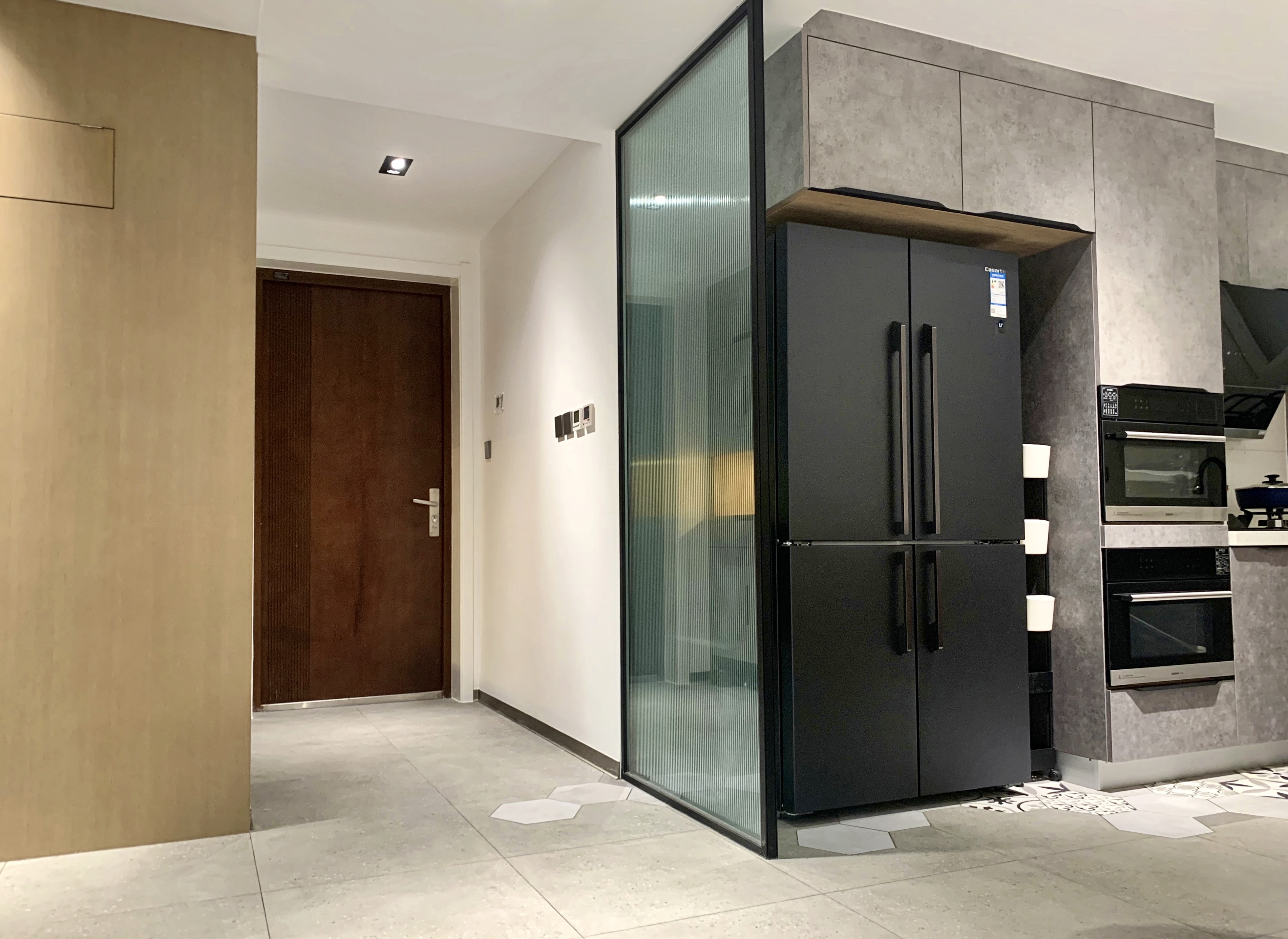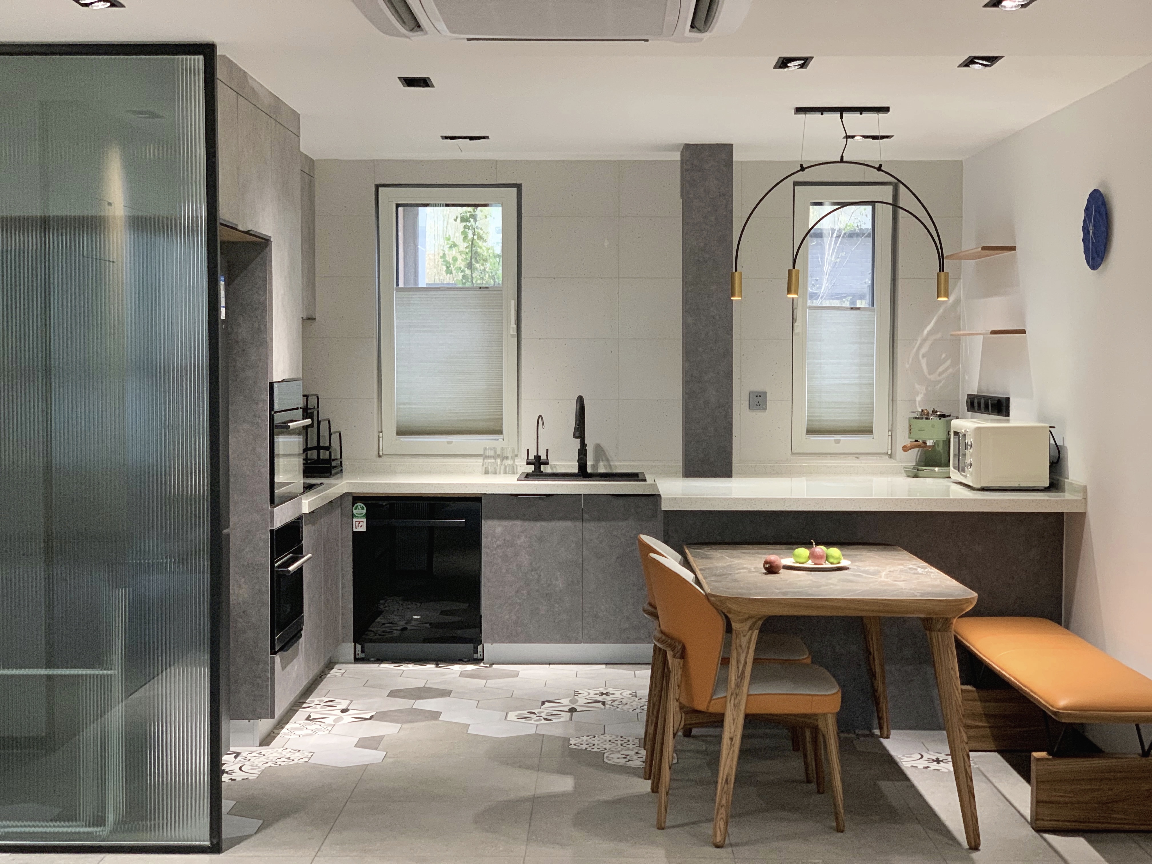 厨房的地砖随机的地砖混拼花手法,不规整的延伸至过道区域,有了些俏皮的活泼。 -