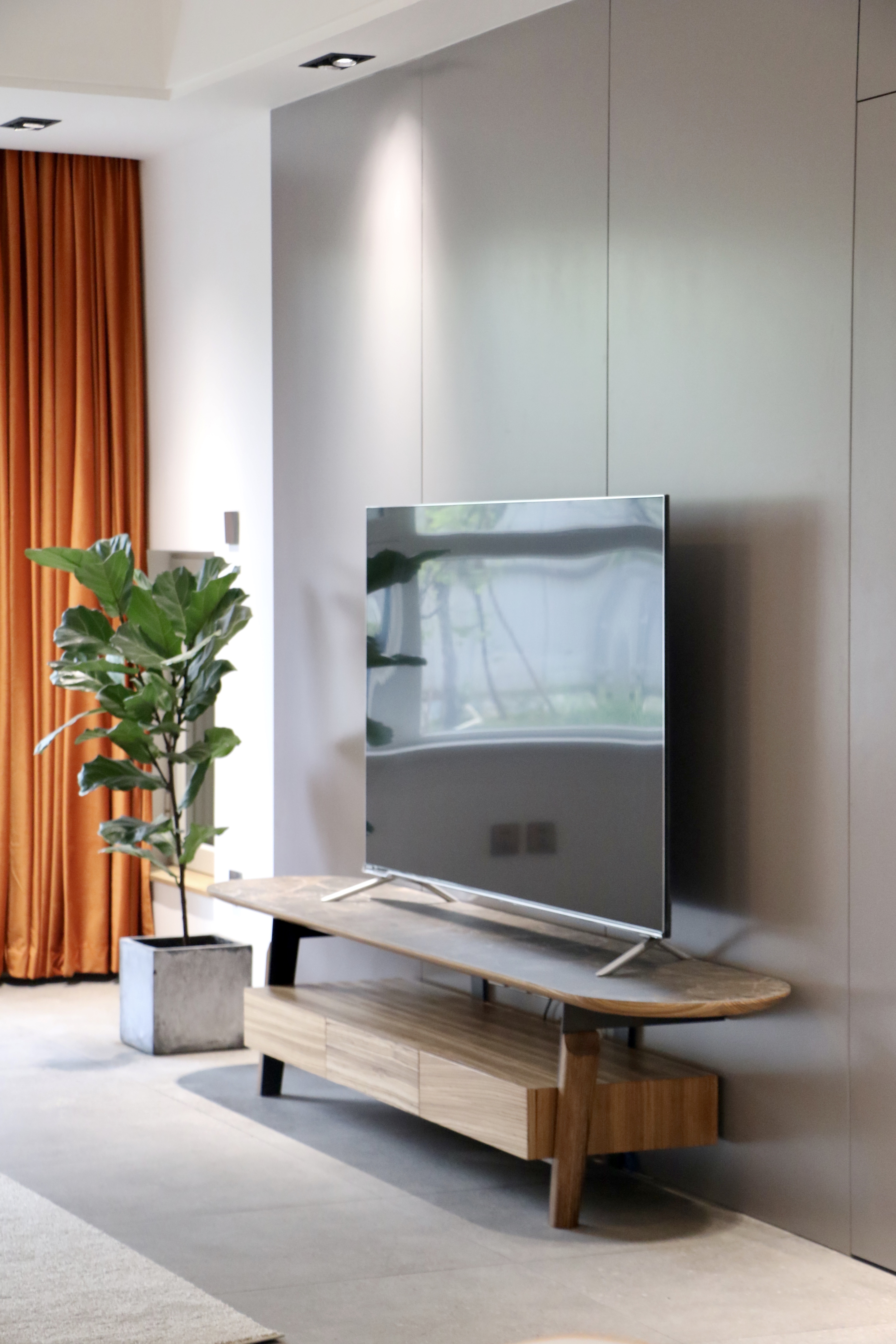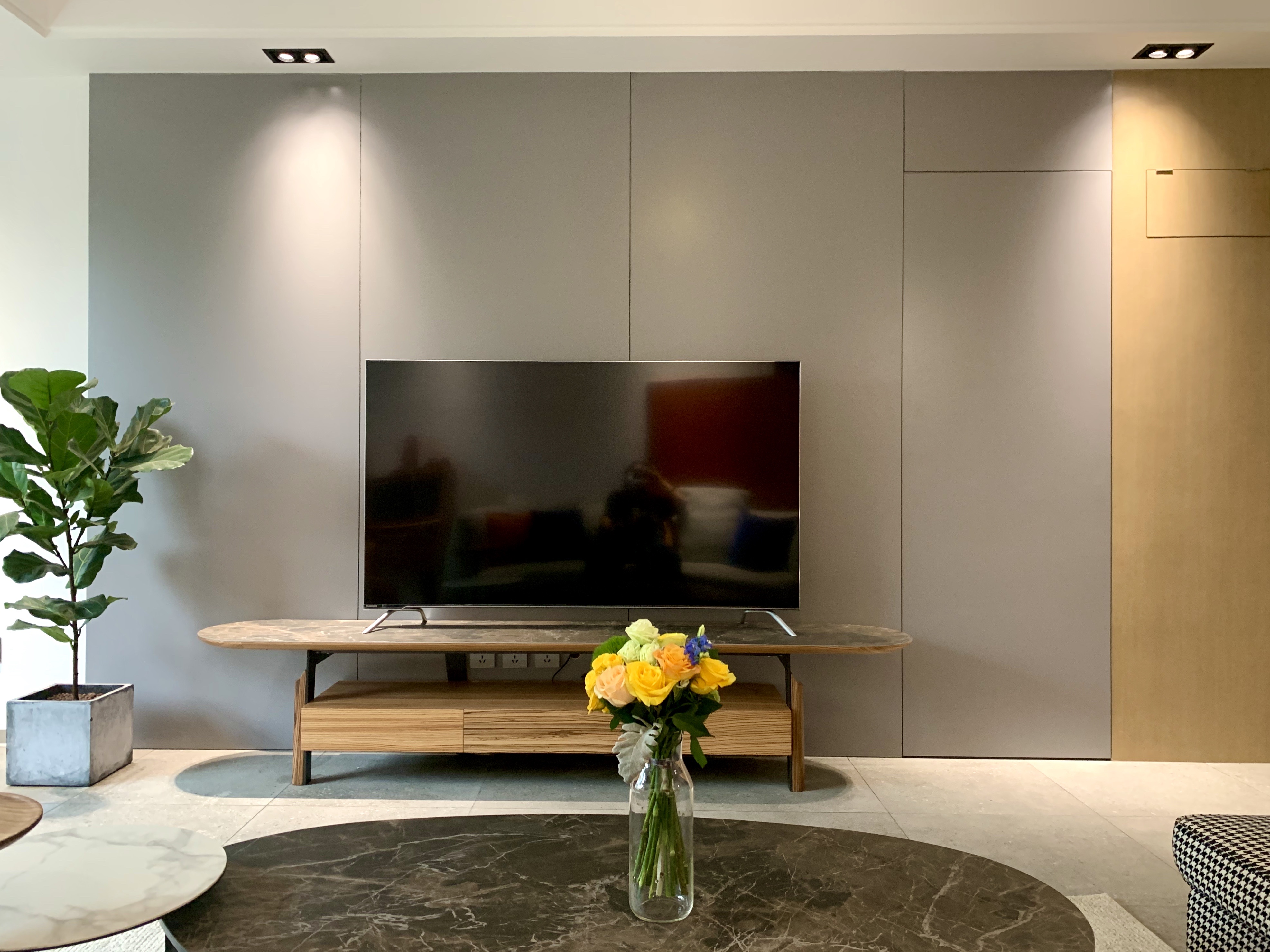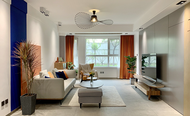 通过趣味的手法把原来阳台拆除后裸露着的下水管做了造型的包裹隐藏,让其成为了客厅的一处亮点。