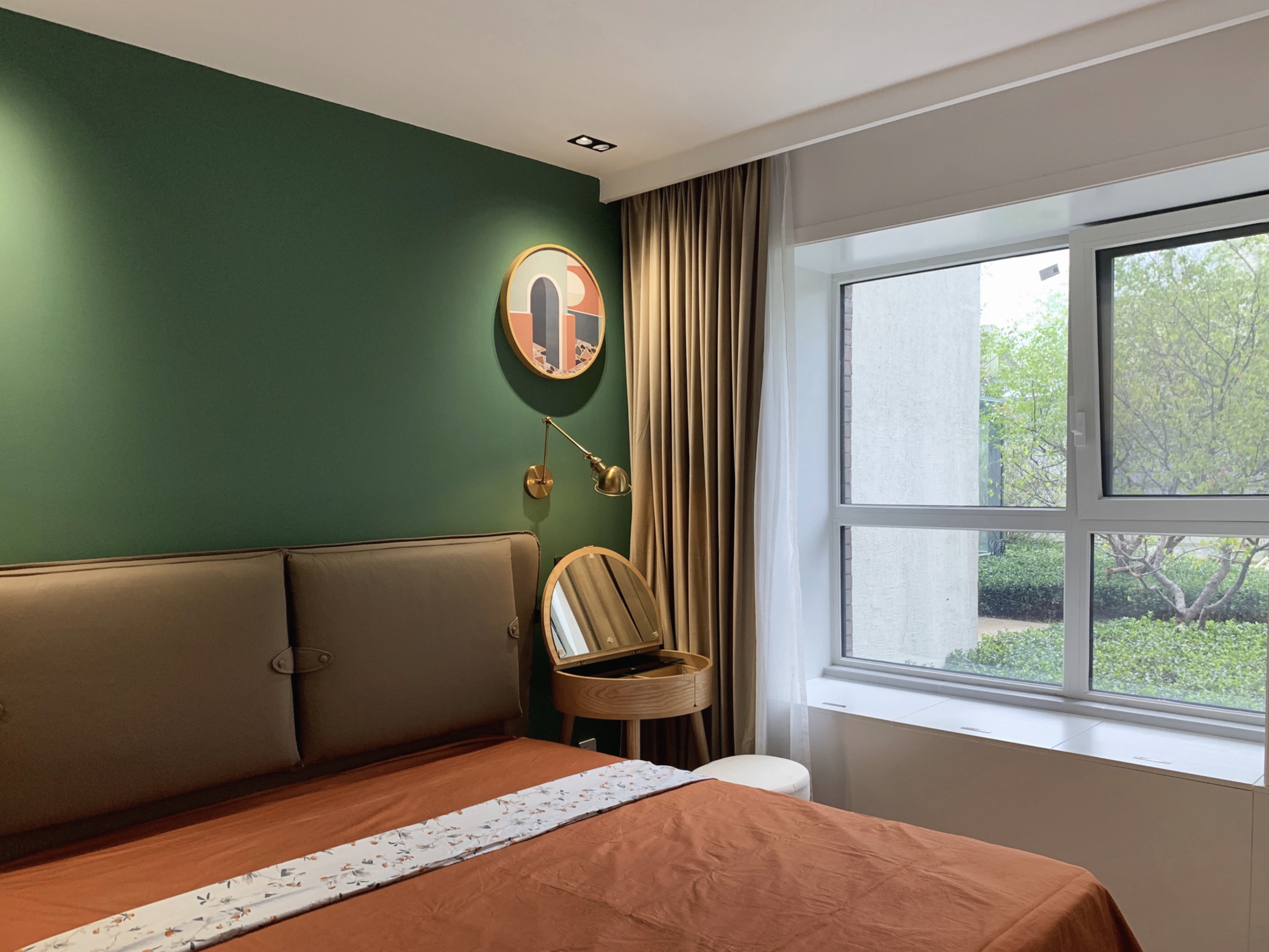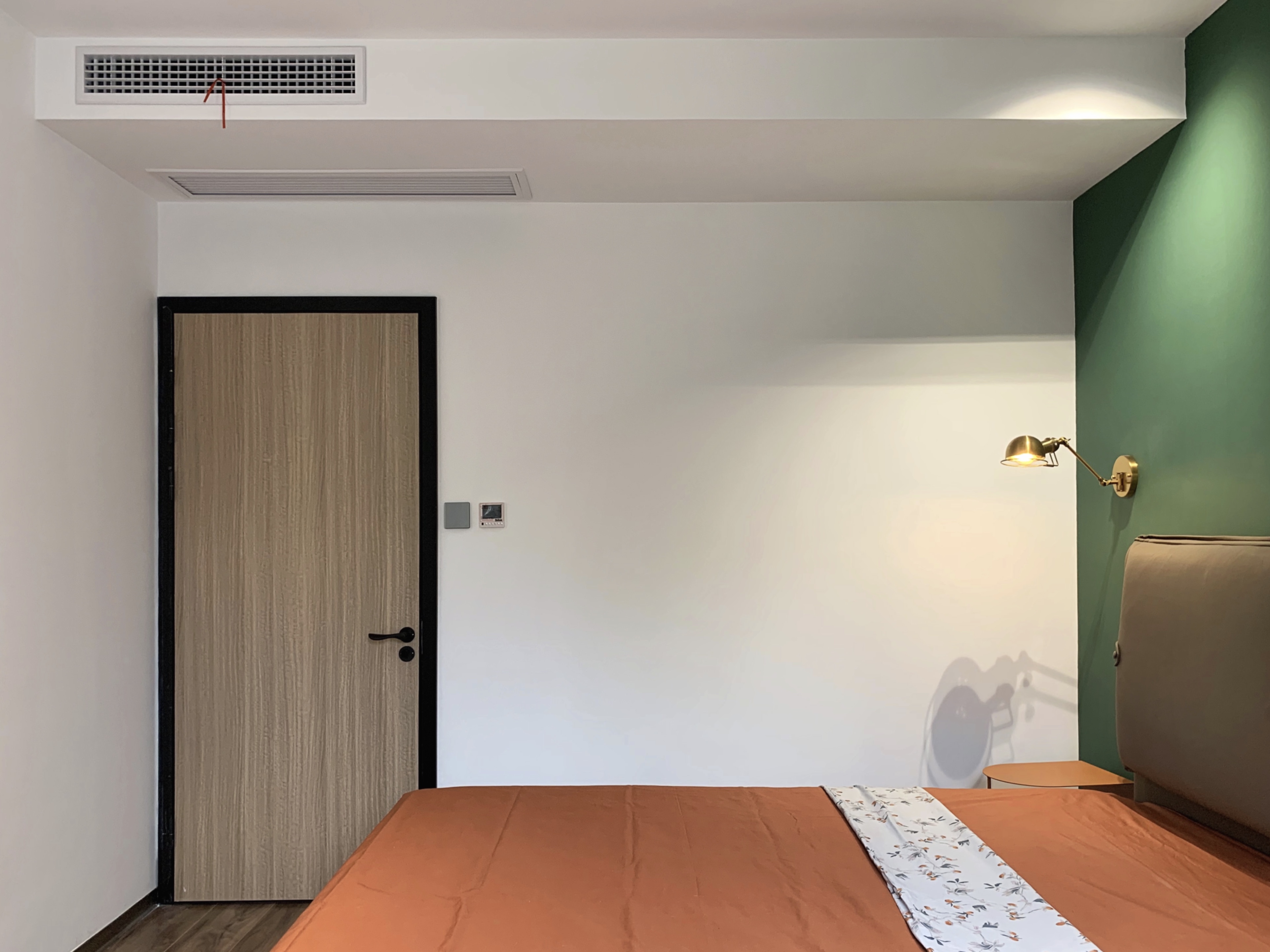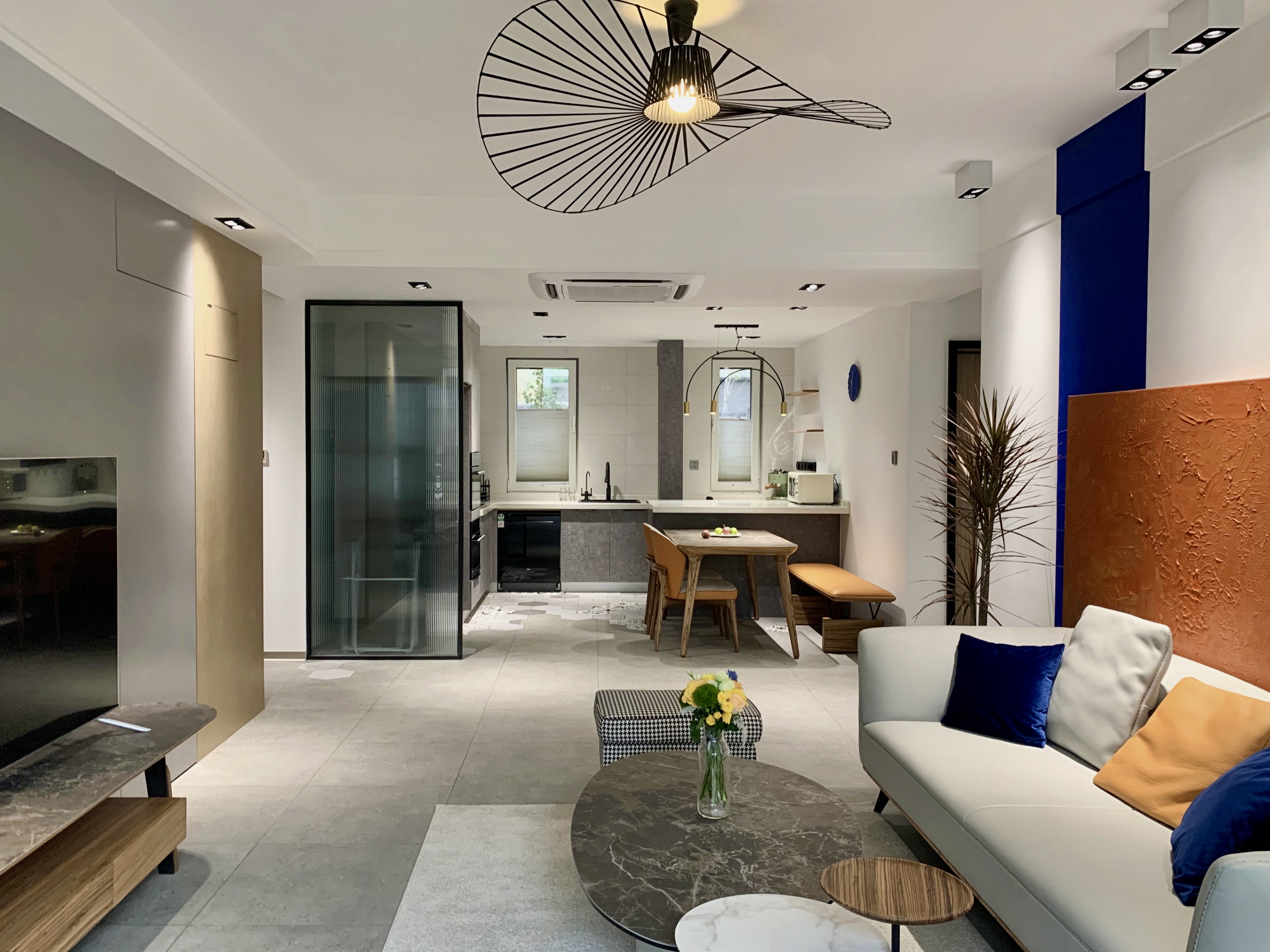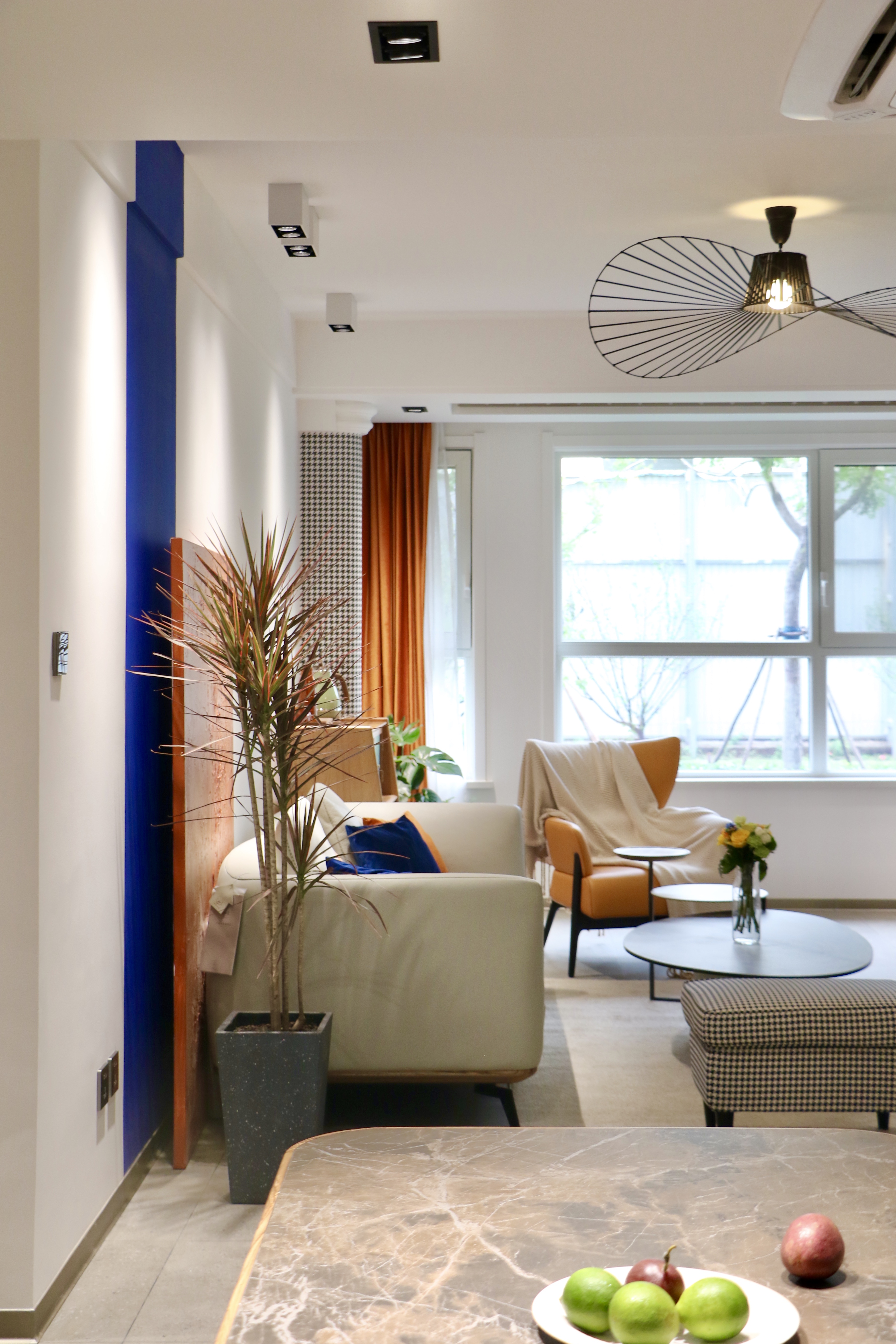 空间意境:整体空间的色彩搭配上公共空间采用了饱和度高的克莱因蓝与爱马仕橙的色彩对比色。卧室及卫生间采用了墨绿色的森林色彩,营造柔和安静的空间。