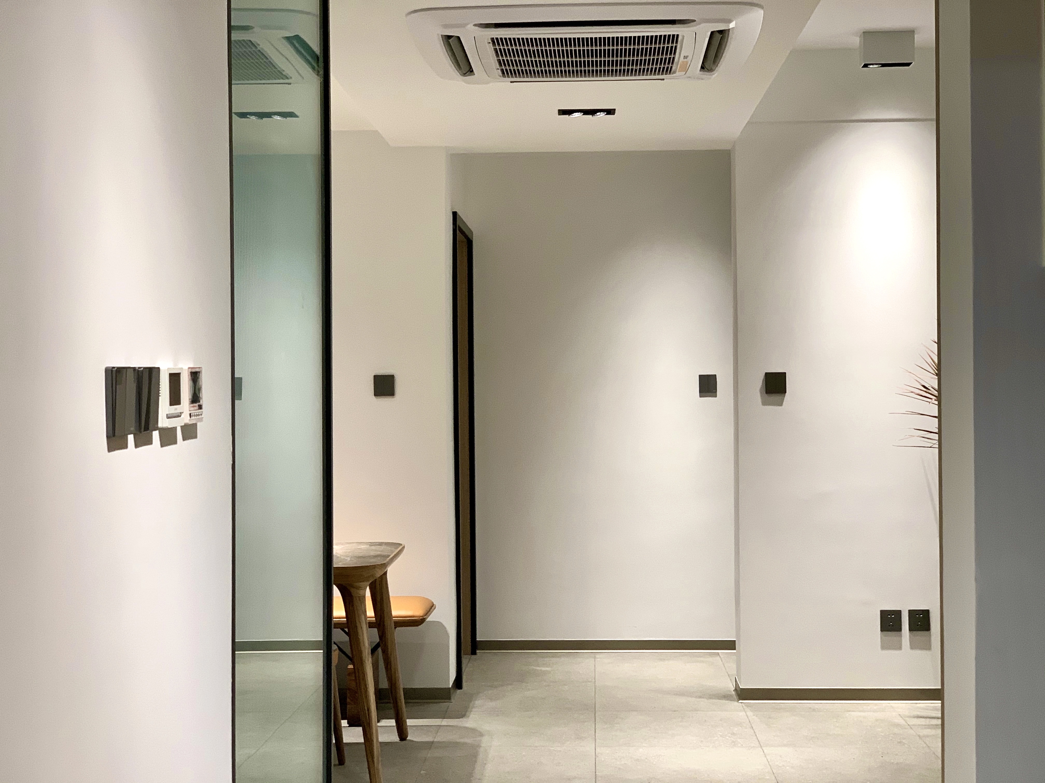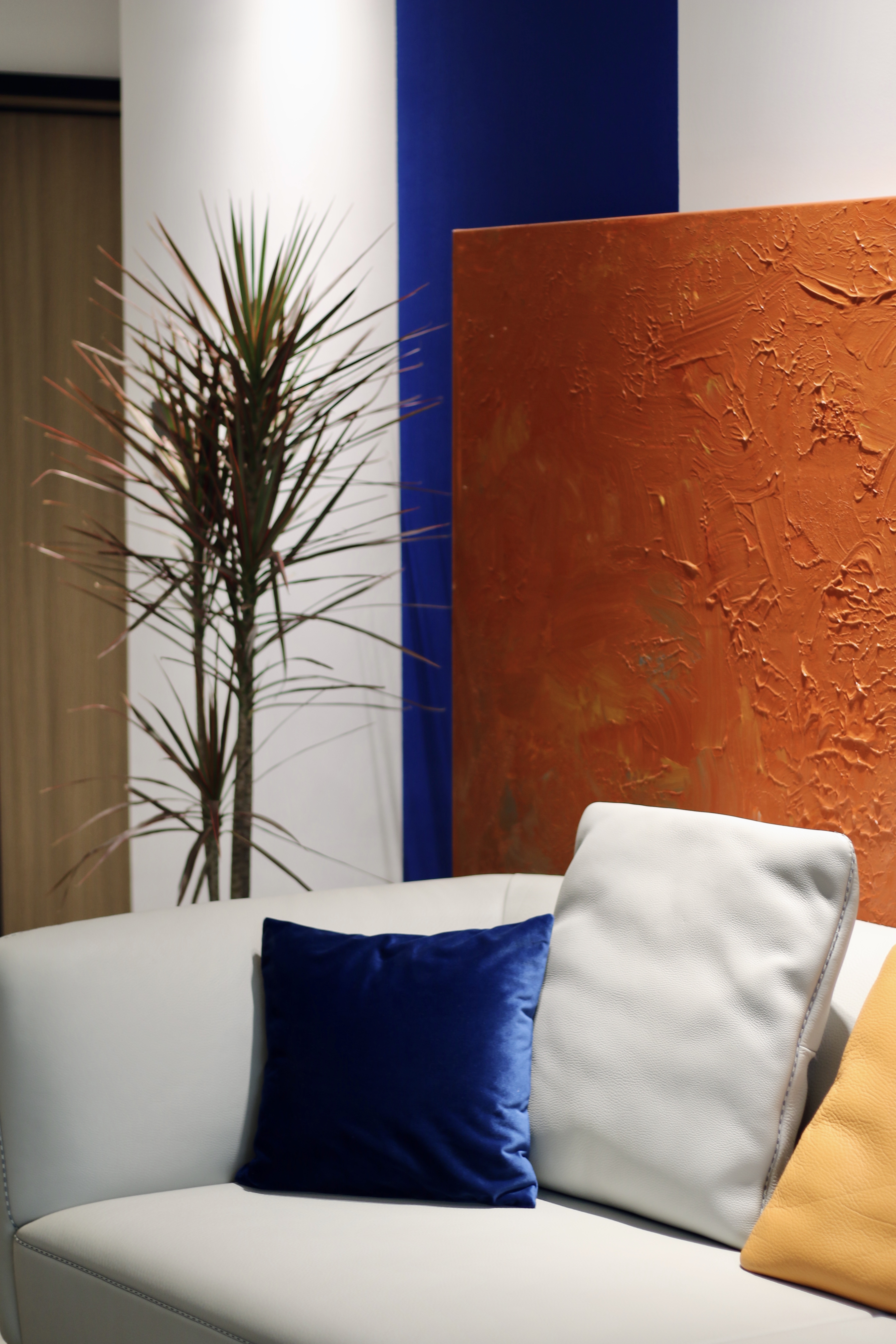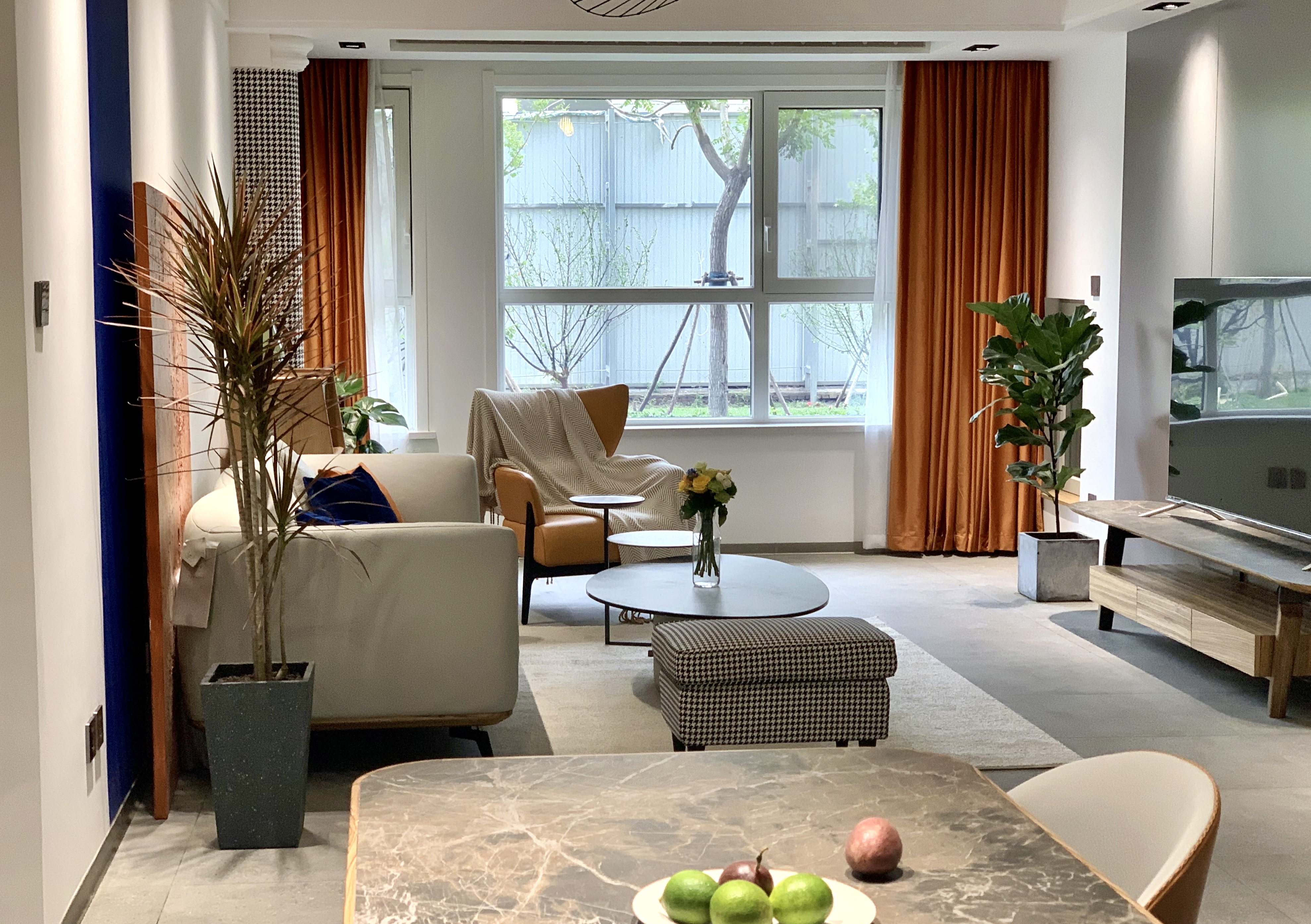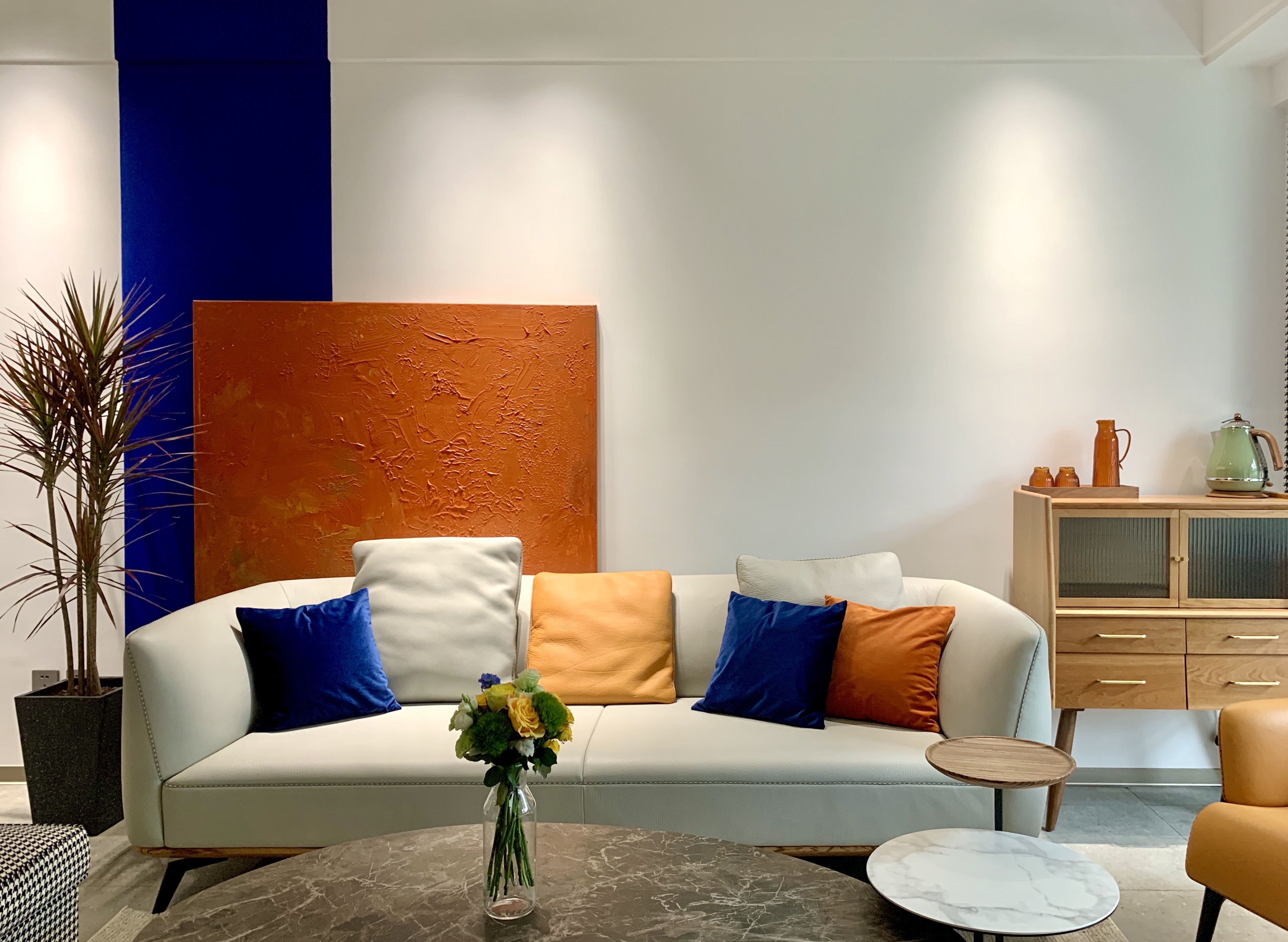 空间意境:整体空间的色彩搭配上公共空间采用了饱和度高的克莱因蓝与爱马仕橙的色彩对比色。卧室及卫生间采用了墨绿色的森林色彩,营造柔和安静的空间。