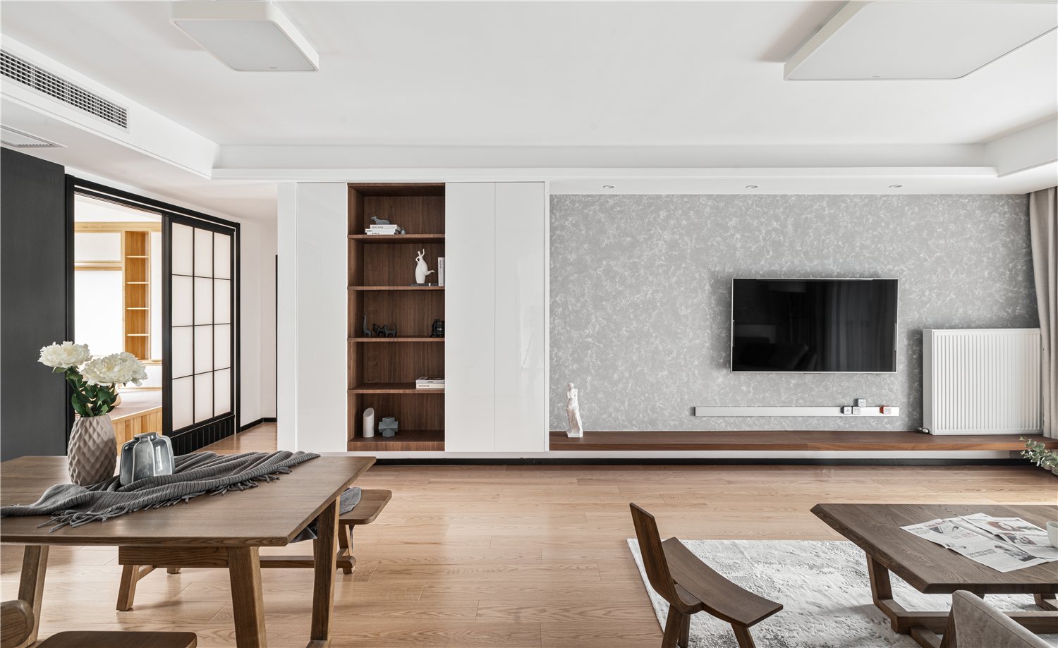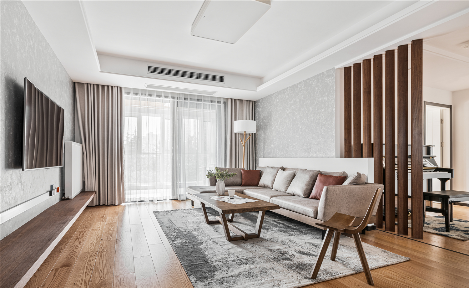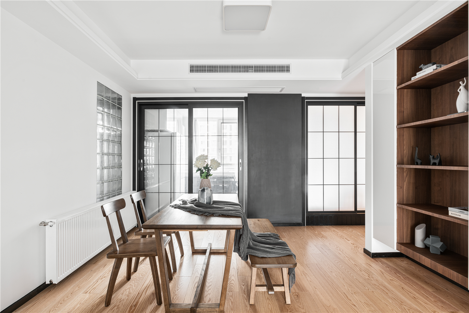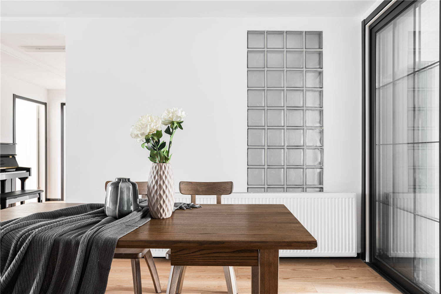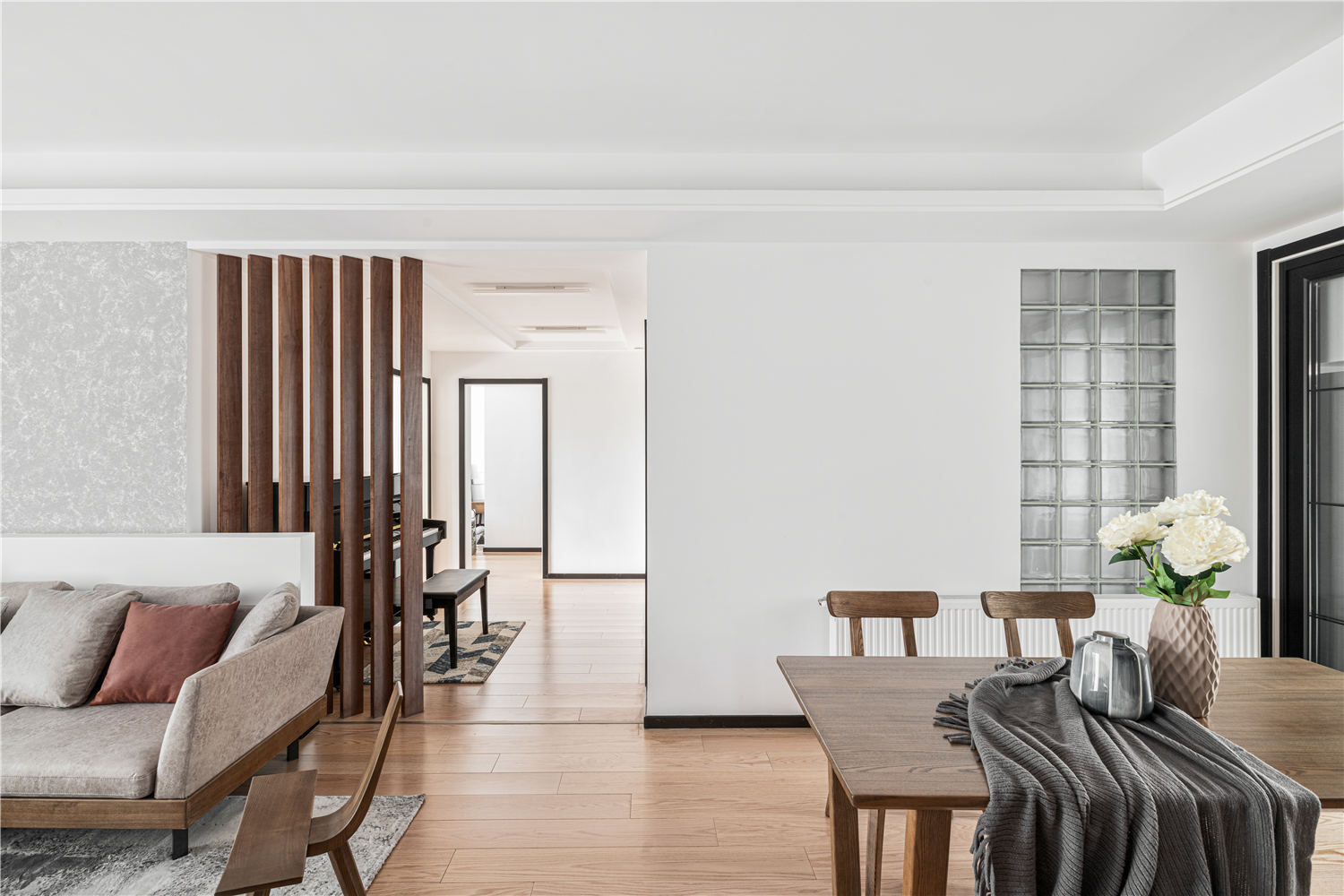 餐厅在过道处利用木质镂空隔断,做出钢琴区。若隐若现,不阻断采光,整体空间有分割却又和谐统一。餐厅与客厅相通,餐桌材质与客厅统一协调,质朴而有温度,朴素而不冷淡,细微而郑重的见证一家人相爱中的美好年华。