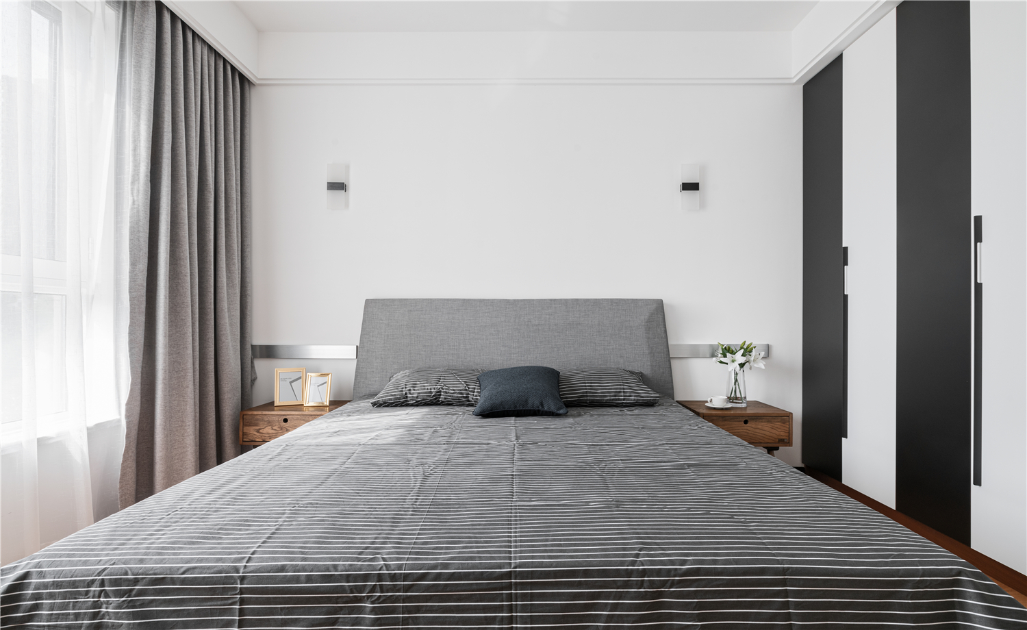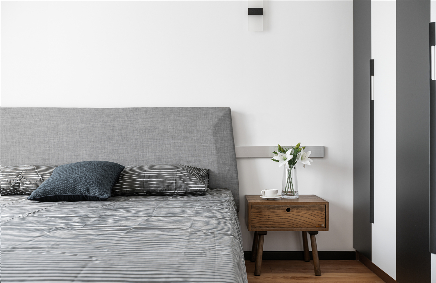 主卧延续客厅的风格,以木质铺陈营造温暖的休憩空间。演绎沉静的灰色为主色调,没有花花绿绿的干扰,清清爽爽还原生活本质。 -