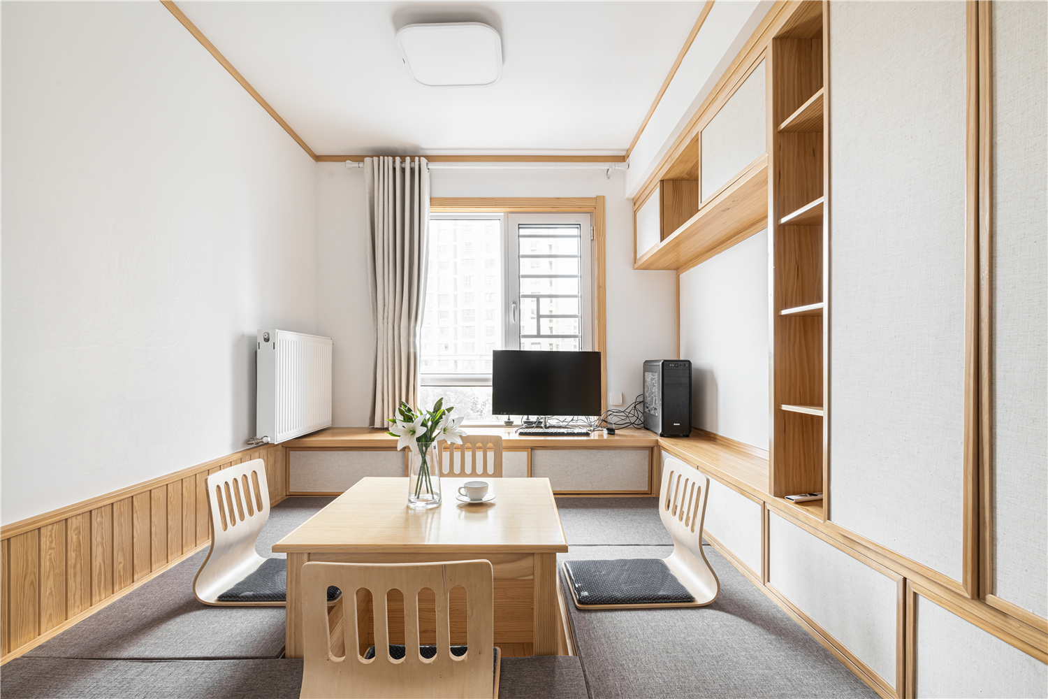 设计选材:书房采用日式榻榻米的形式,定制了大体量的柜体,兼顾收纳需求与空间弹性。