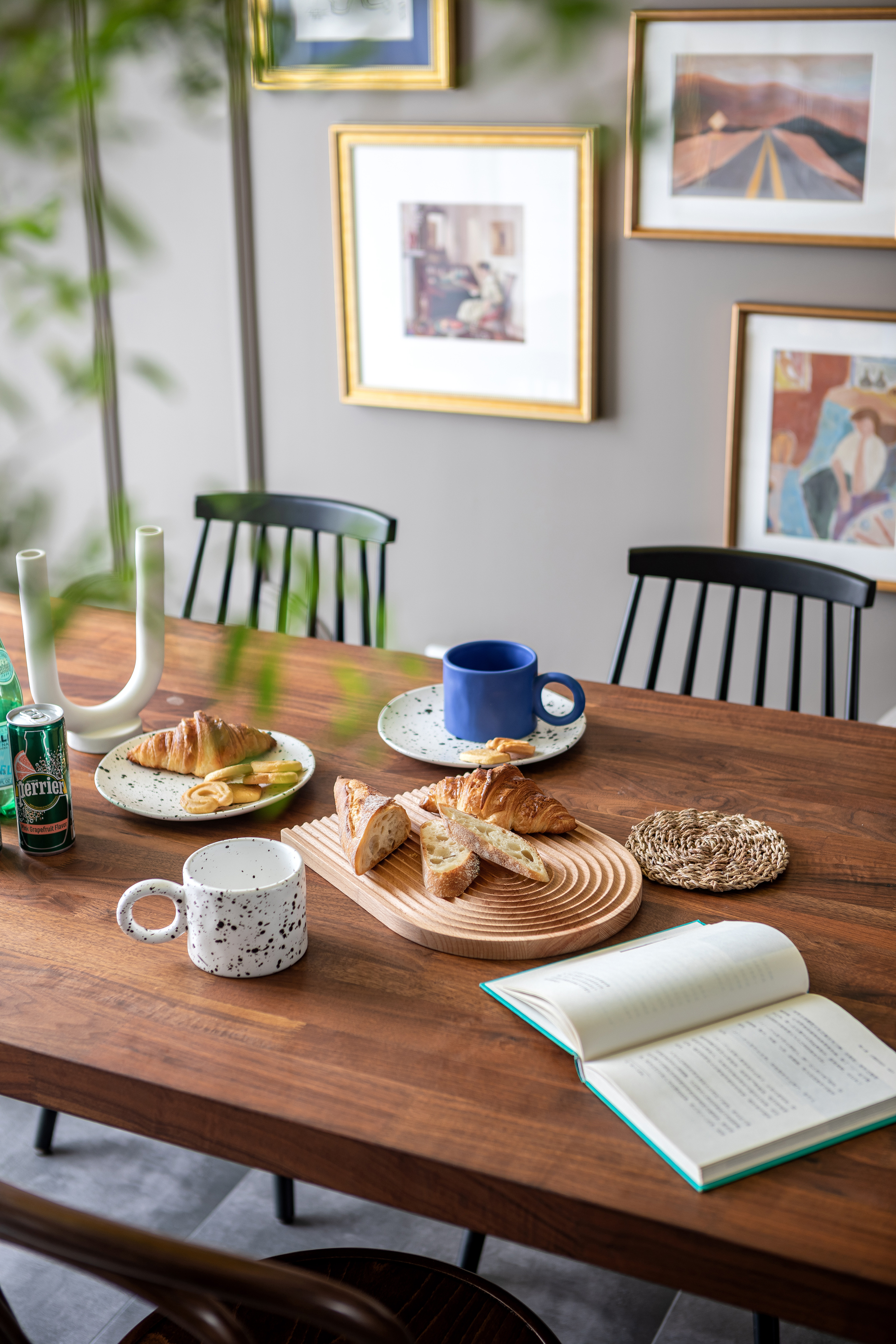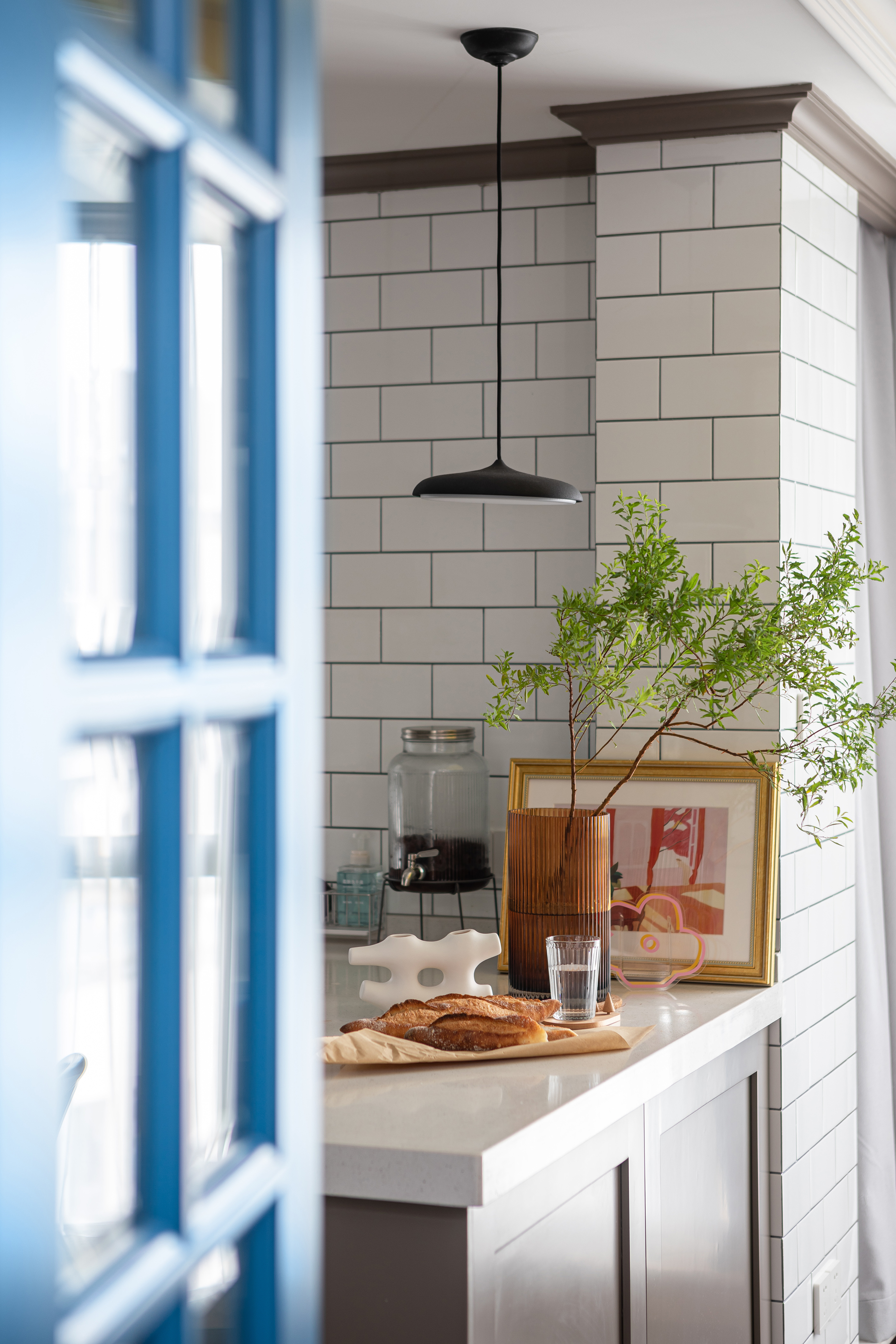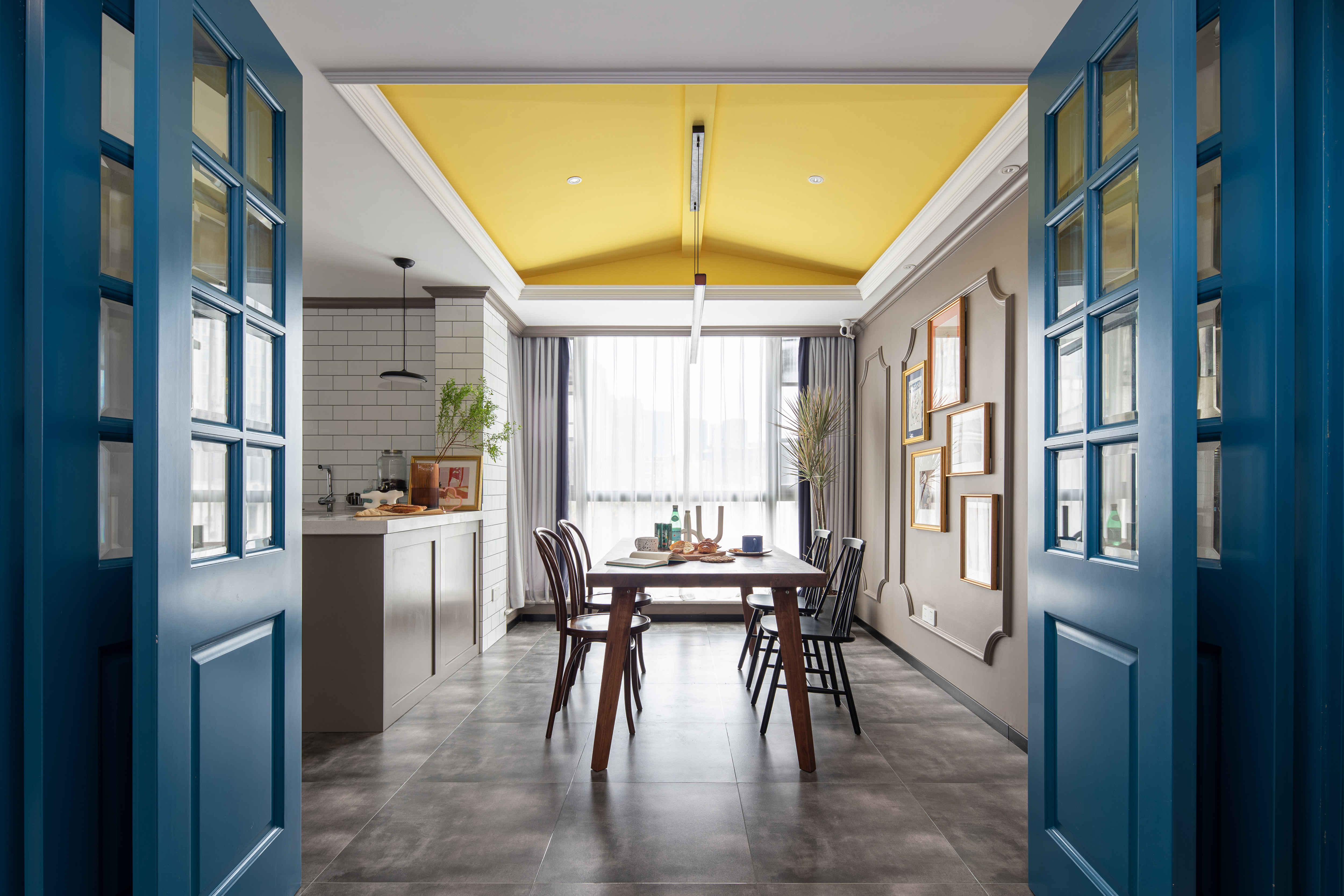 跳跃的色彩打造了一个轻快活泼的用餐空间,蓝色代表天马行空的想象力,黄色代表灵活的创意,吃一顿营养的早餐,为新的一天蓄上满满的元气。