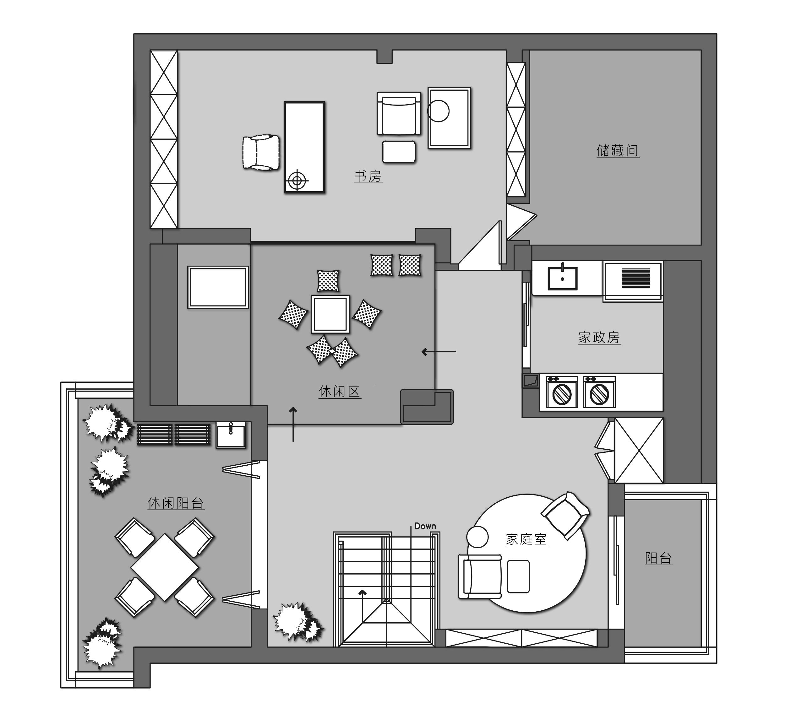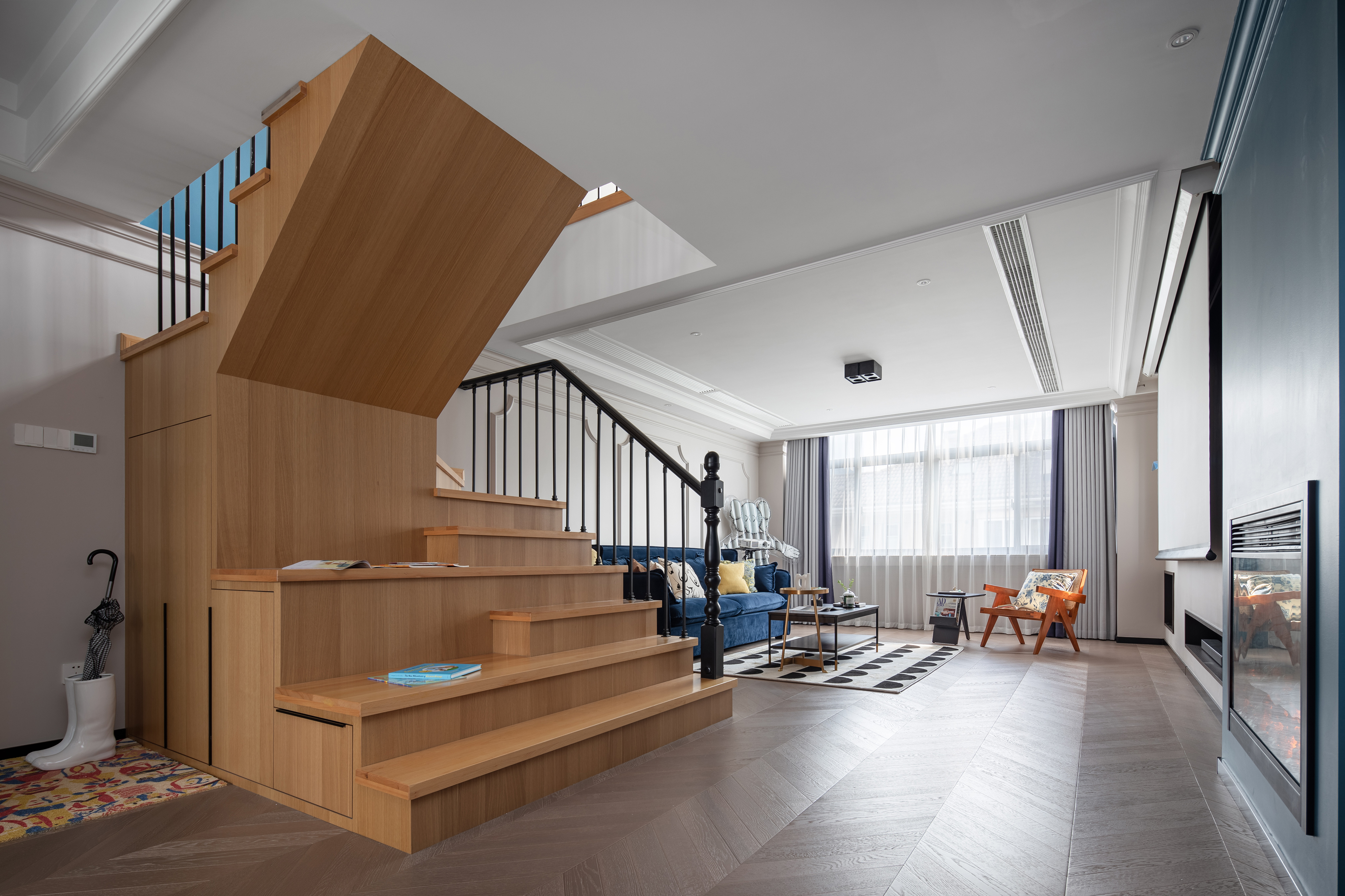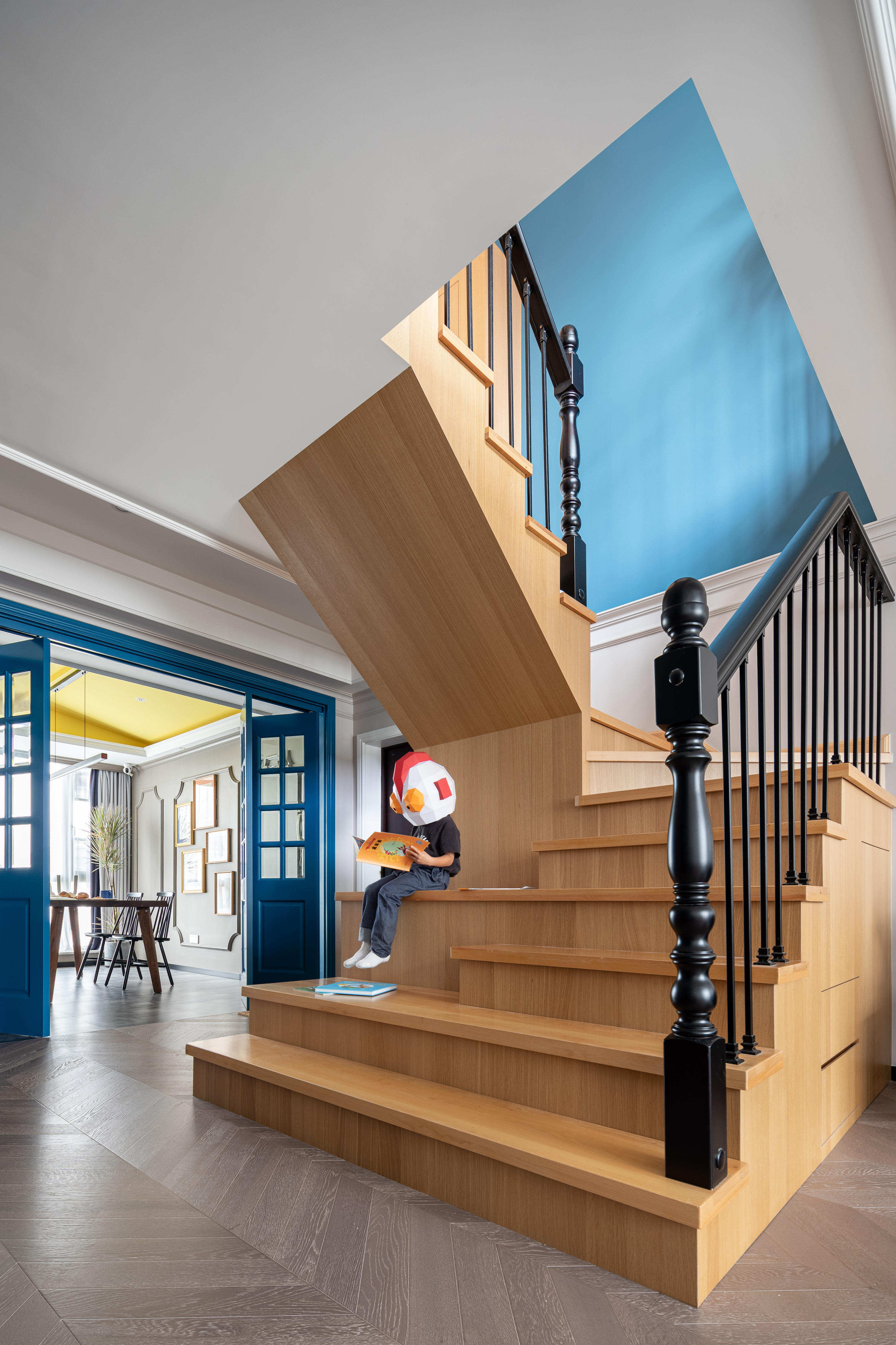 空间布局:尽可能的把空间格局敞开,让孩子无拘无束,在家里可以光着脚自由奔跑。楼梯作为整个空间的纽带,摆脱了常规的功能应用,通过高低不一的阶梯排布,创意的将这里打造成孩子阅读和玩耍的又一圣地。