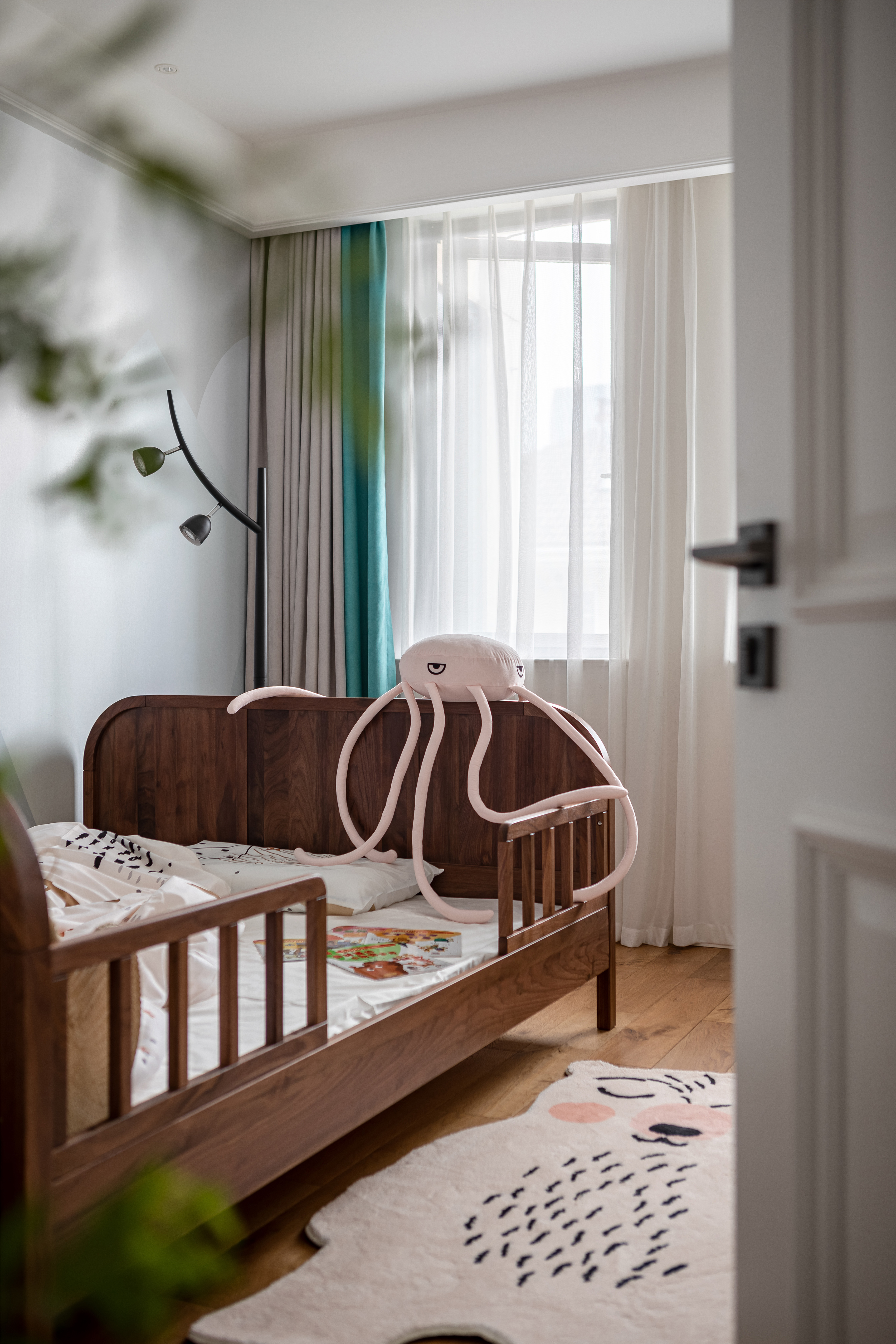 儿童房配置了浅色调的床品与装饰,绵软舒适。低矮的木床更加贴近孩子的生活习惯,床栏的包裹守护,尽显贴心与爱护。