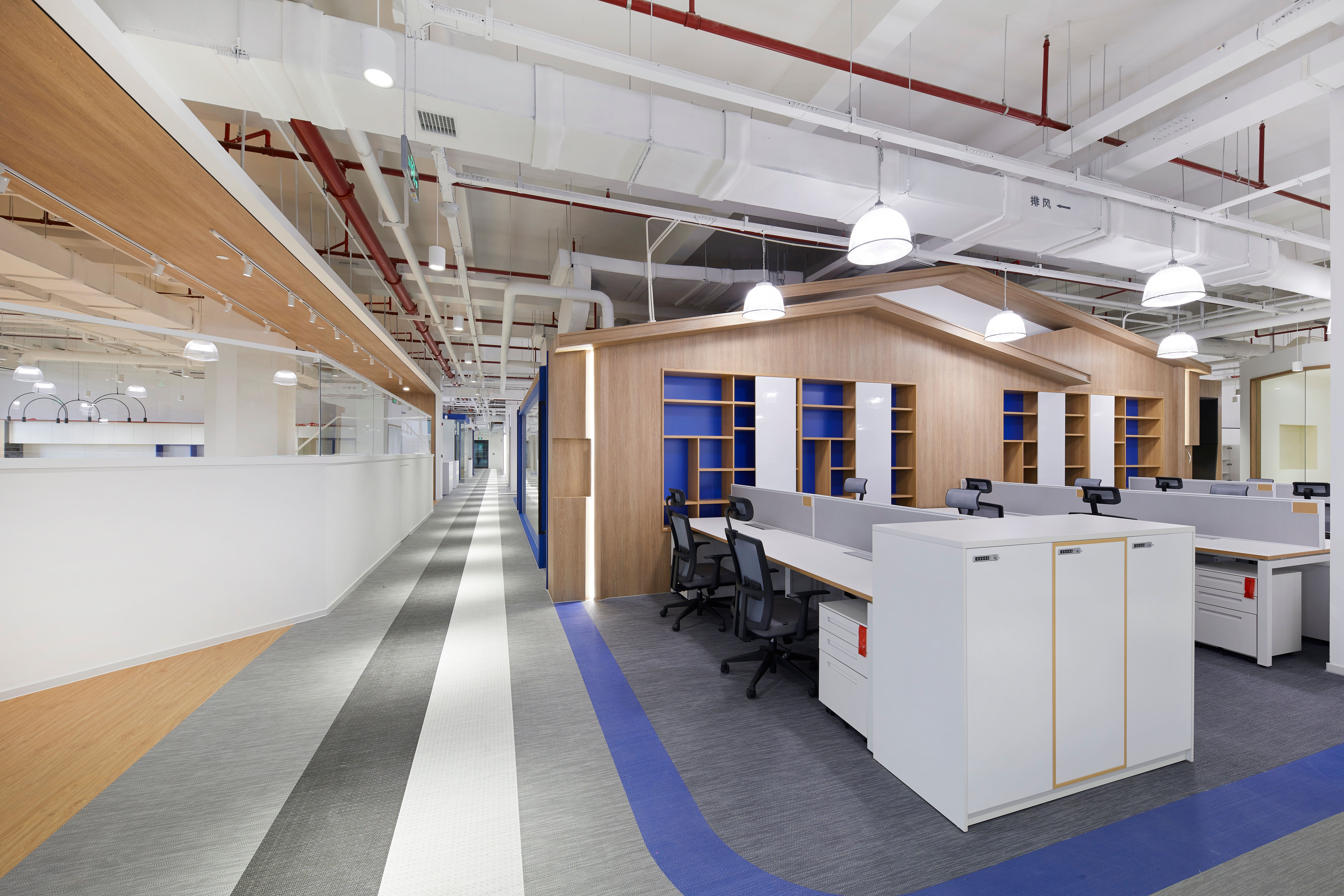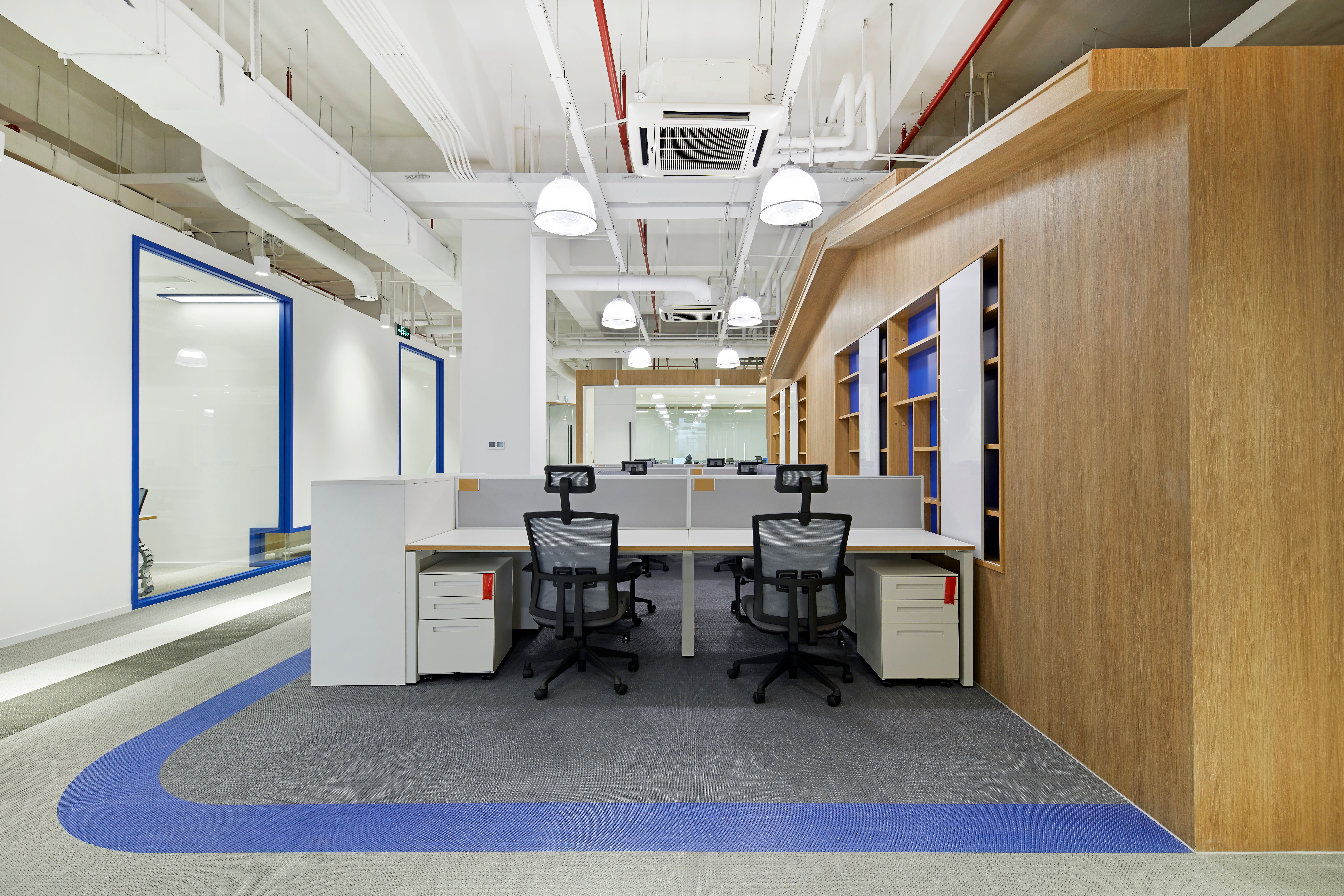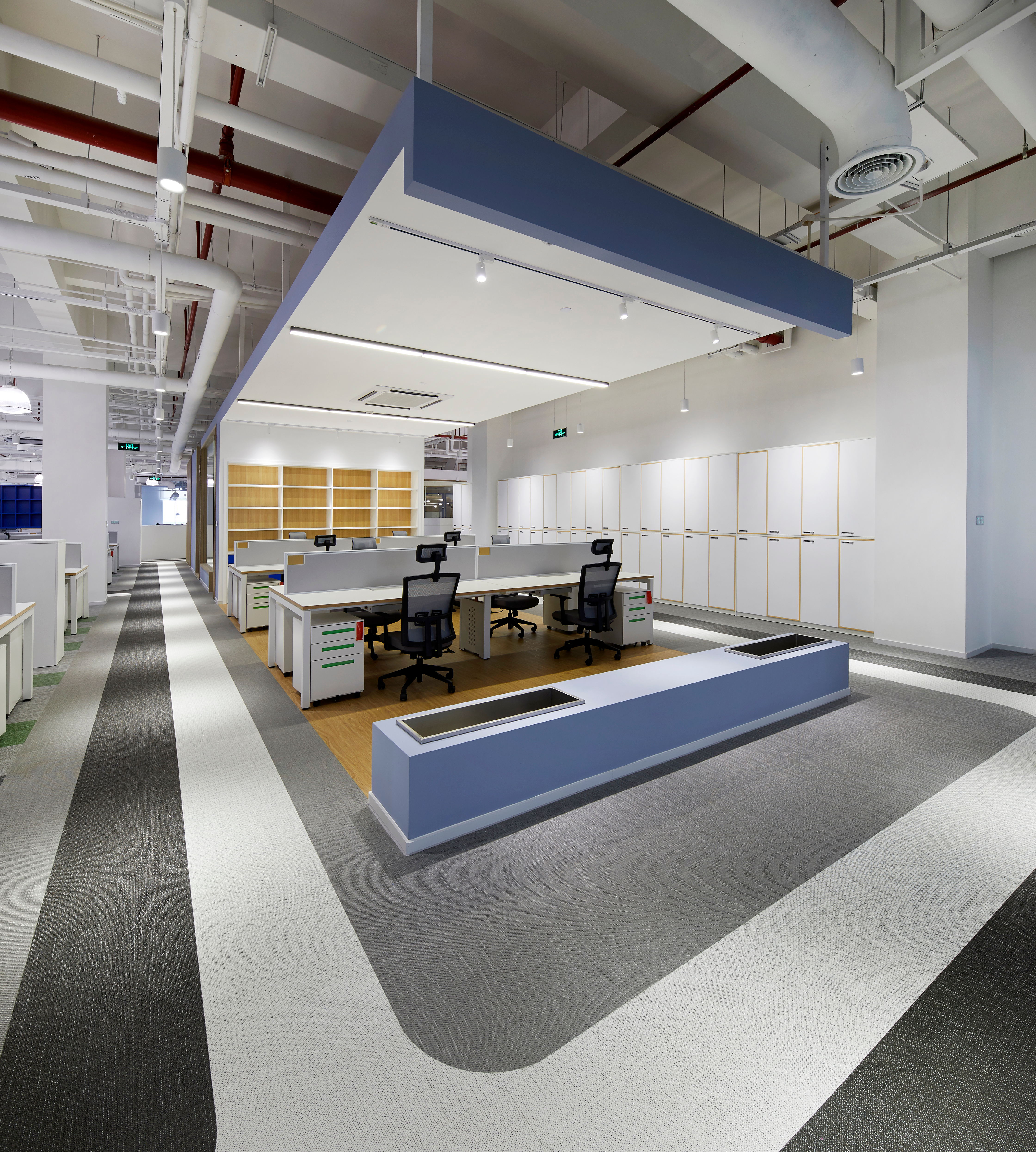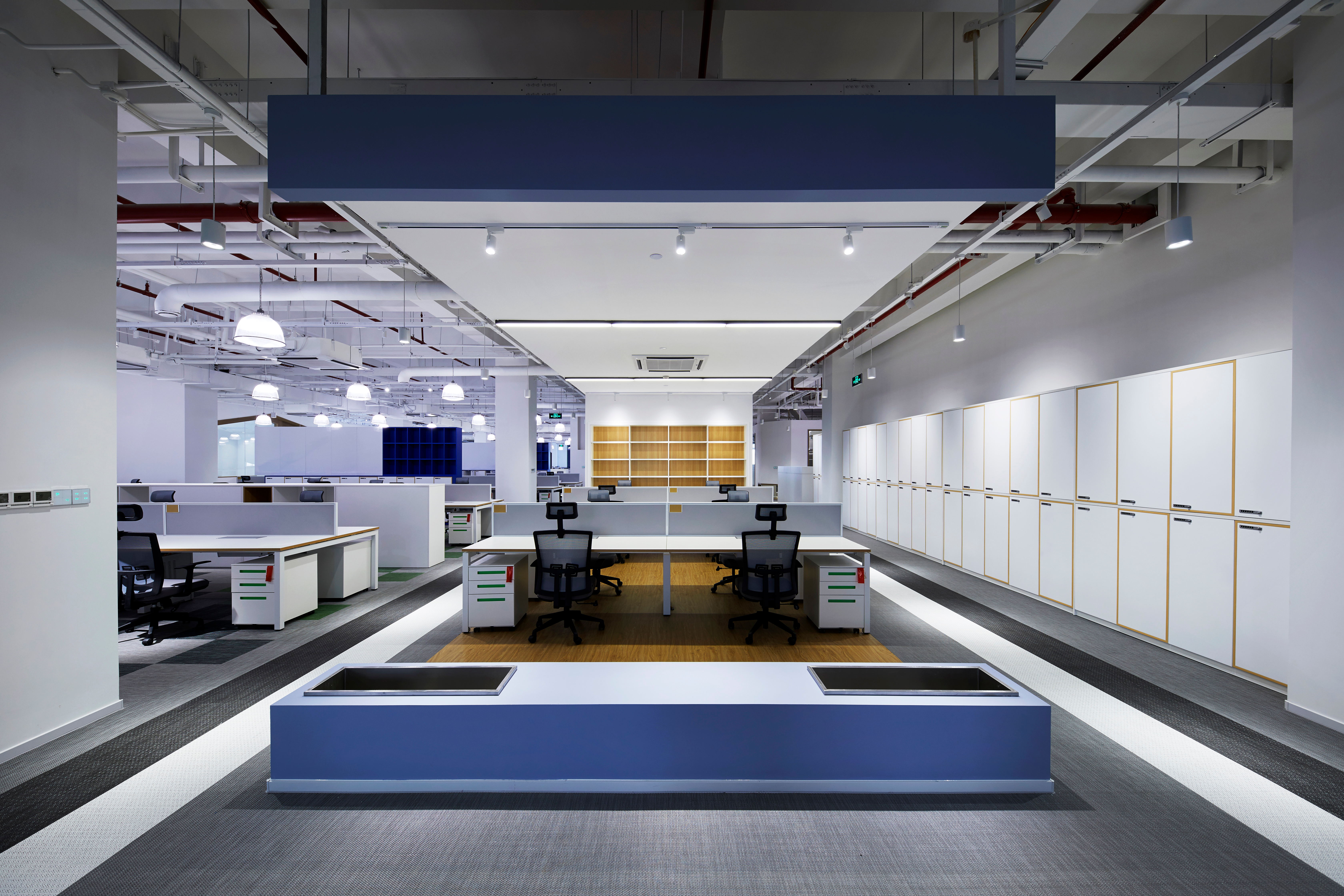 开放办公区1 在整体办公空间主色调为蓝灰色的基础上,穿插红色与绿色作为跳色,增添色彩丰富度外,还发挥区分部门属性的功能。