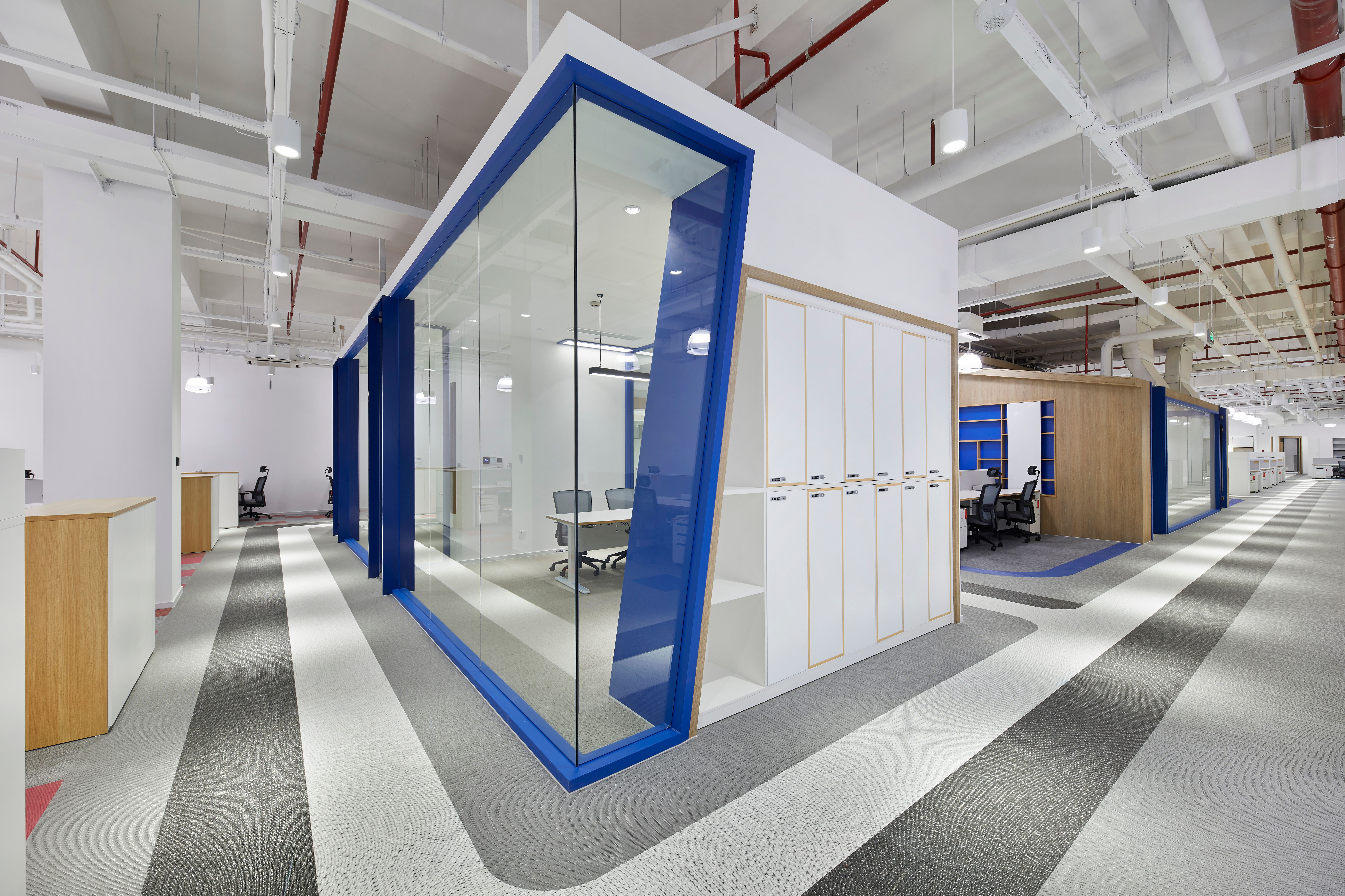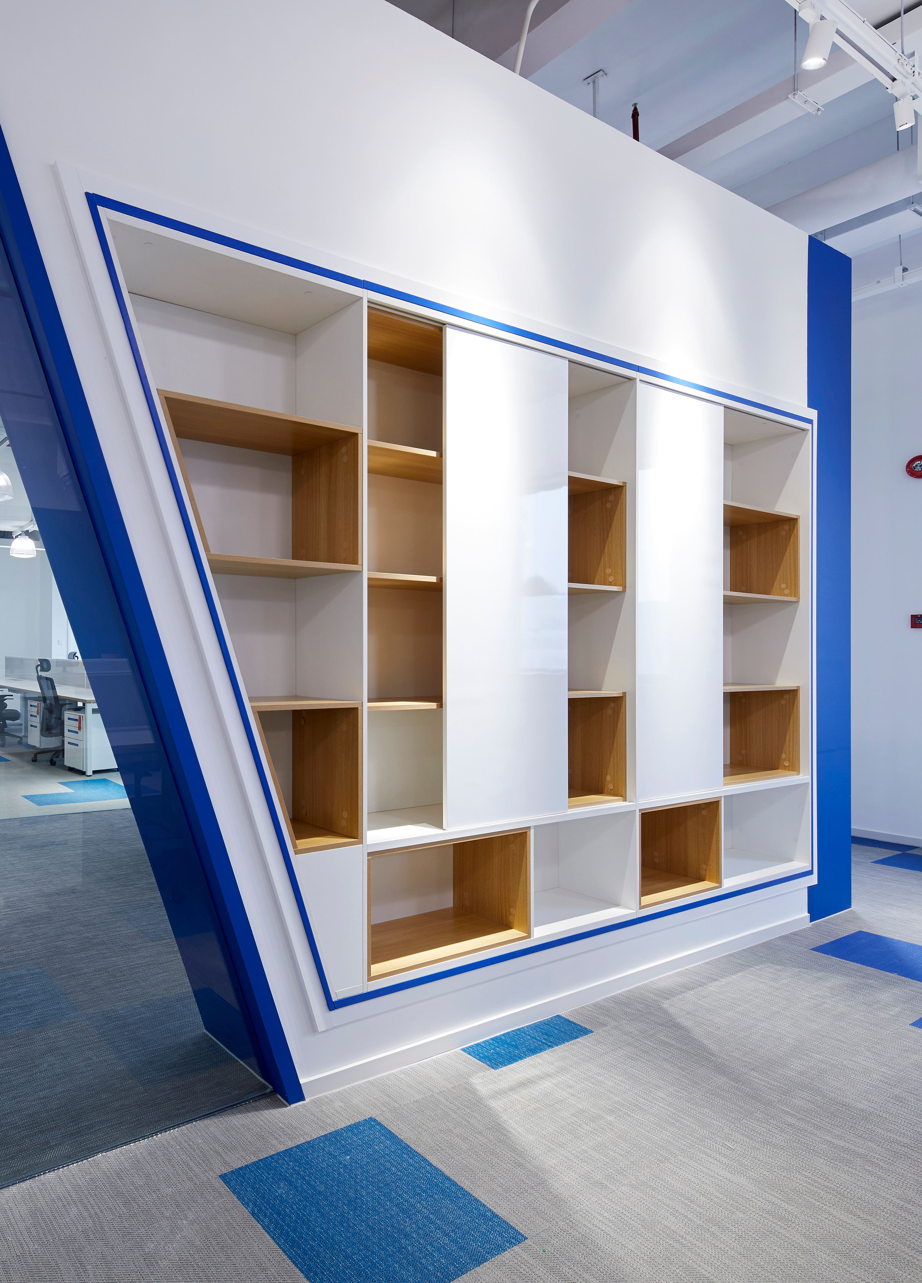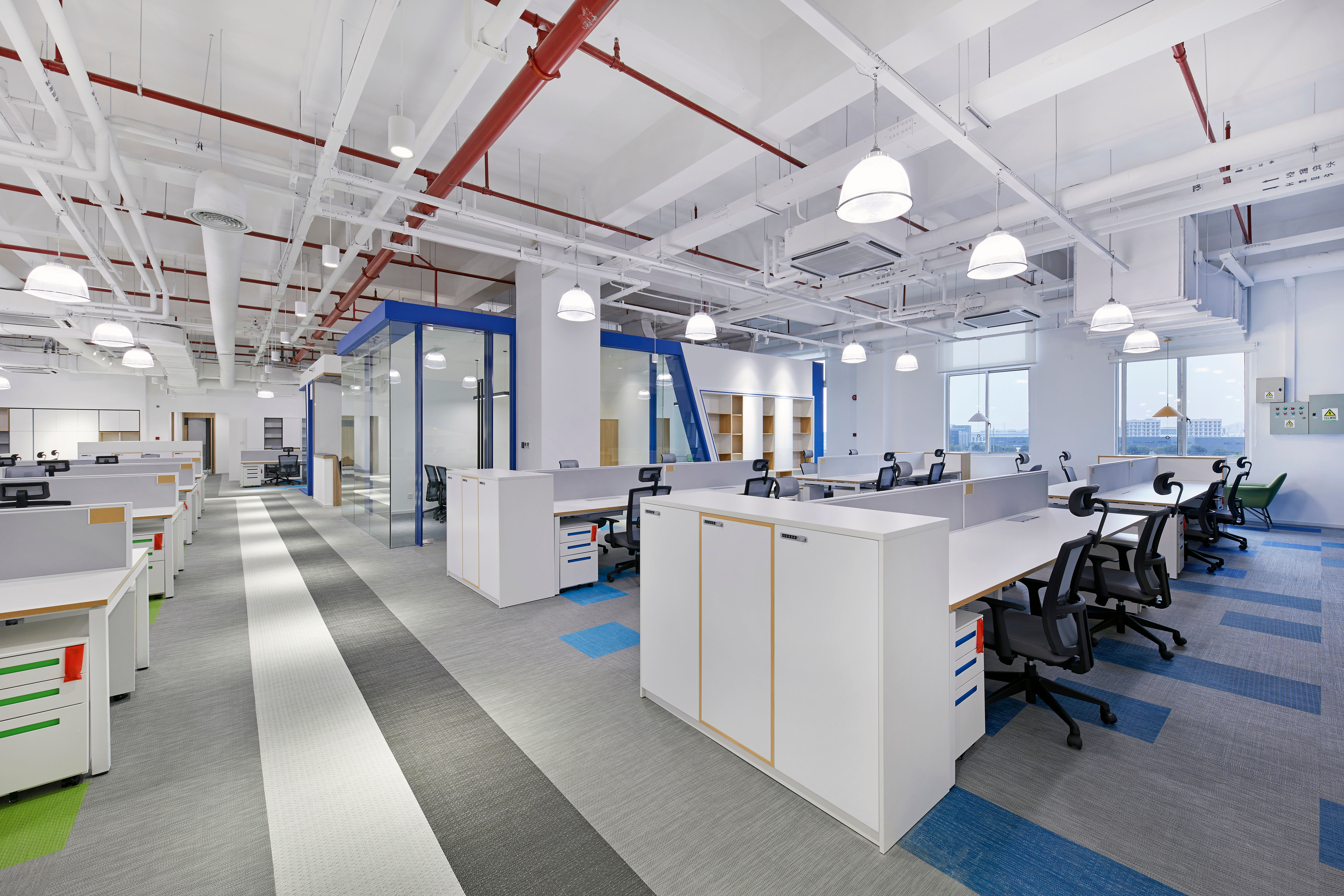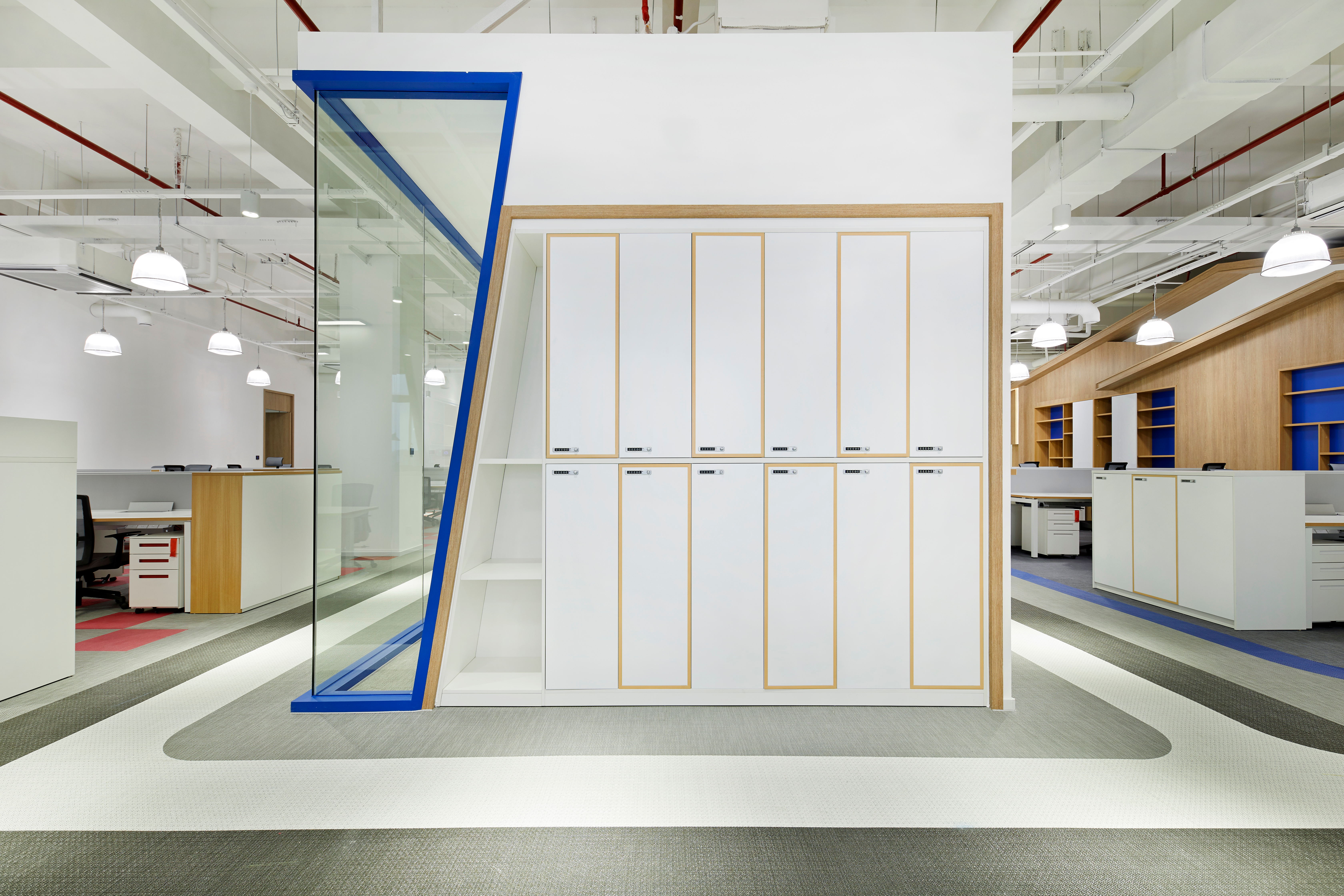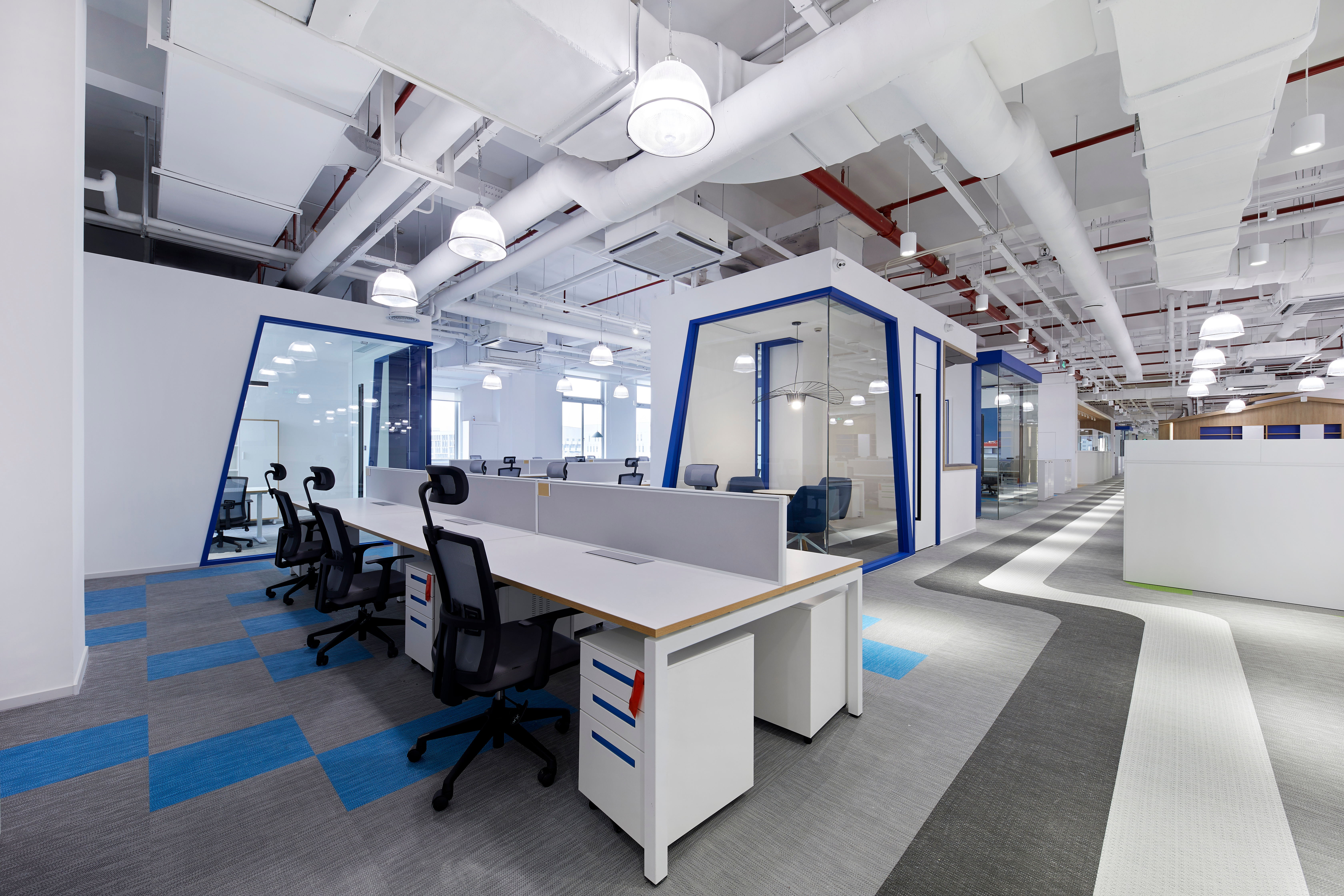 开放办公区1 在整体办公空间主色调为蓝灰色的基础上,穿插红色与绿色作为跳色,增添色彩丰富度外,还发挥区分部门属性的功能。