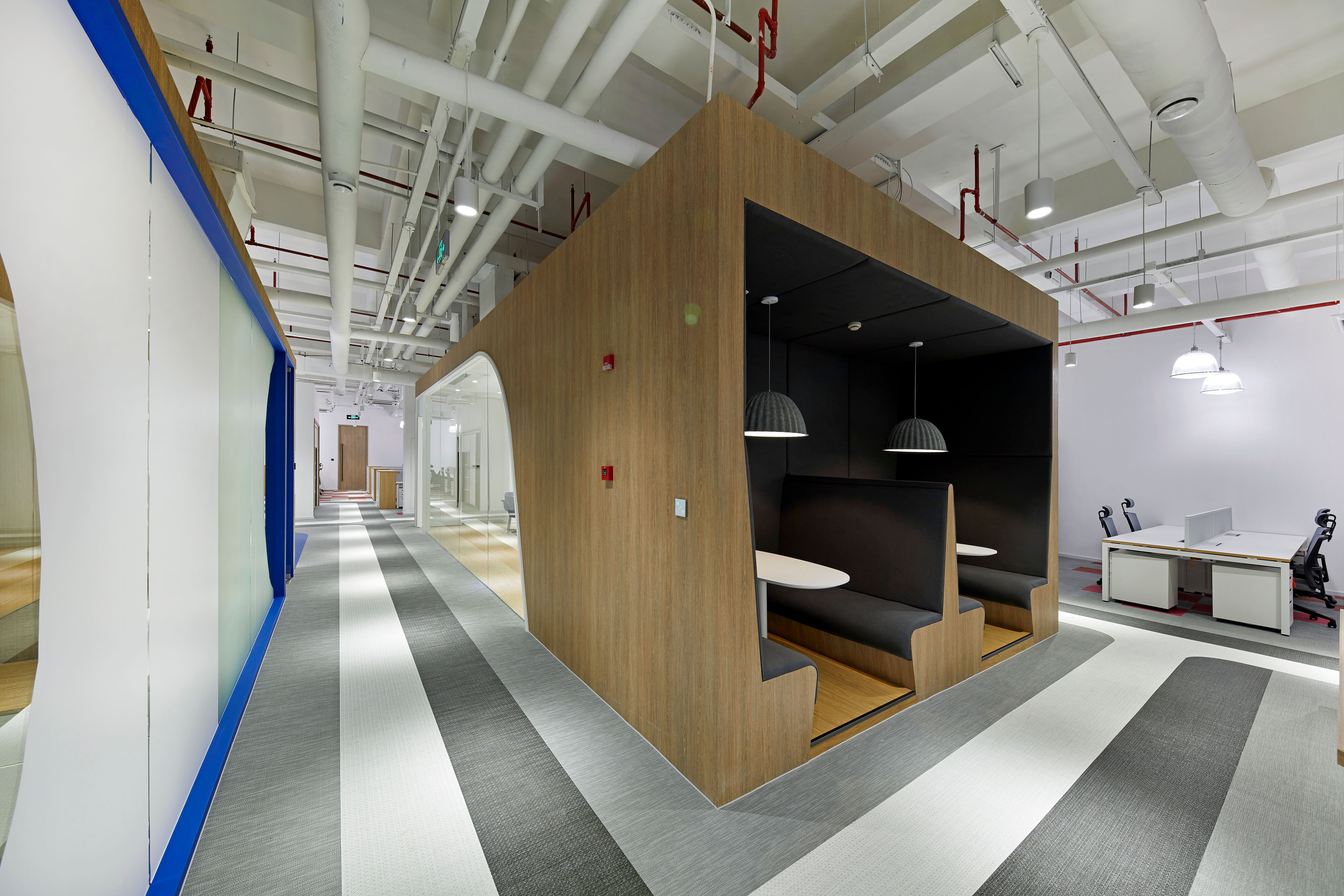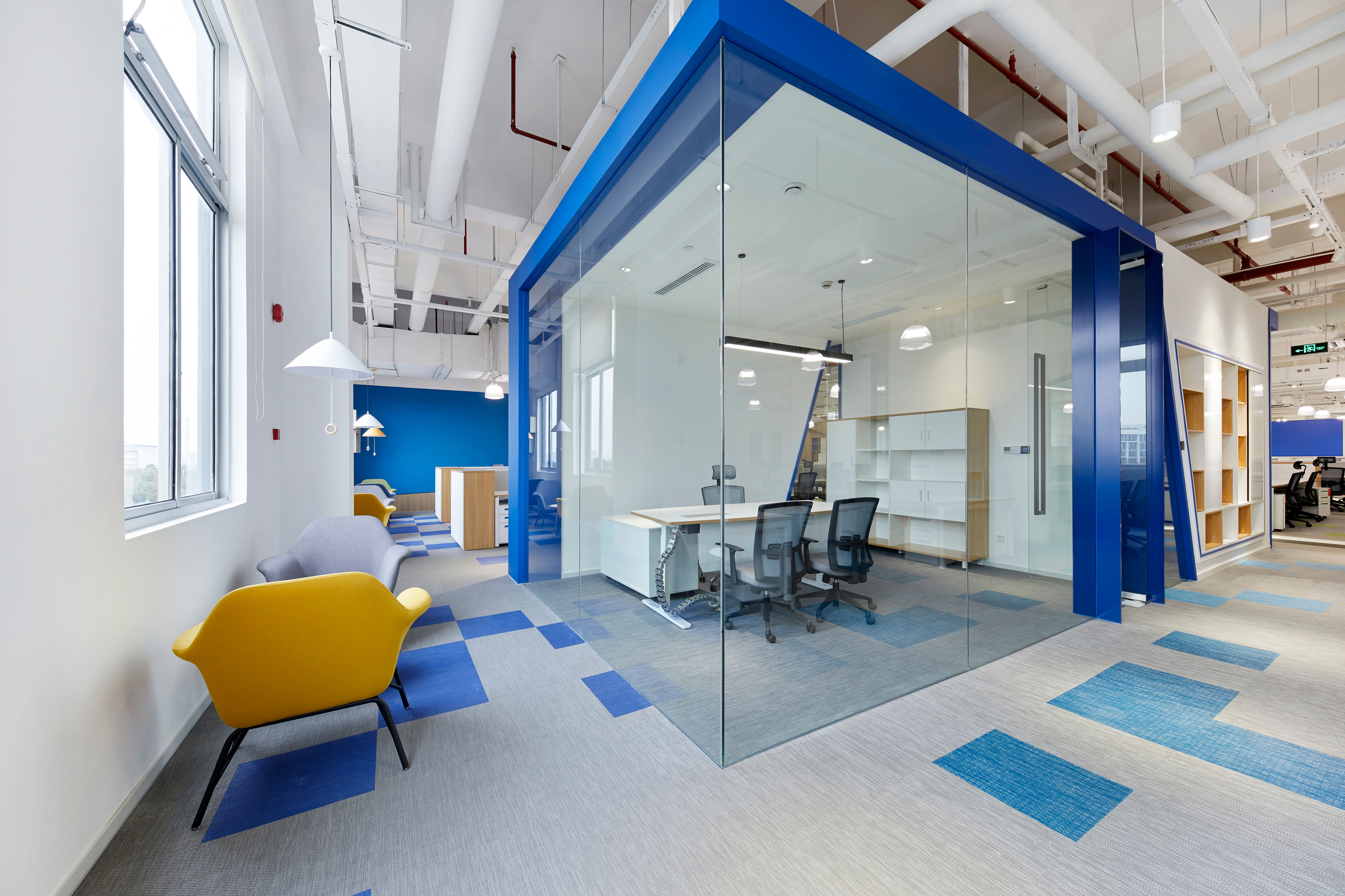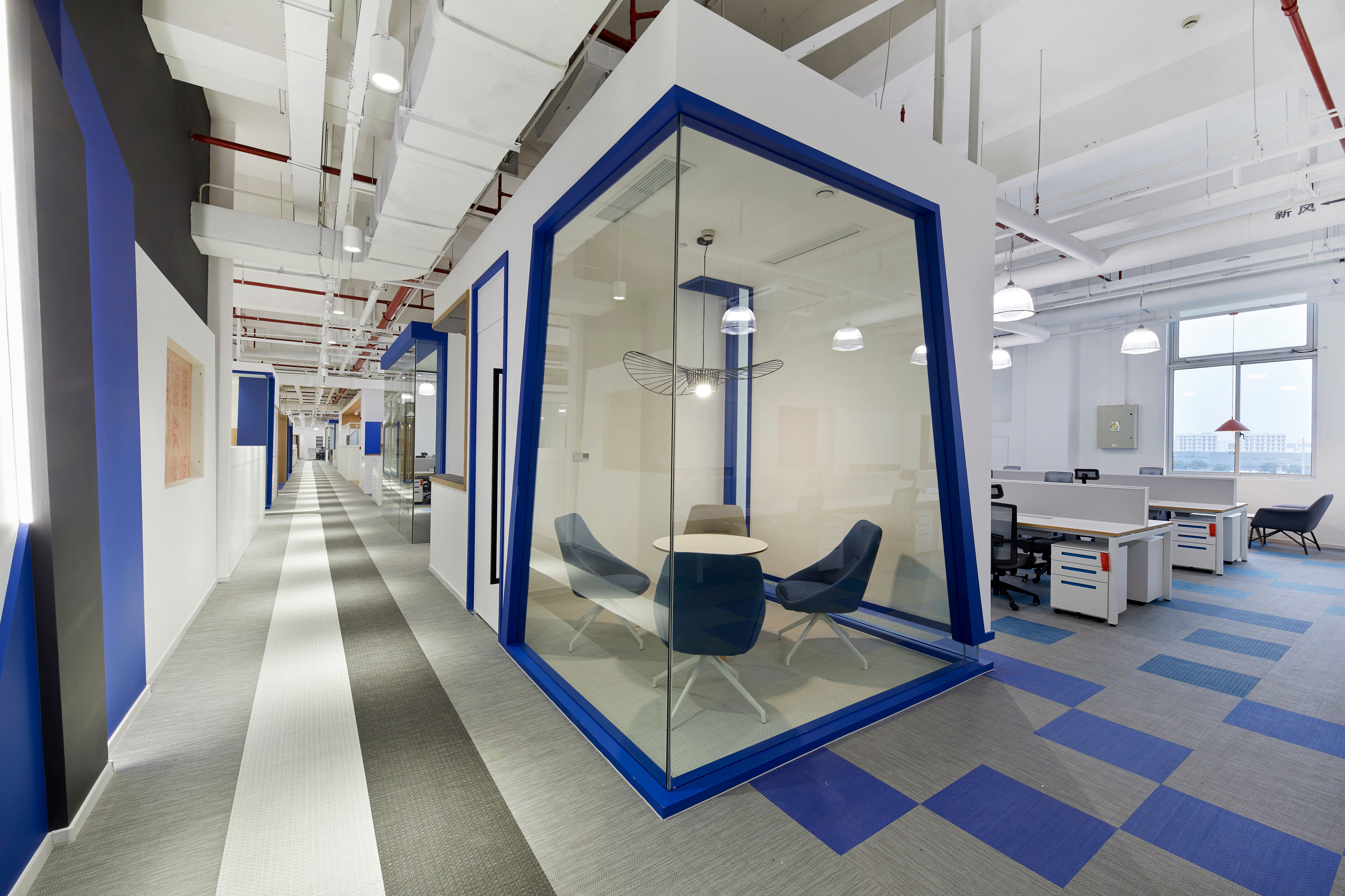 “房中房”独立办公室 “房中房”是本项目中的最大亮点之一,空间里造房子运用空间嵌套的设计构思。每一处独立的“房子”都是采用钢结构搭建而成,施工体量巨大,对施工团队的考验也十分严苛。