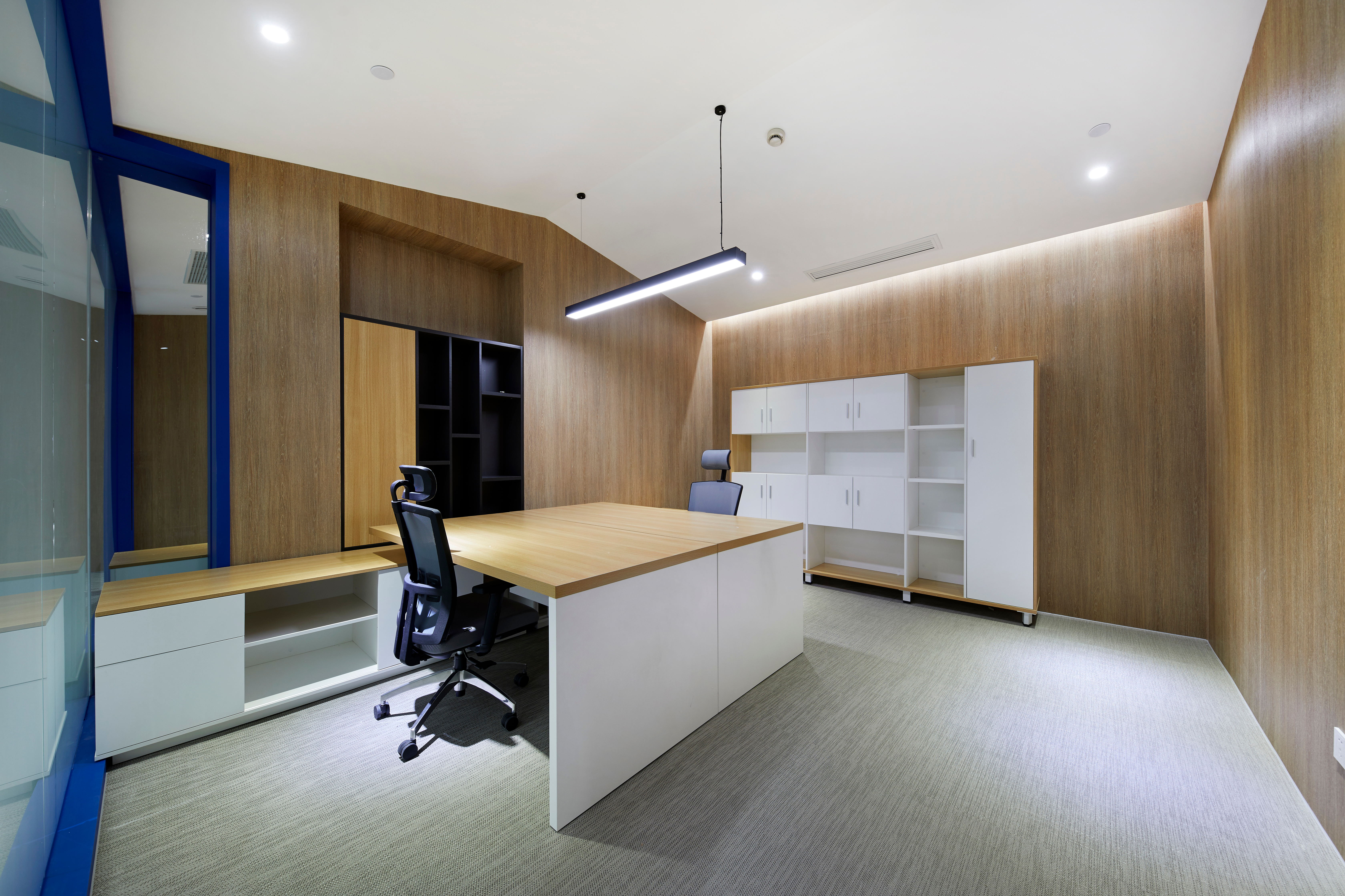空间意境:开放办公区出于整体模块的中心区域,周边辐射各个功能区、会议室、经理办公室等区域。经理室采用现代简约风,干练的视觉感官以此来契合研发机构的快捷与高效。