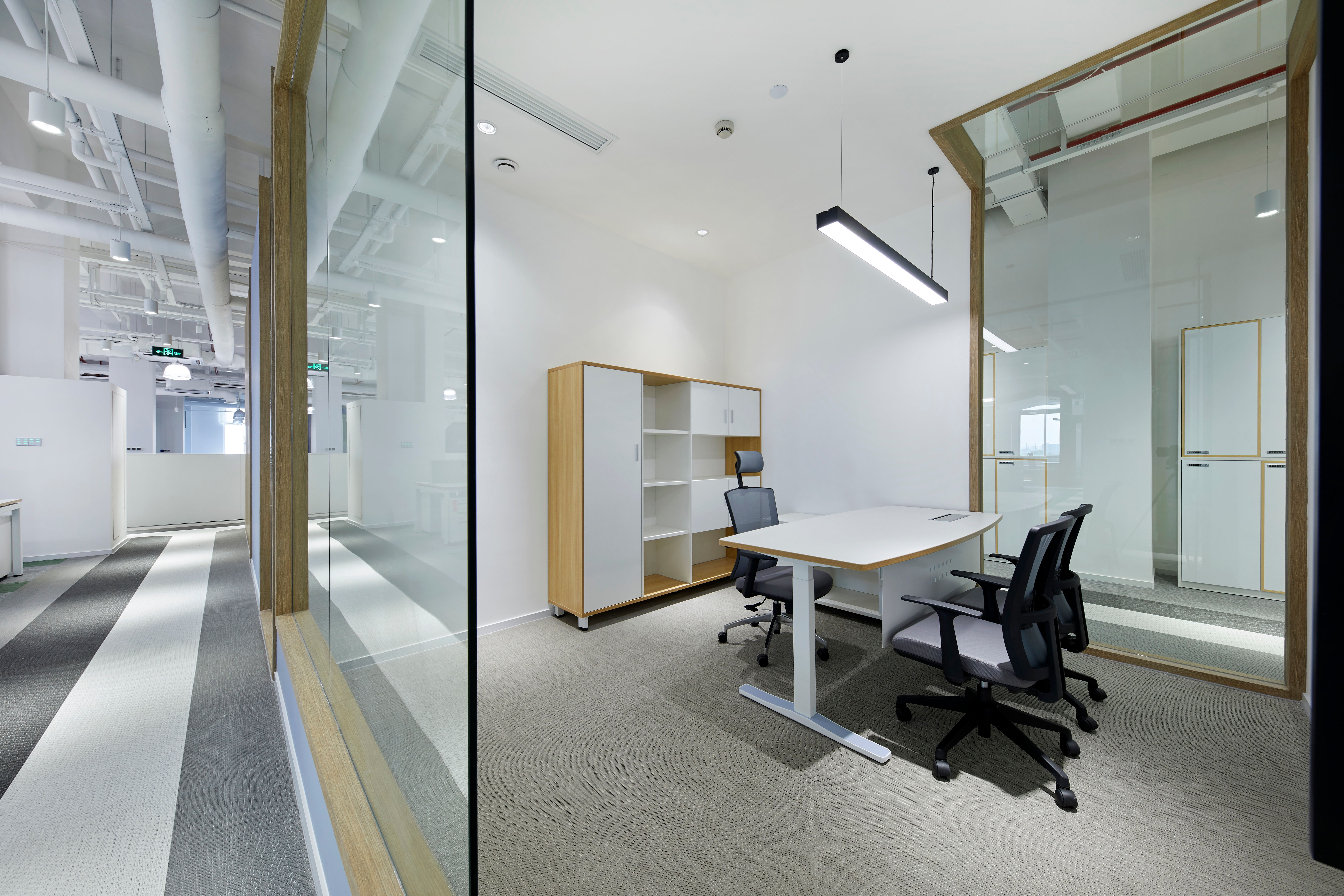 经理室1 开放办公区出于整体模块的中心区域,周边辐射各个功能区、会议室、经理办公室等区域。经理室采用现代简约风,干练的视觉感官以此来契合研发机构的快捷与高效。