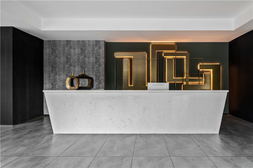 设计选材:中岛台以建筑的手法出现,交扣组构,