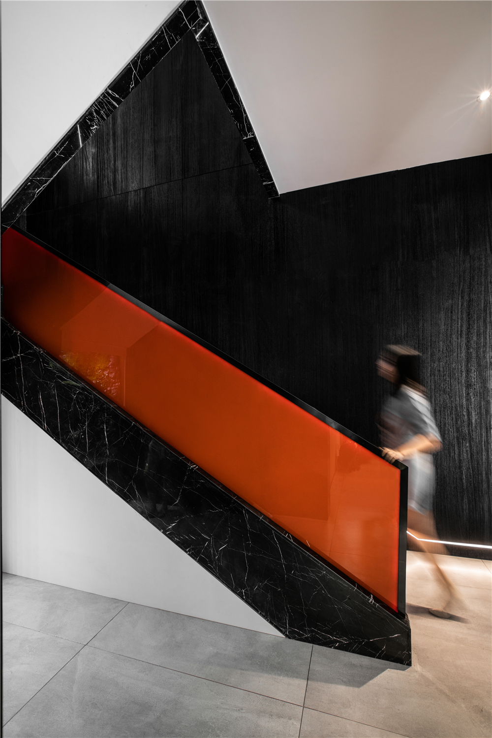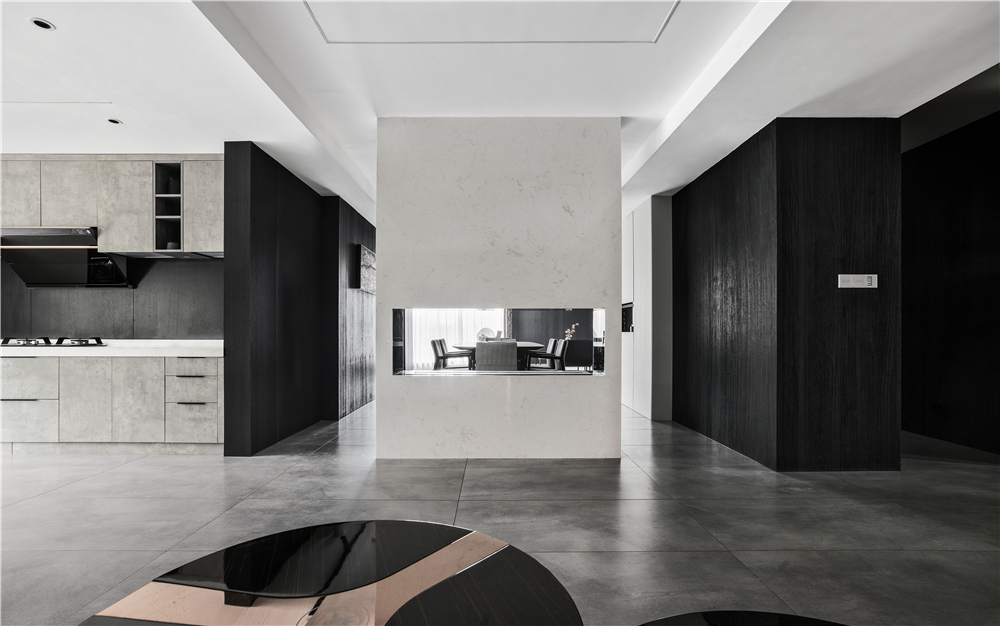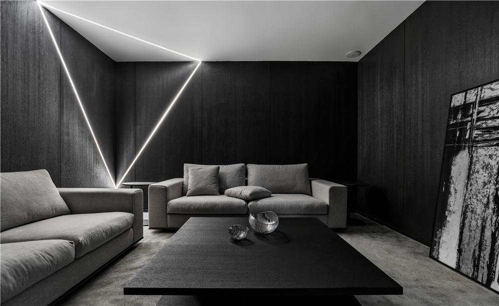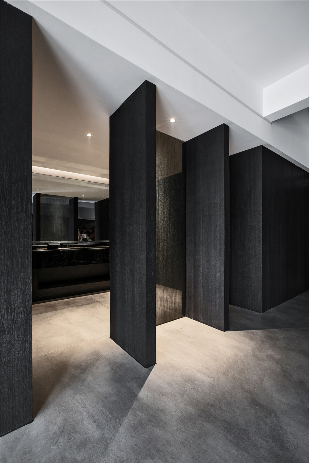 空间布局:整体空间以直线线条,白色,黑色建筑体块,