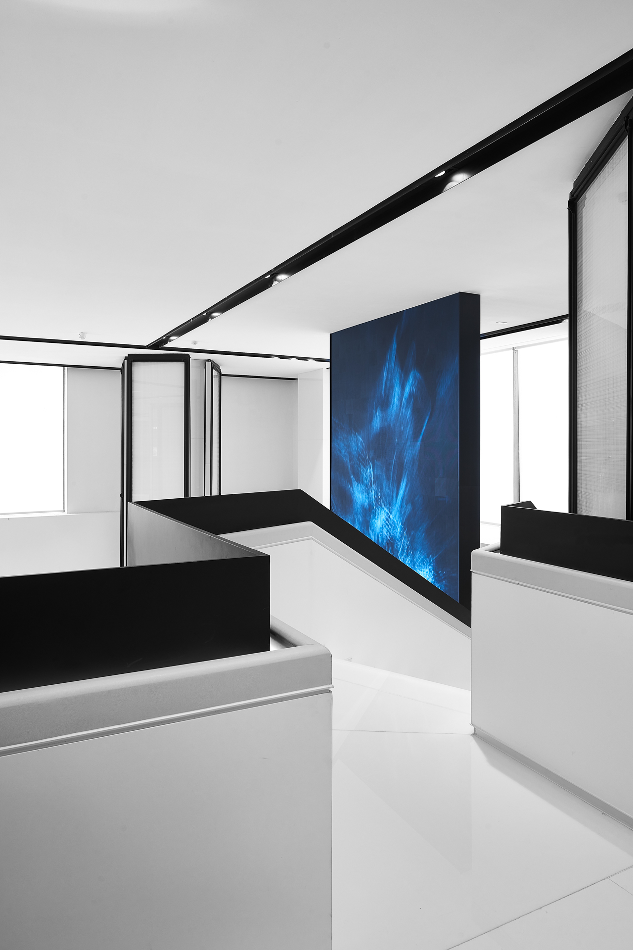 空间布局:作为一个很规整的长方形空间,我们做了阵列式的屏风以增加空间的层次感,在空间处理手法上我们采用线与面的组合。两点形成一线,一线形成一面,而一个空间即是有若干个面构成,在白色背景下的黑色线条也使空间更加立体。