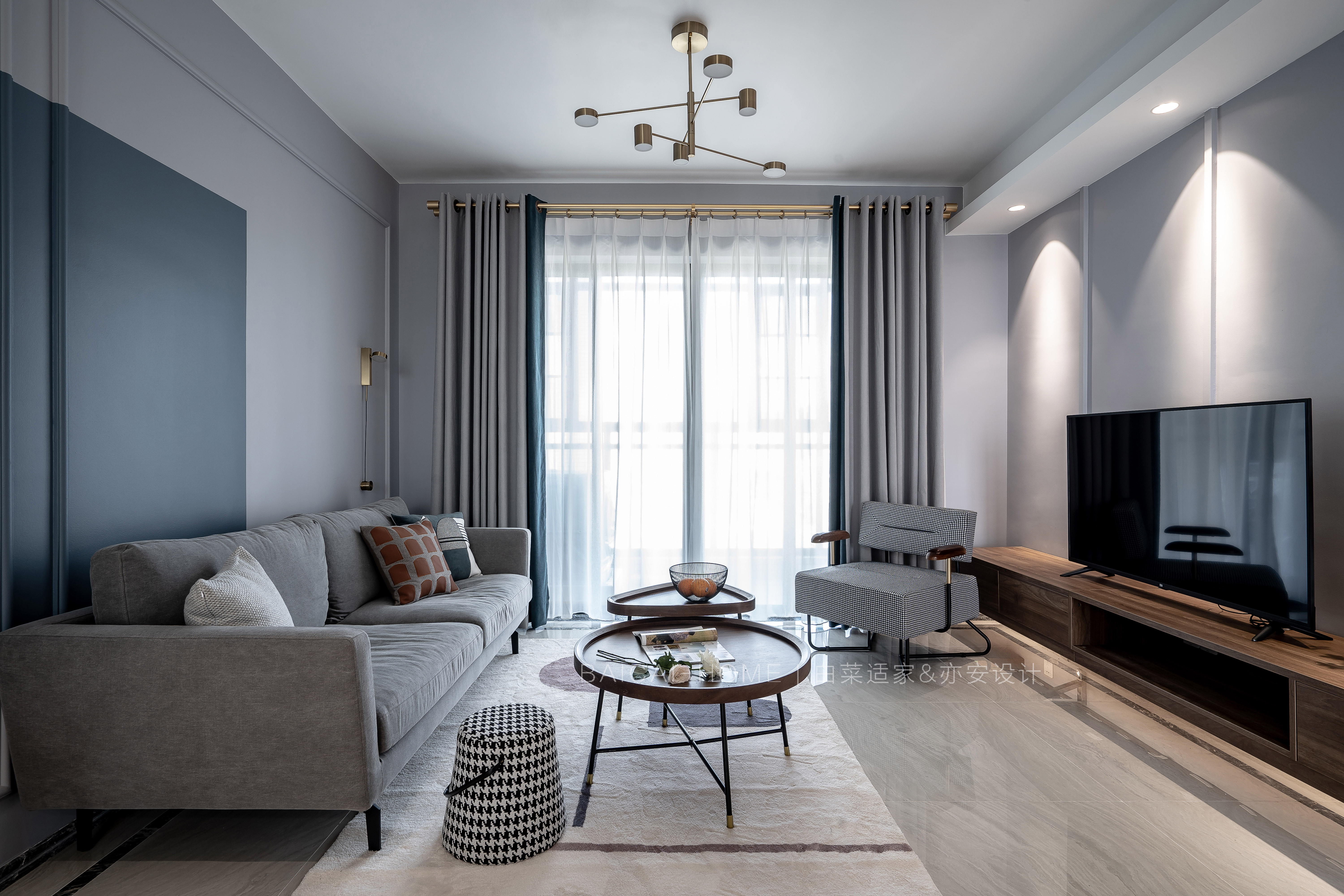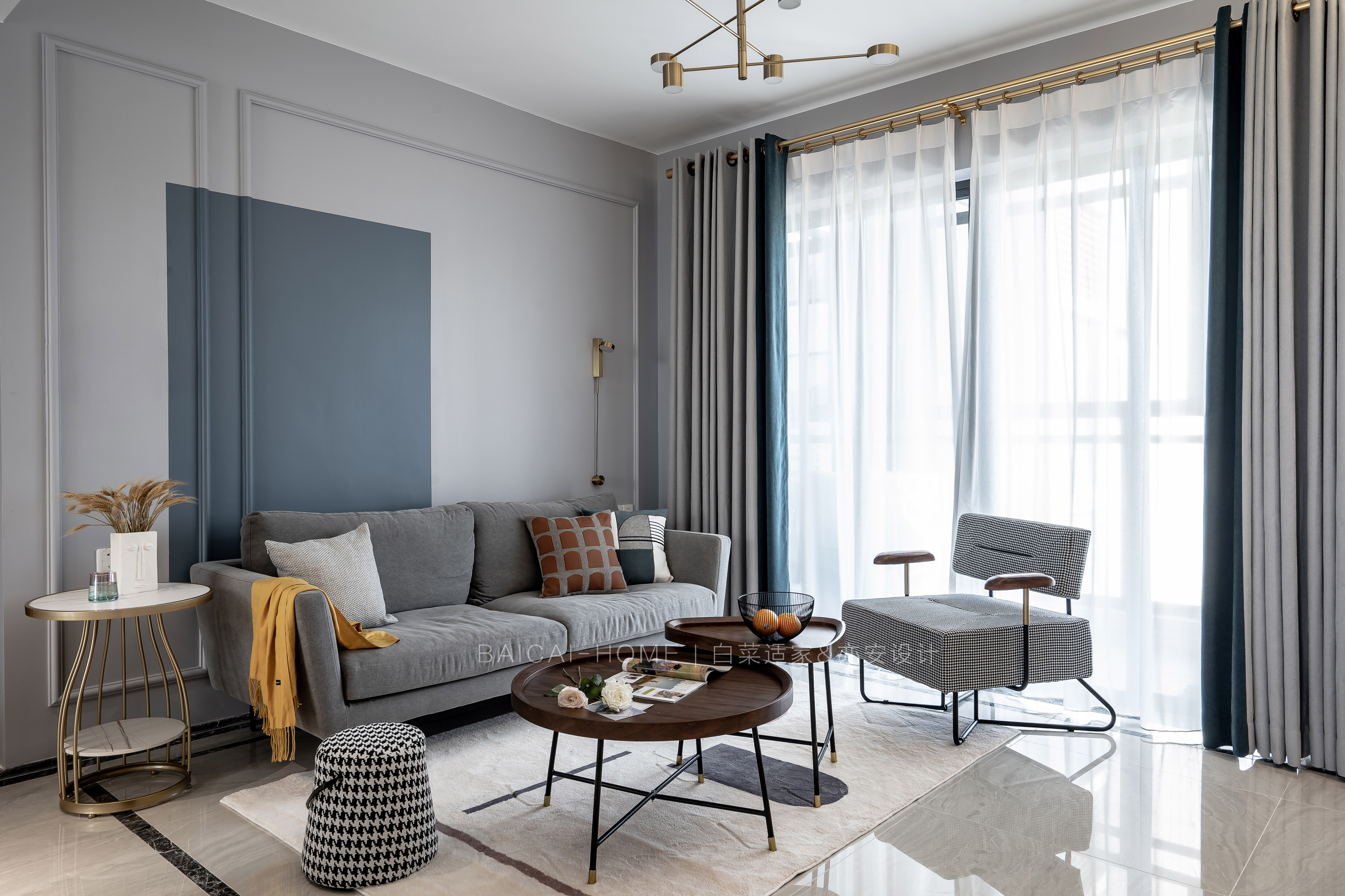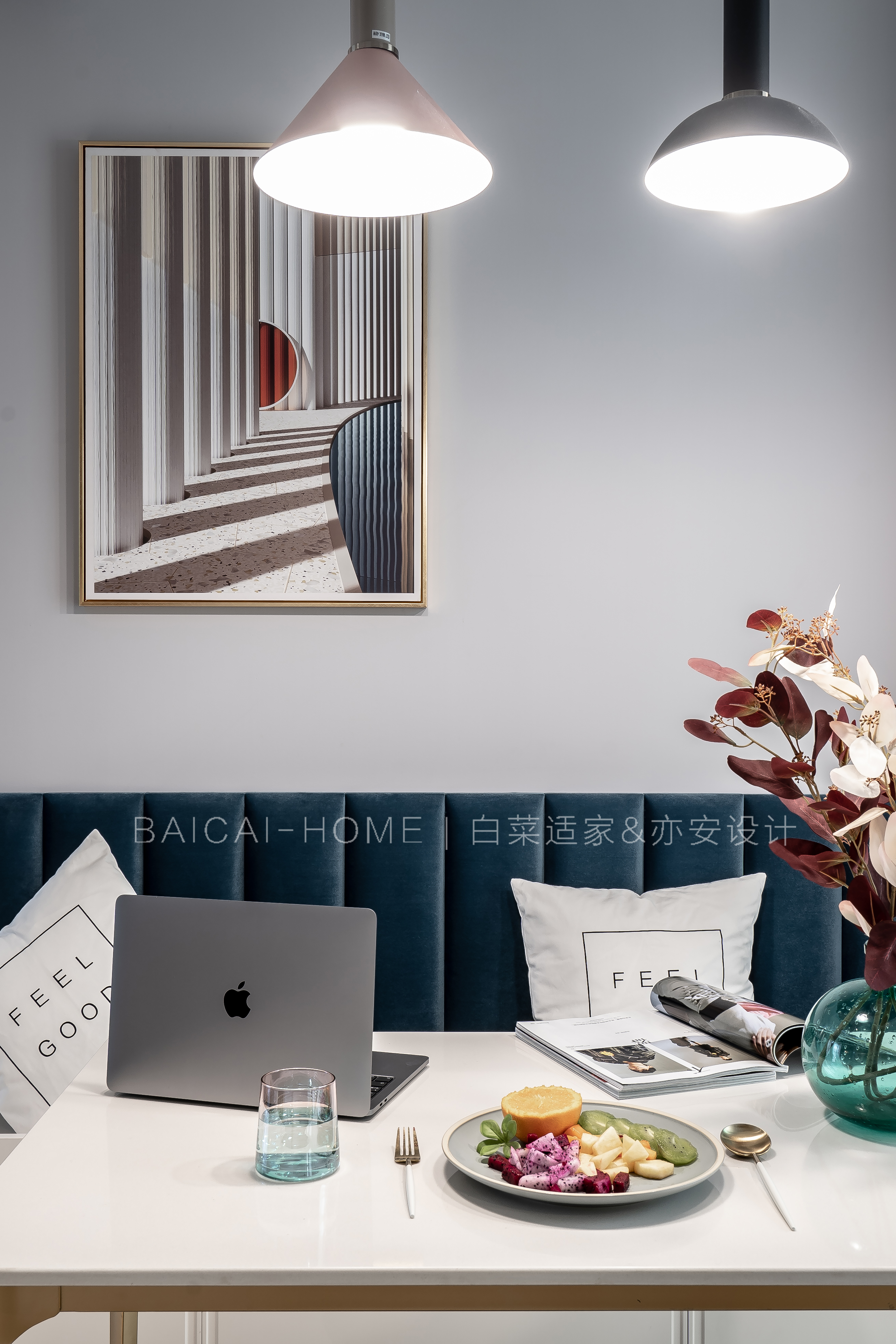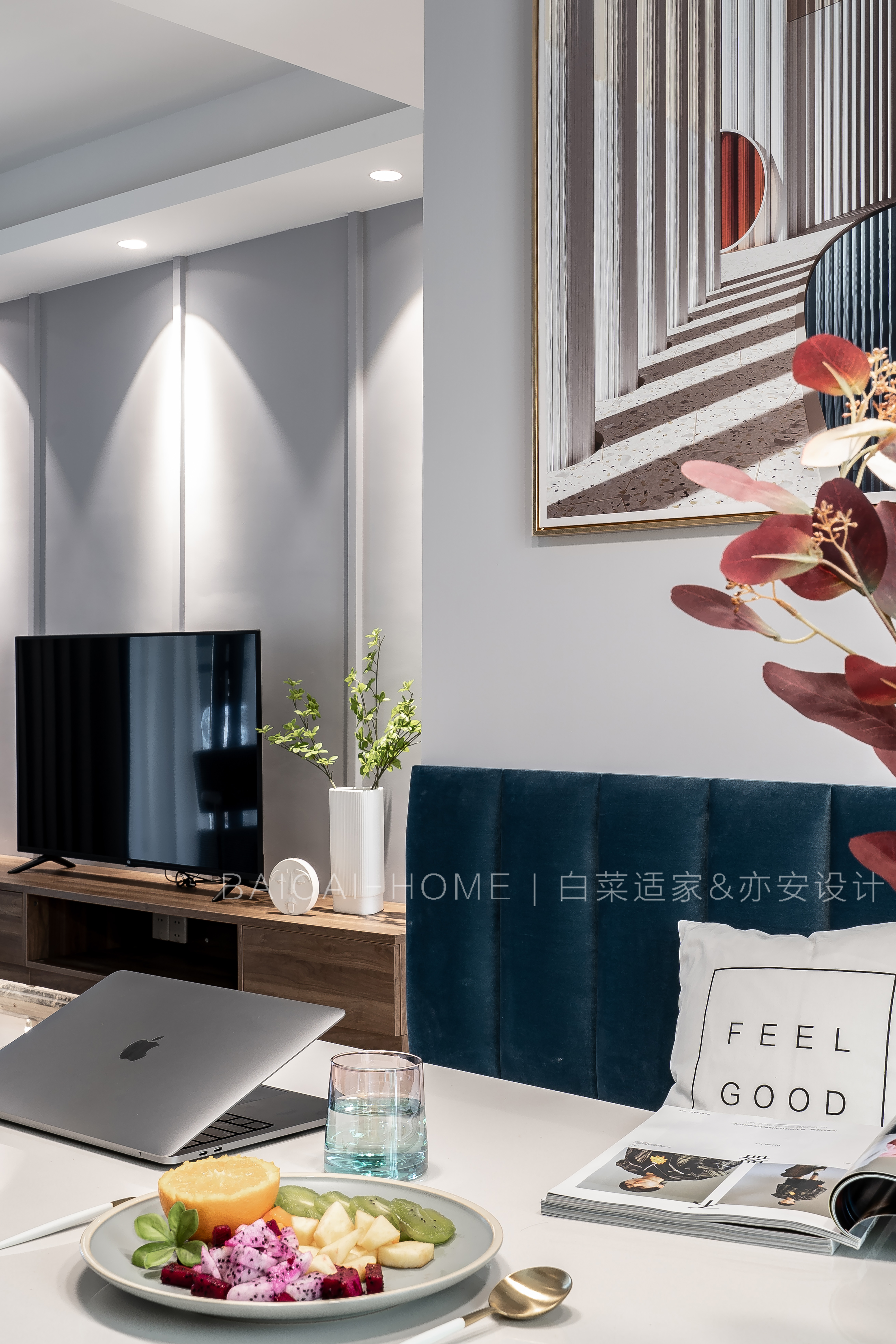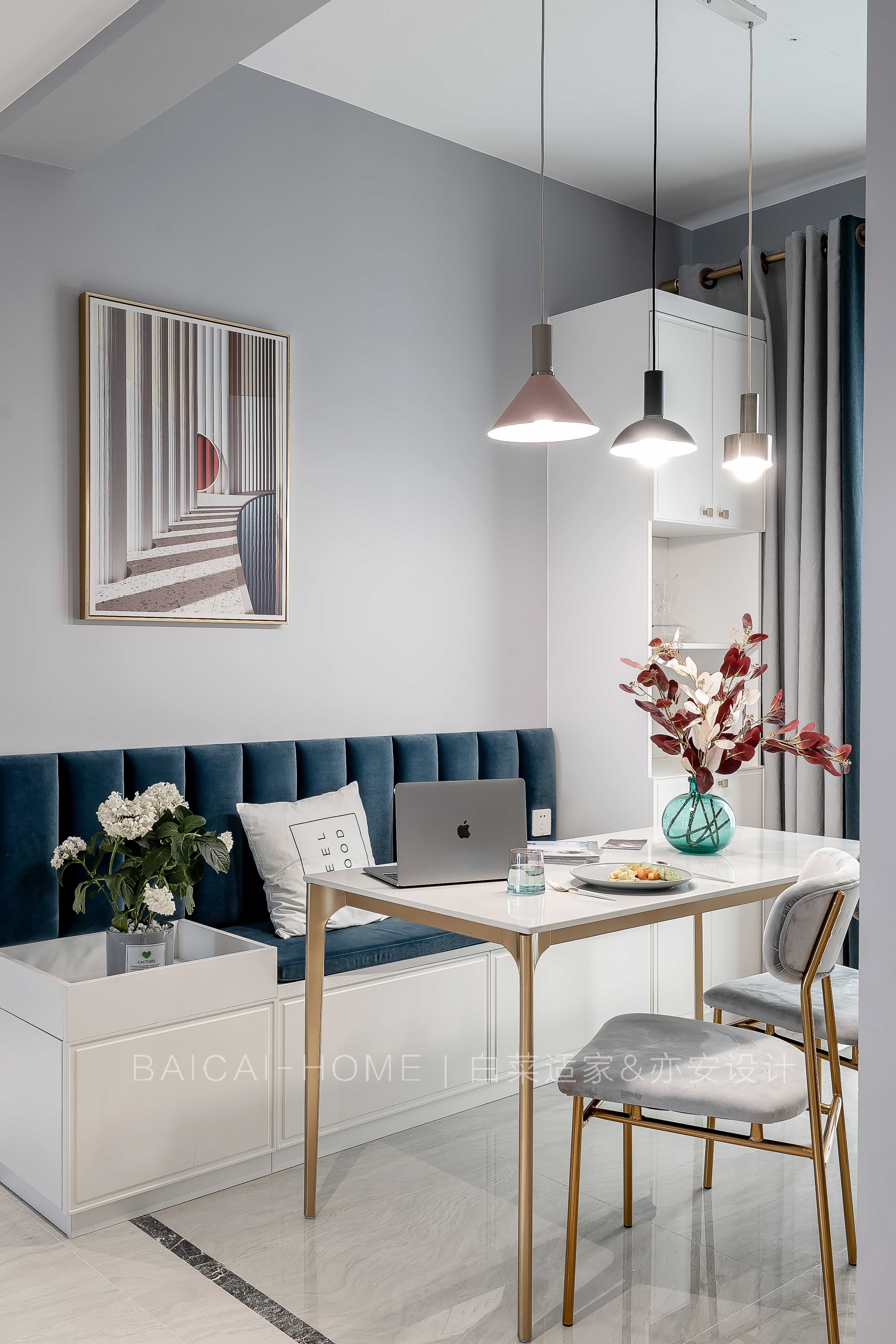 但是,我们不希望太过于常规。明度较暗的深蓝撞色,以及深浅双色乳胶漆与石膏线条的错位感,都是代表女主人的特别之处。