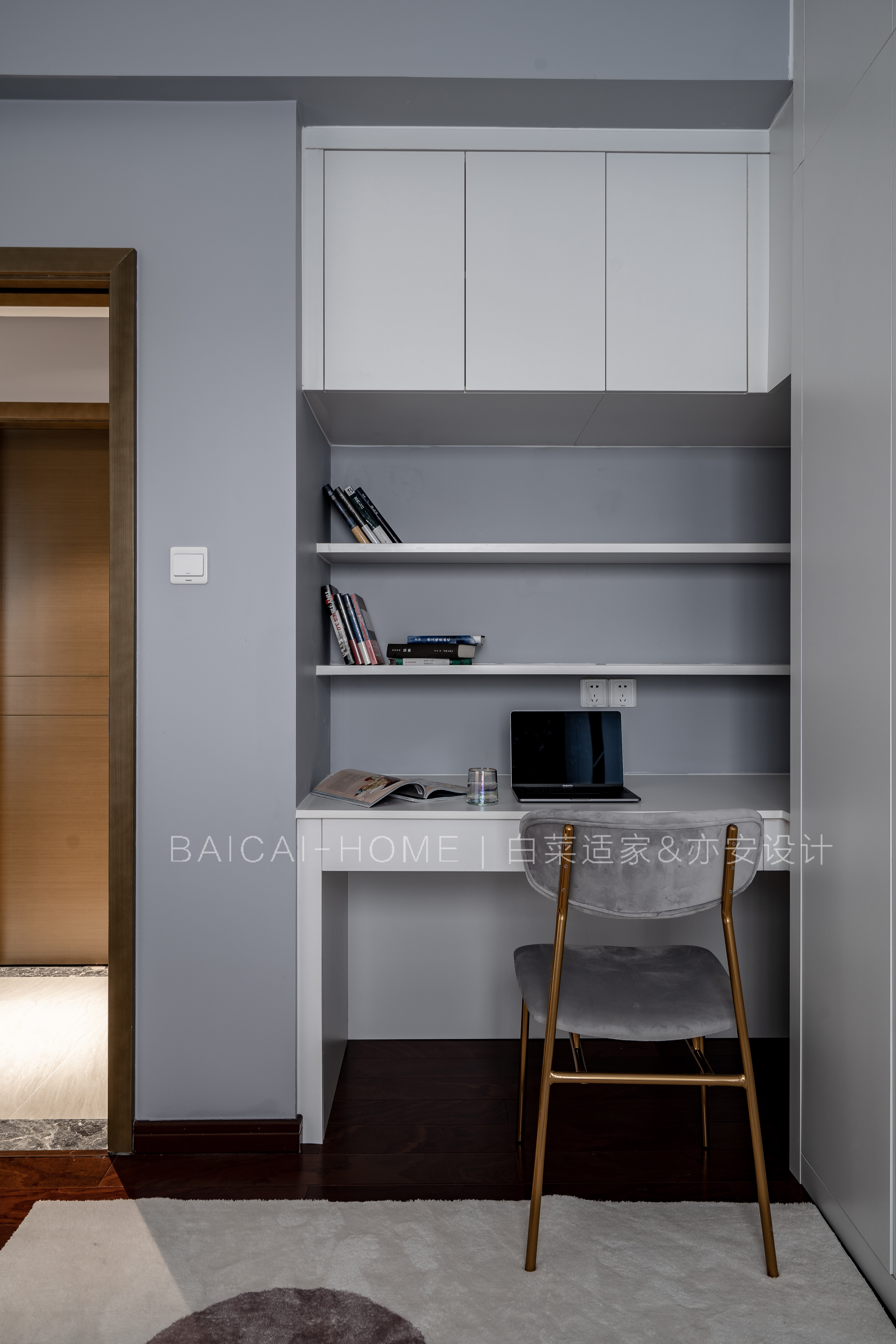 书桌上方的吊柜看起来似乎有一些不同。 其实,也是基于现场梁位的问题进行了优化,并非常规尺寸。不需要再进行木工天花吊顶的施工动作。