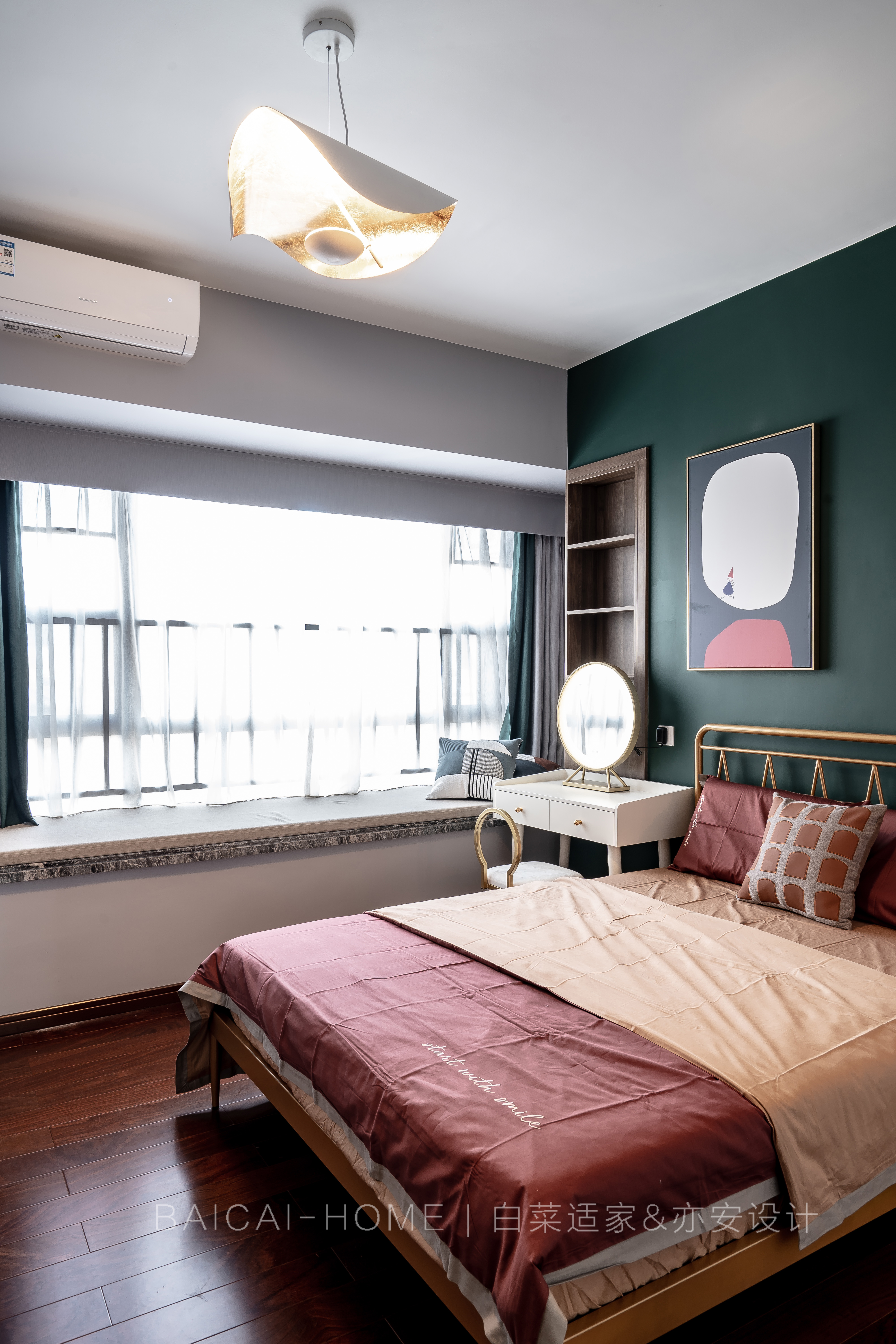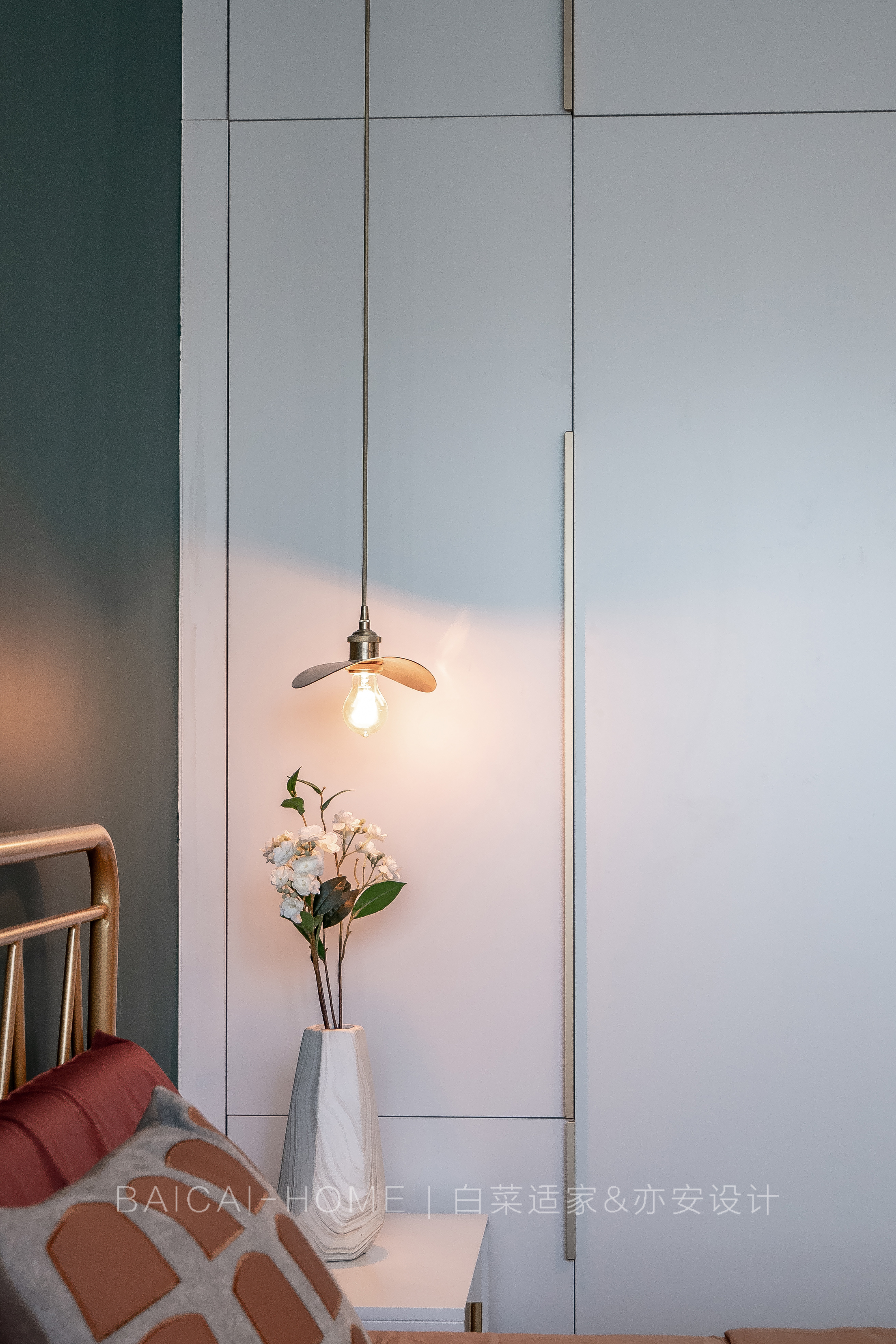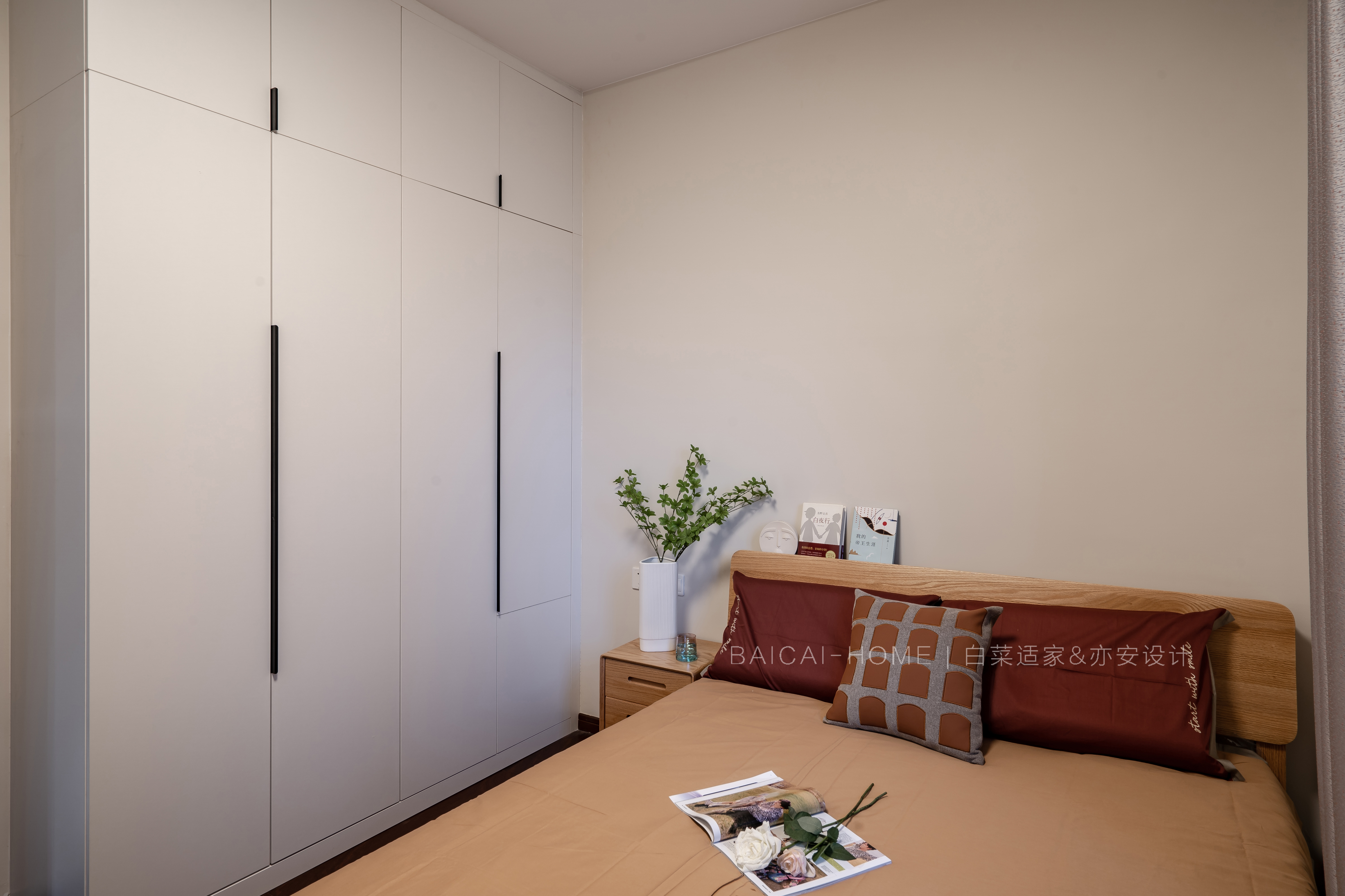 设计选材:主卧床头背景选用芬琳漆,环保性能更高,气味很低,是芬兰进口的。
