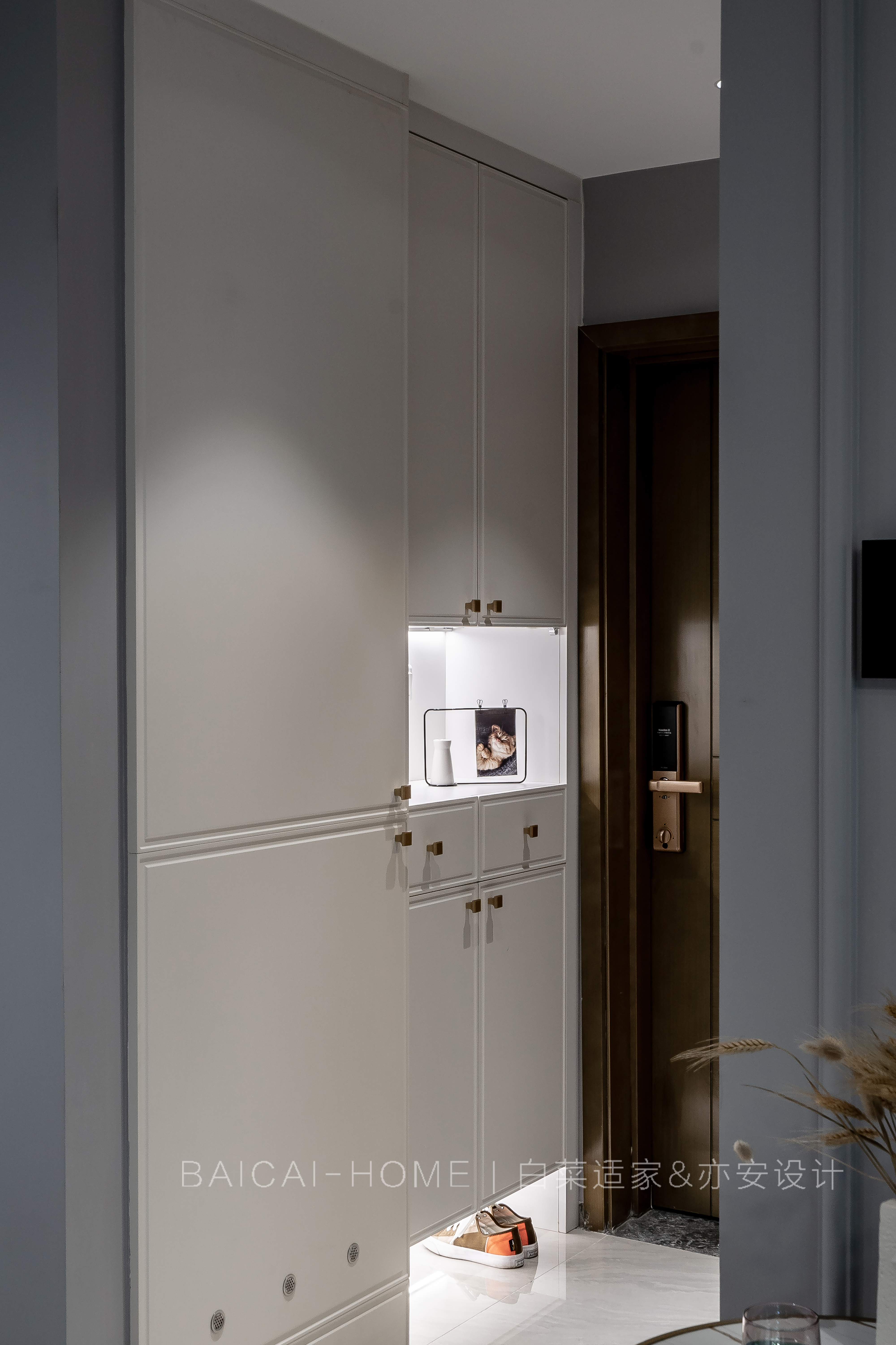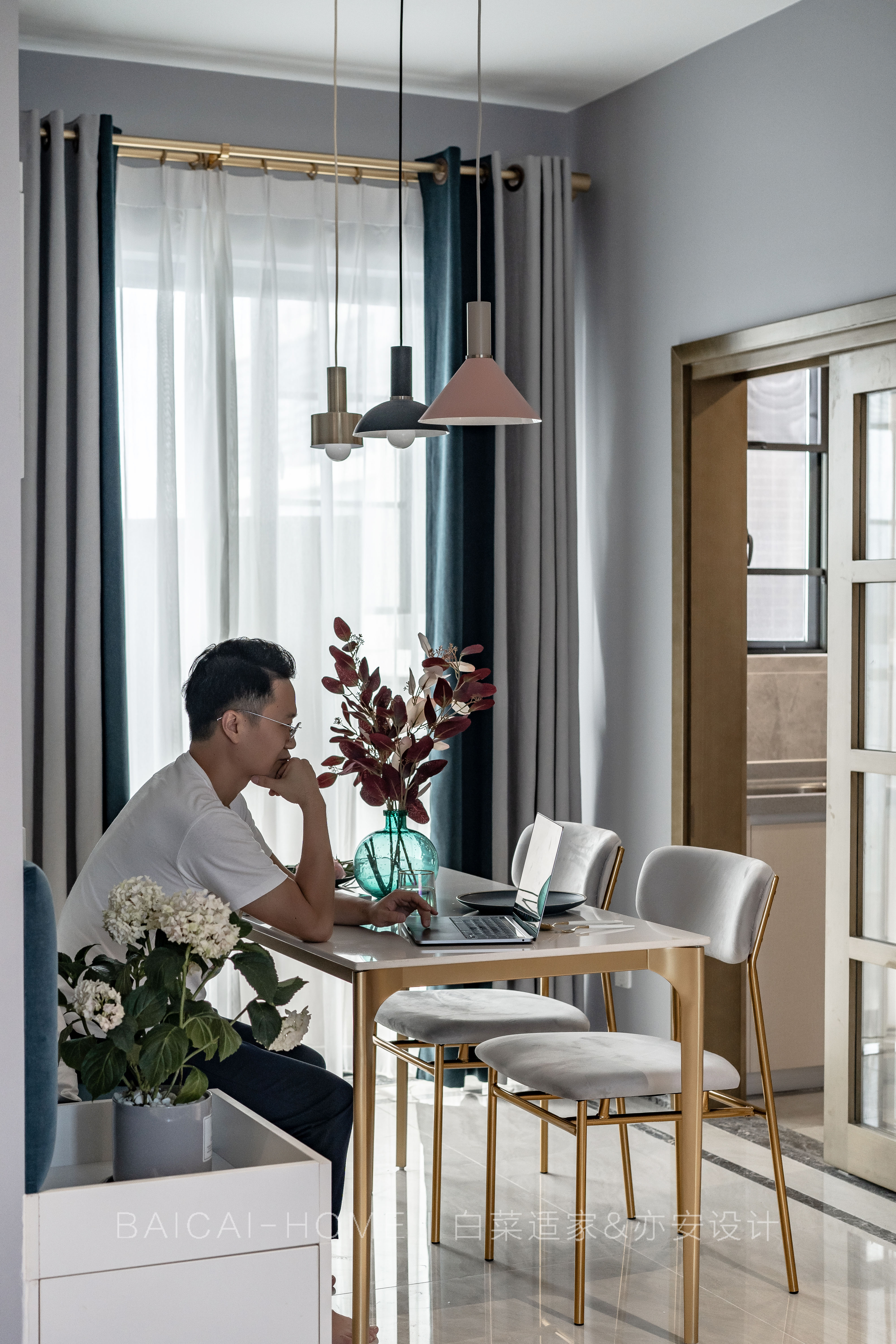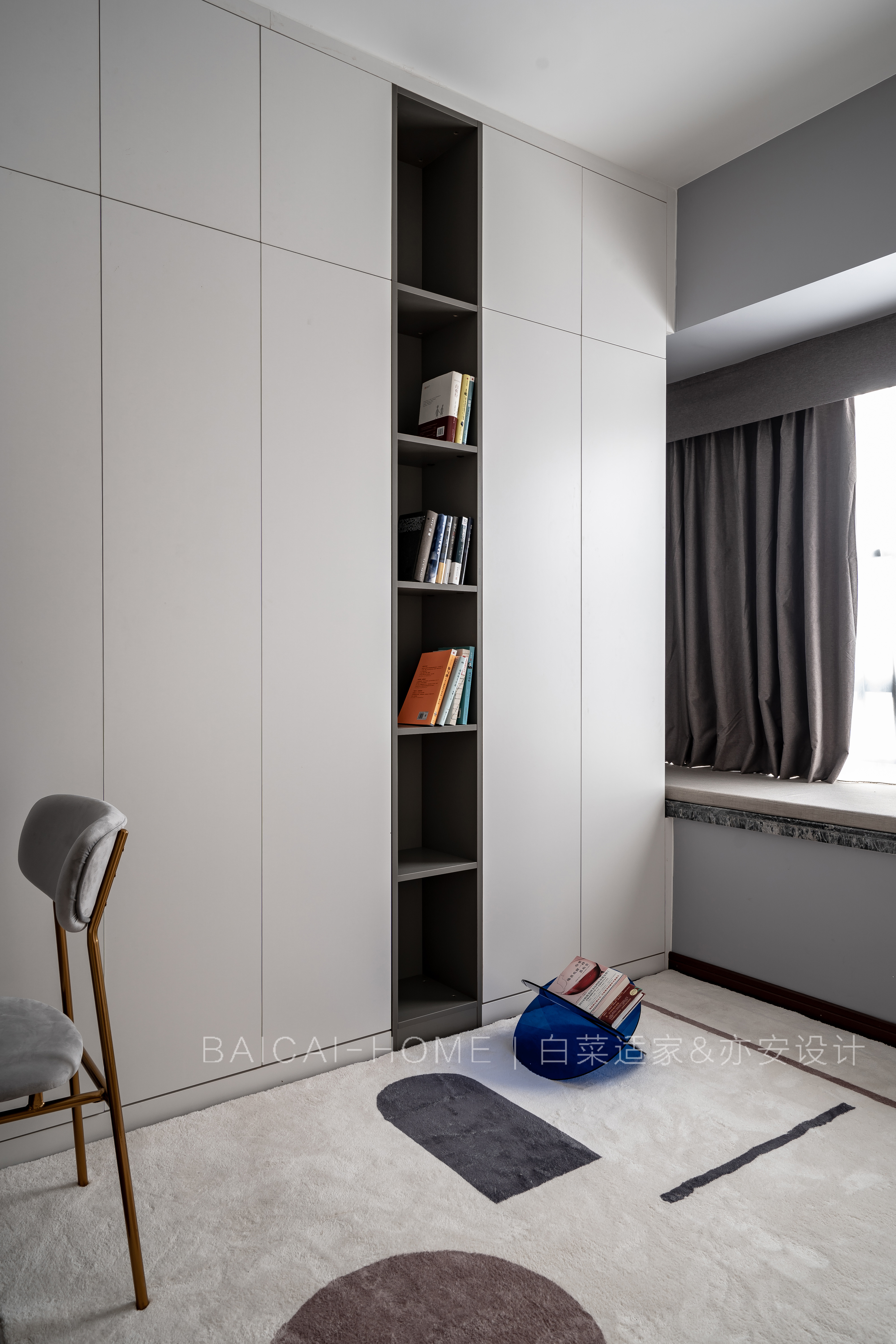 业主潜在需求: 屋主Savior是一位单身女生,性格不同于普通女生,她话不多,性格温柔中又有些许刚毅和坚定。她留着短发,时常穿着中性色的衣服。 第一次面谈,我就判断灰蓝是属于她的颜色。当然,女性应有的粉色系和生活品质的高级感提升同样是必不可少的。 同时,她工作繁忙,加班较多,放假更多的时间是看看电影听听音乐,享受个人的休闲时光,周末煮饭的频率也并不高。 但,精致还是每一位女生的潜在需求。 业主表象需求: 因为单身,这个三房一卫的小户型结构对于Savior现阶段的生活需求是刚刚好。 但餐厅空间和冰箱的关系是这个户型最难解决的问题。 无论哪个女生,衣柜里总是少一件衣服,独立衣帽间更是每个女生的梦想。Savior还有一个特点,叠的衣服多过于挂的衣服。只是上班要穿正装,西装衬衫则需要挂起来,回到家也希望有随手挂衣服的地方。 其次,Savior喜欢旅行,配合不同路途的大小行李箱就有4个,需要有足够空间存放。 Savior父母亲偶尔会来珠海同住,主卧隔壁的卧室一开始定义成客房兼书房,二次沟通时,对屋主更多的了解,我觉得这间房更适合成为她个人的私有空间,它应该是衣帽间+书房+投影间。 试想一下,Savior再长大一些,嫁人后的场景。所以Savior和其父母都非常认同我的观点。 于是,有了今天的《半夏》。