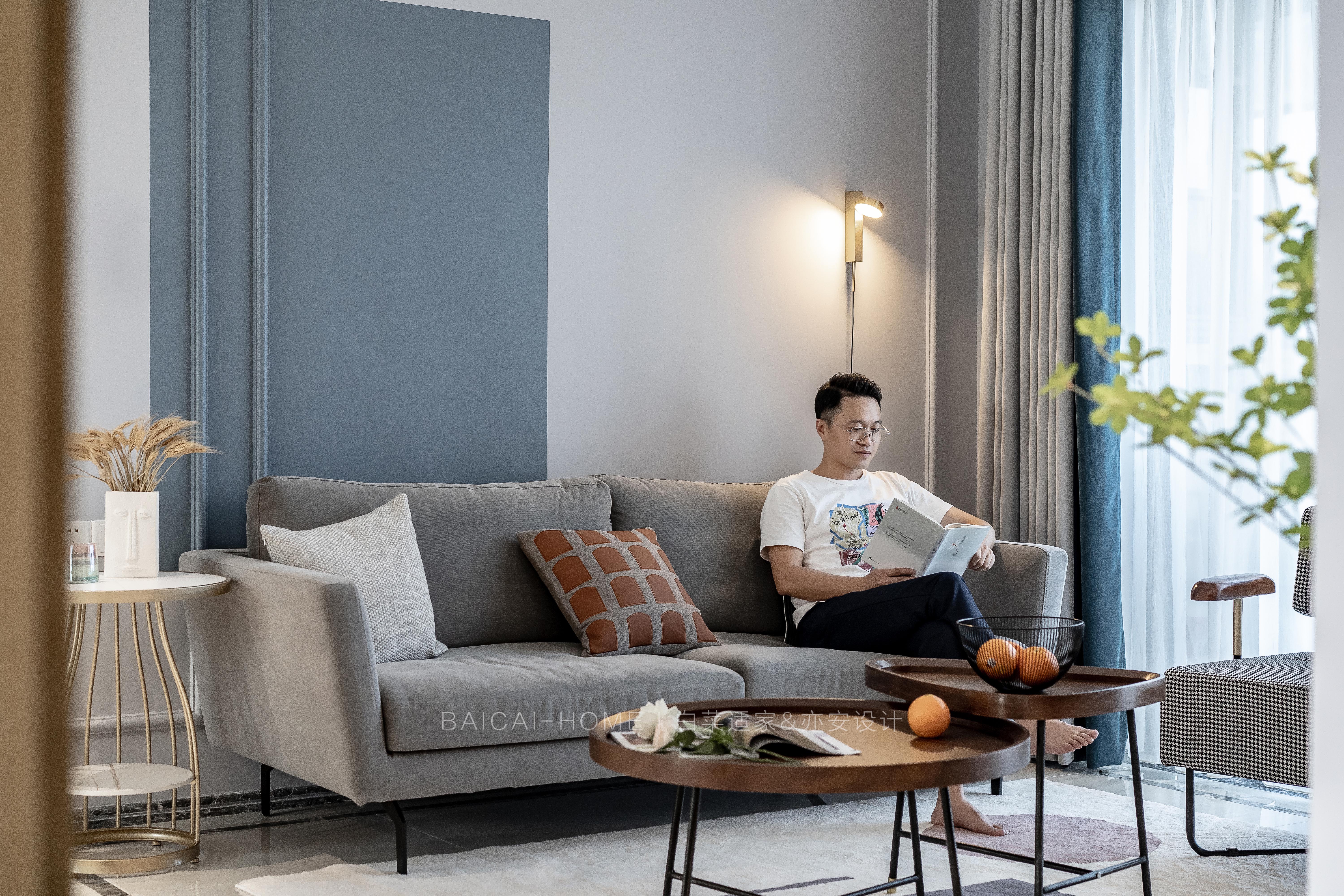 客厅间宽3.8米,在和Savior沟通后,我们决定采用成本较低的石膏线条+颜色漆来丰富空间层次感。 但是,我们不希望太过于常规。明度较暗的深蓝撞色,以及深浅双色乳胶漆与石膏线条的错位感,都是代表女主人的特别之处。