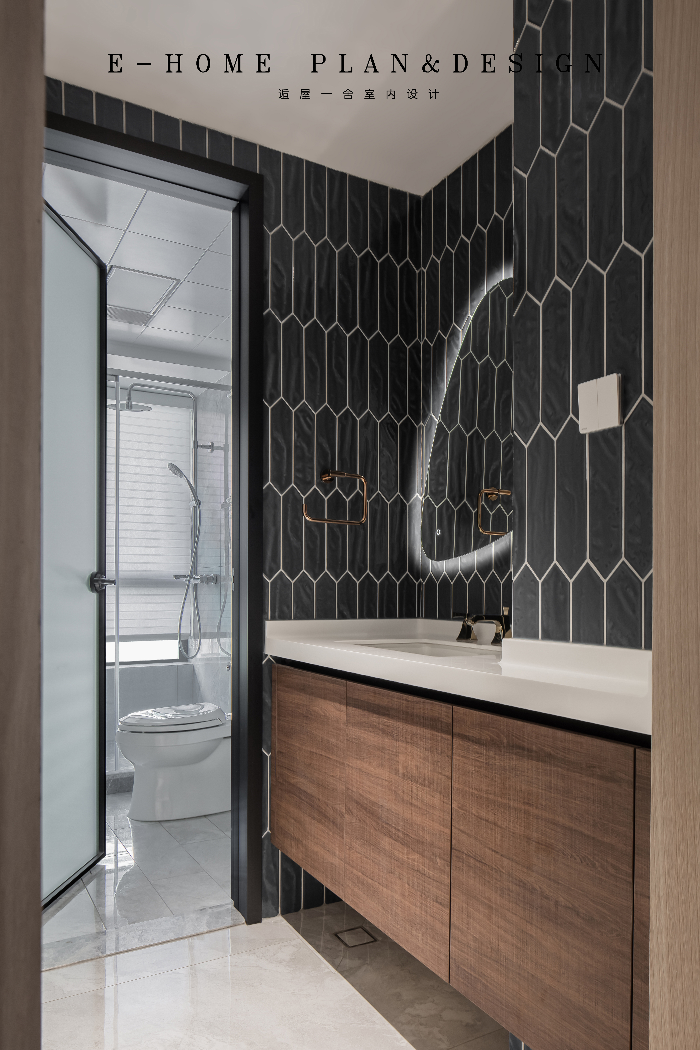 客卫的干湿分区更加明显,深色有琉璃感的墙砖和不规则的镜子,给空间带来质感。 同时因为这个家里有三个男生,在湿区增加了小便器,会更方便整洁。