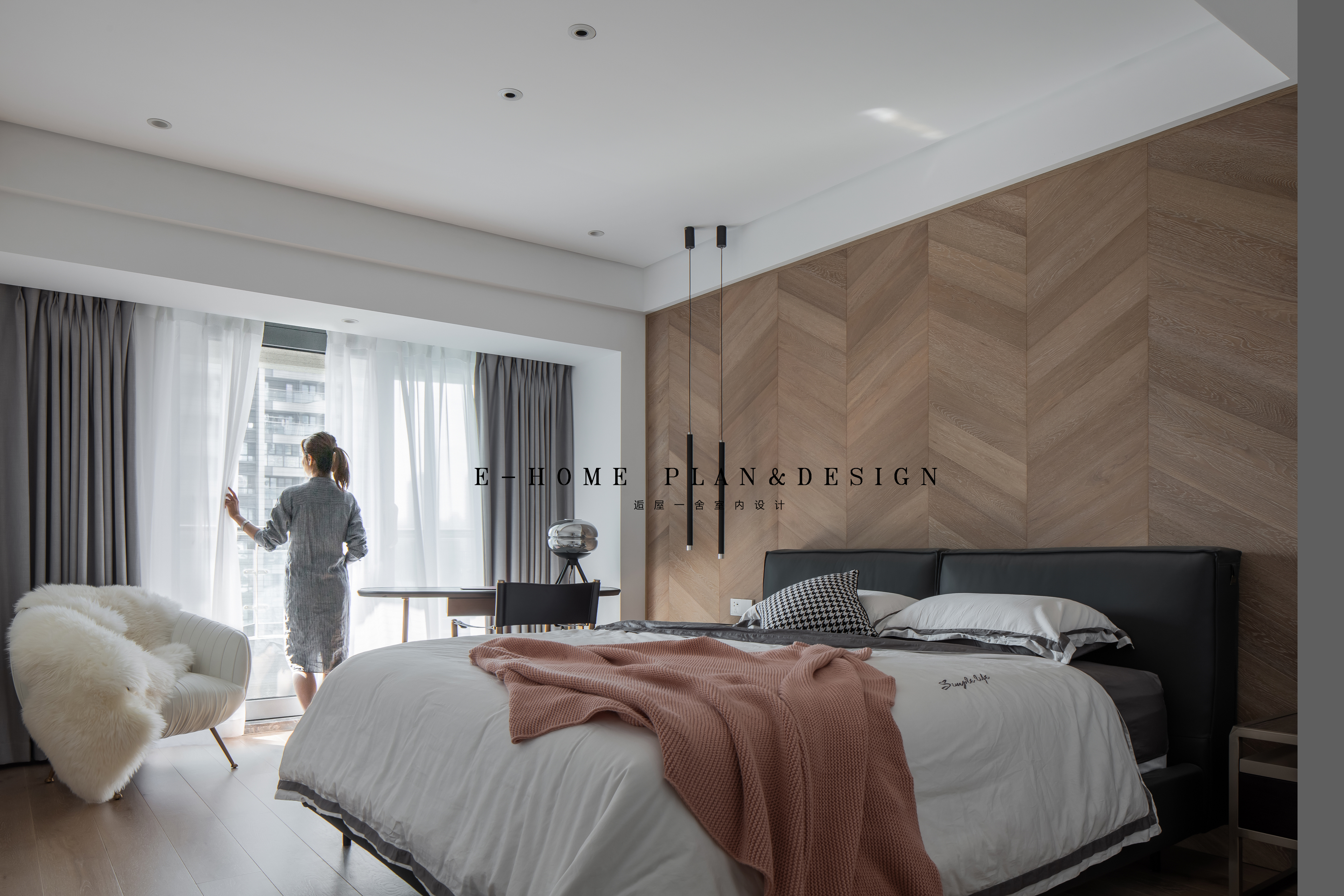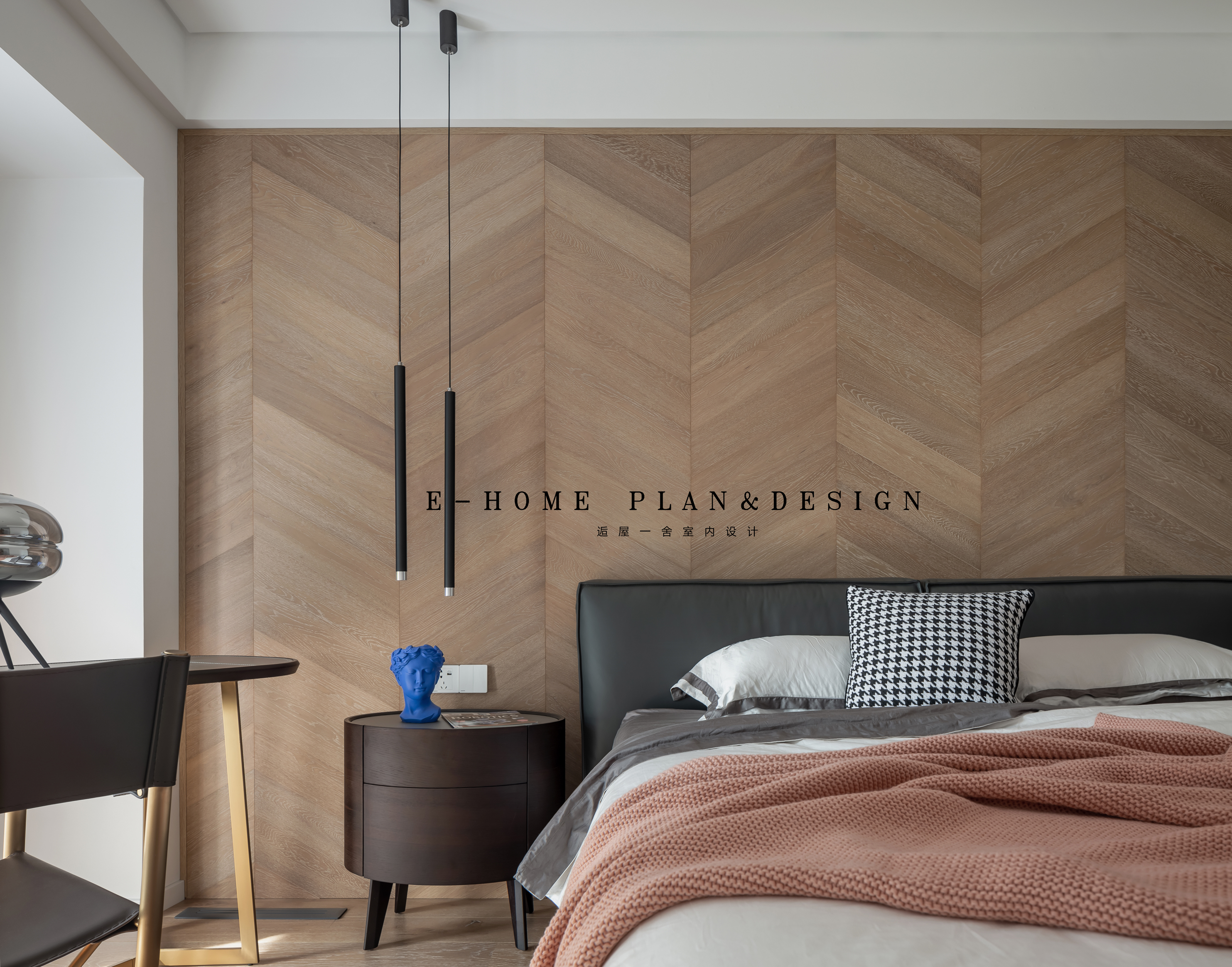 床头一面木地板装饰,令人仿佛已经感受到温润的触感、自然踏实,这是空间内特别有力量且和气的存在。