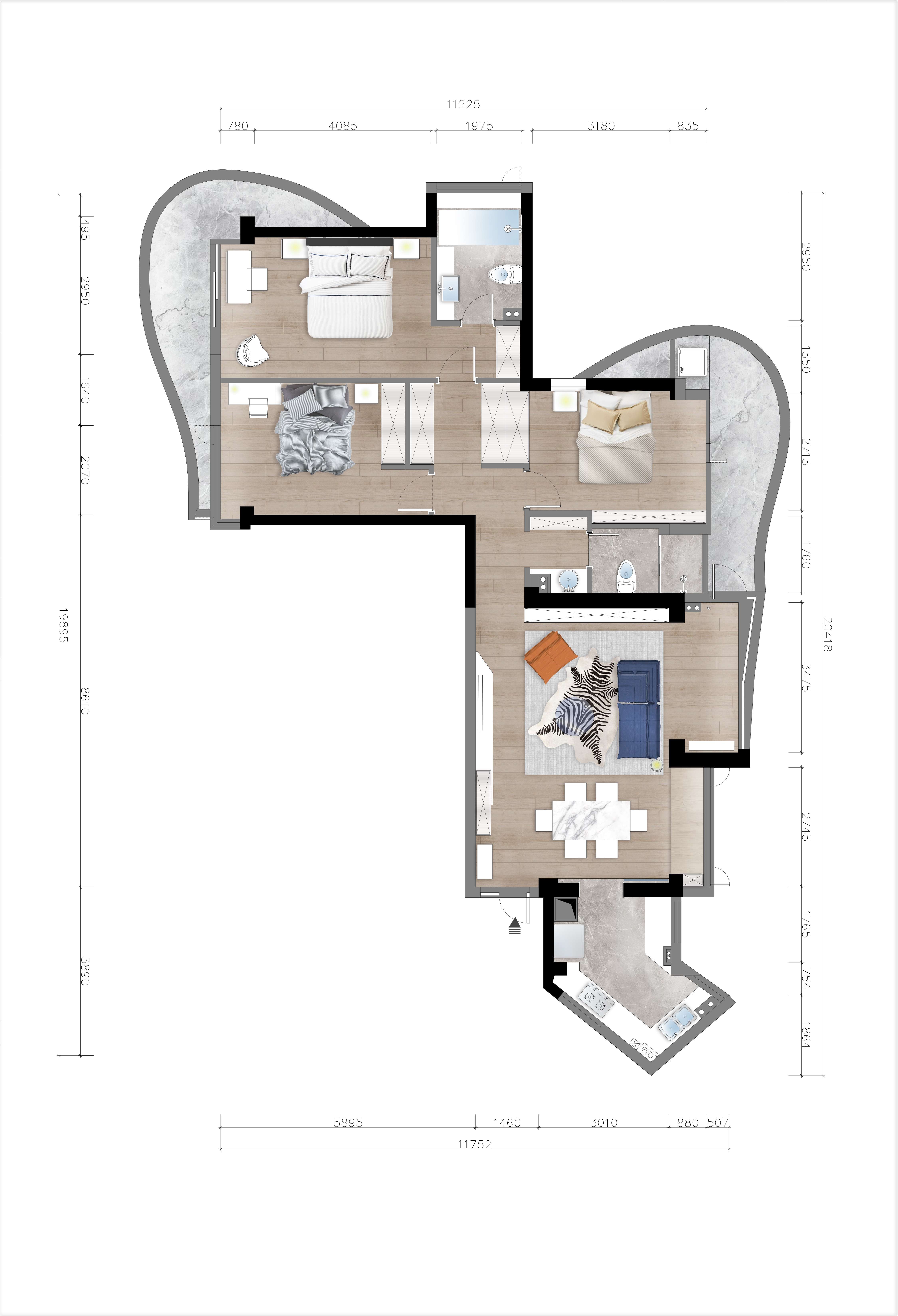 解决:通过对三个房间内柜体的划分和调整,把主卧衣柜做在去往主卧的过道两边,结合儿童房柜体的厚度,让过道末端形成了自然的端景墙,不再是一扇卫生间的门。 -