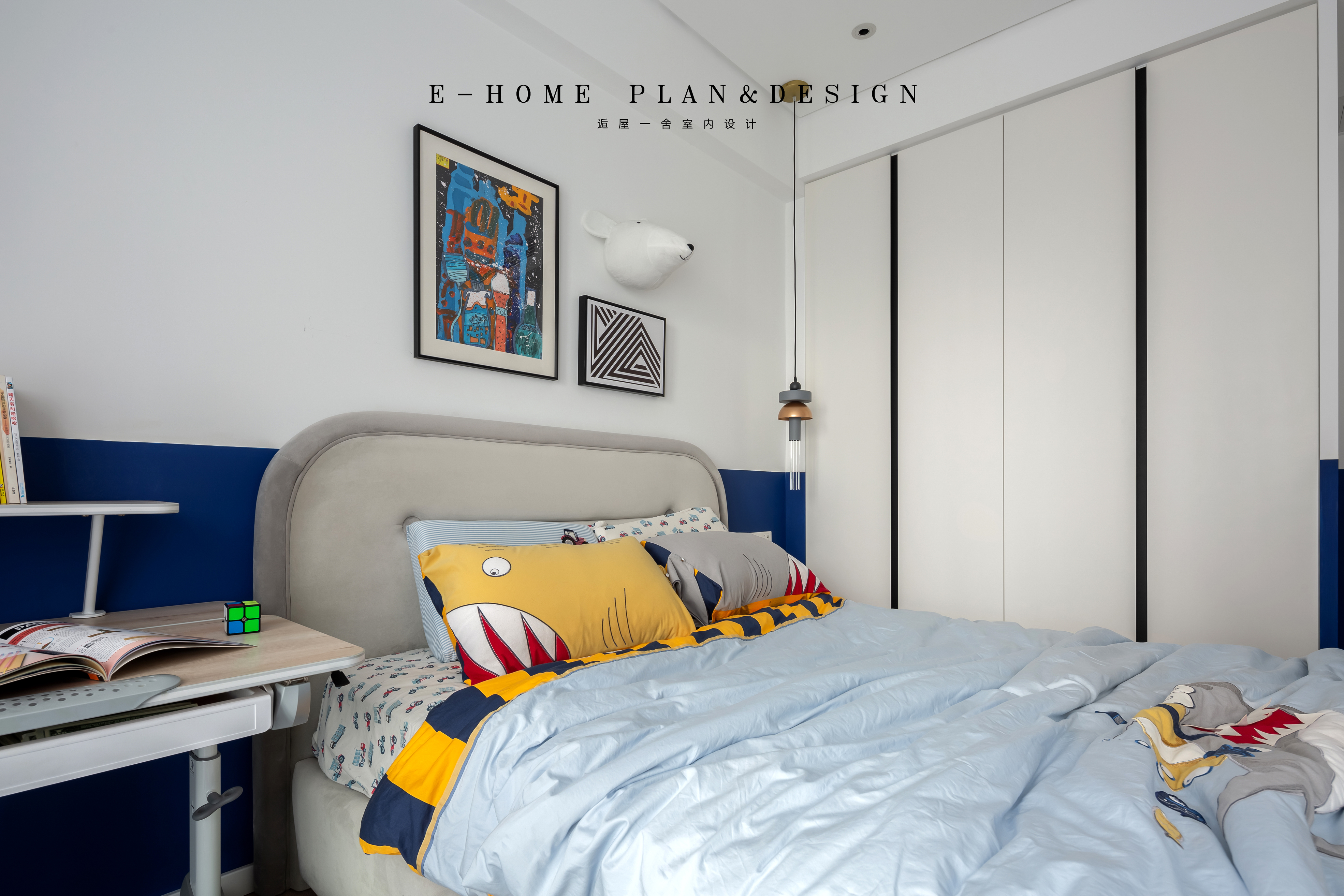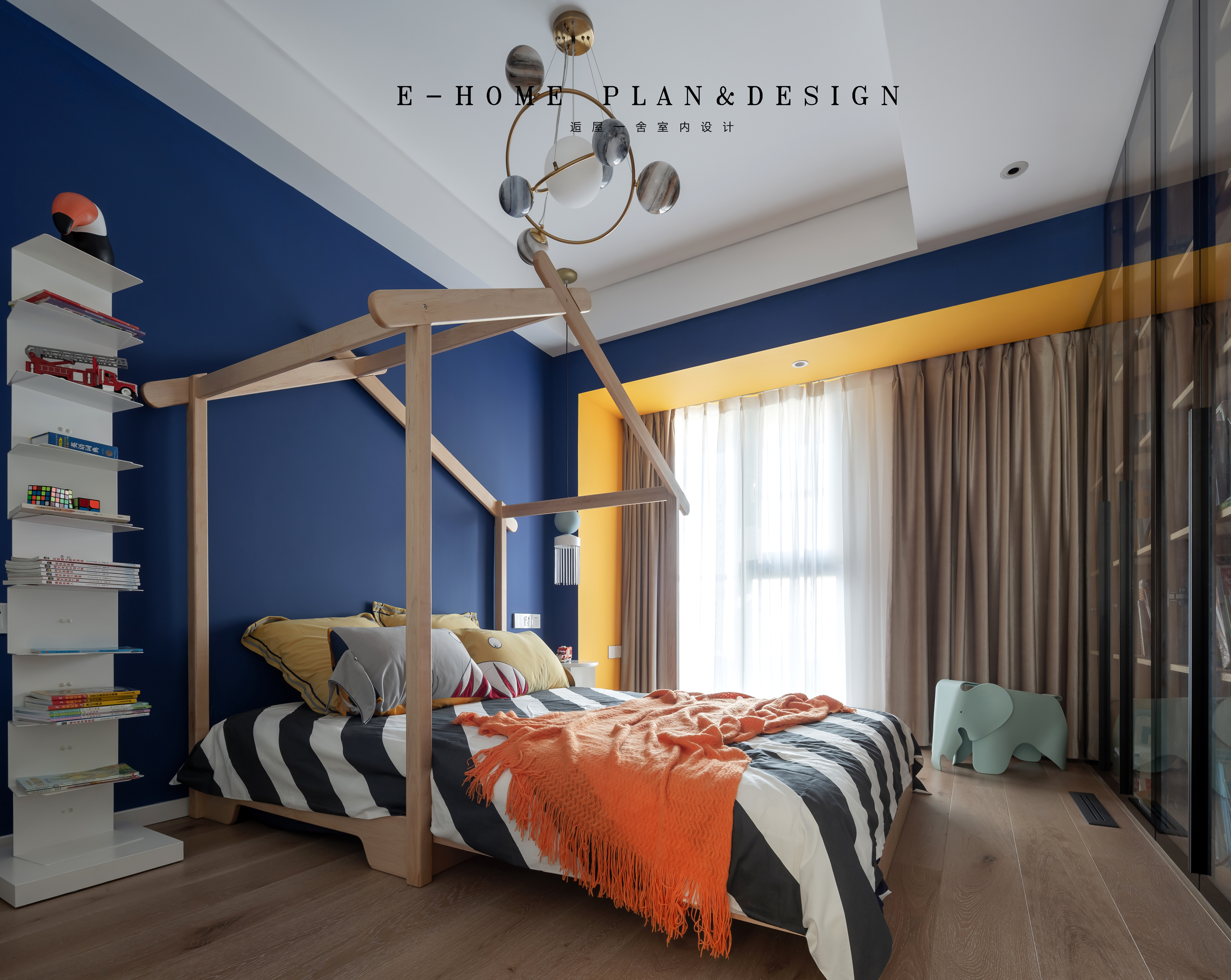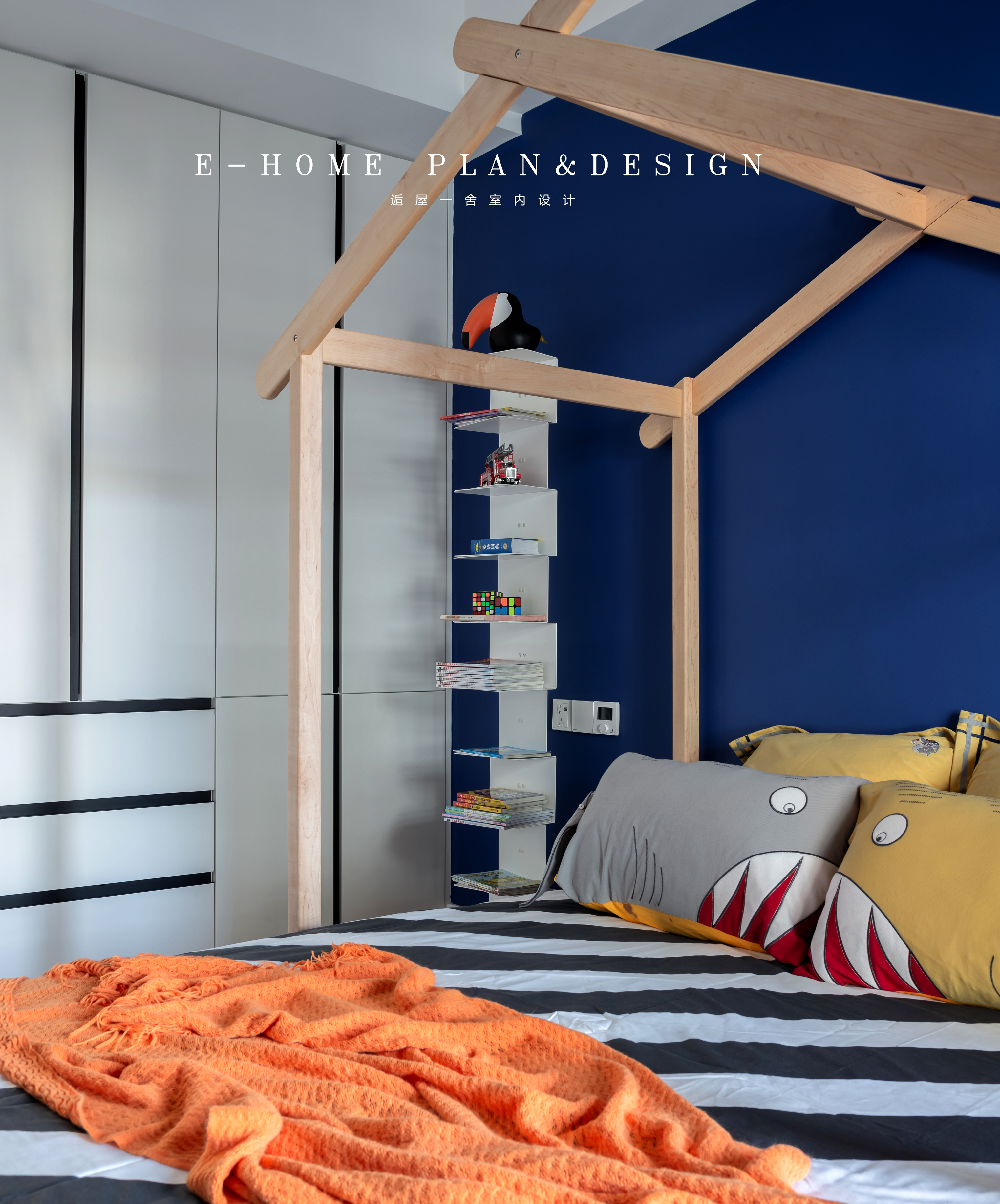 木屋结构的小床,“流浪地球”的创意顶灯,身处自然与宇宙之中浓缩的恢弘感,在这钢铁森林中一点一滴建立。 床尾借用客卫的空间,做了一整排书柜,满足成长时期的各种书籍。