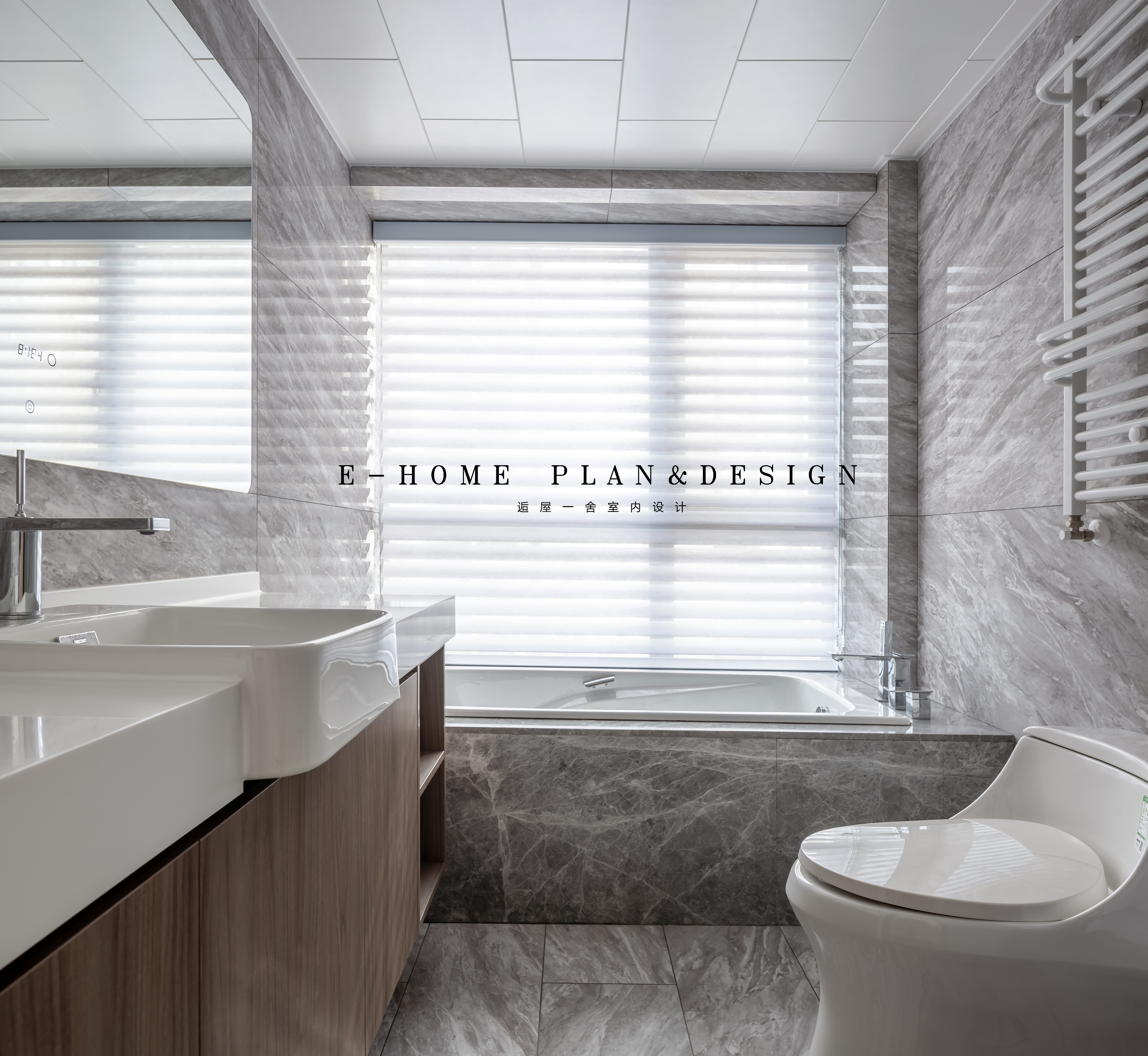 主卫的组成很简洁——浴缸、面盆和马桶。 屋主并没有淋浴的打算,大人泡澡的同时,也可以考虑给小朋友洗澡。 墙面和地面统一的灰色石材,使空间看上去简洁而现代。