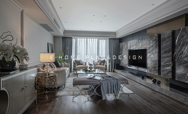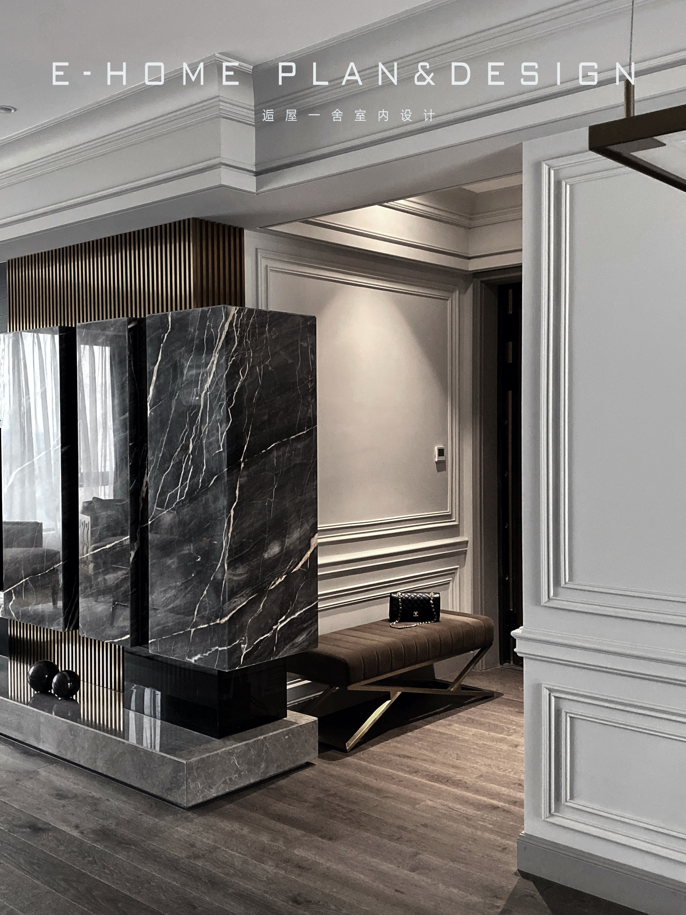 如果站在客厅中间,你会发现,沙发这面是女主人柔美温馨的线条,而电视那一面,则是男主人硬朗时尚的手笔。 一面似乎是卷着风雨雷电的、纹路粗狂的石材,另一面是温柔细腻的、优雅流淌的线条,尽管有如此差异,在设计师的排兵布阵下,它们却是自然的共生状态。