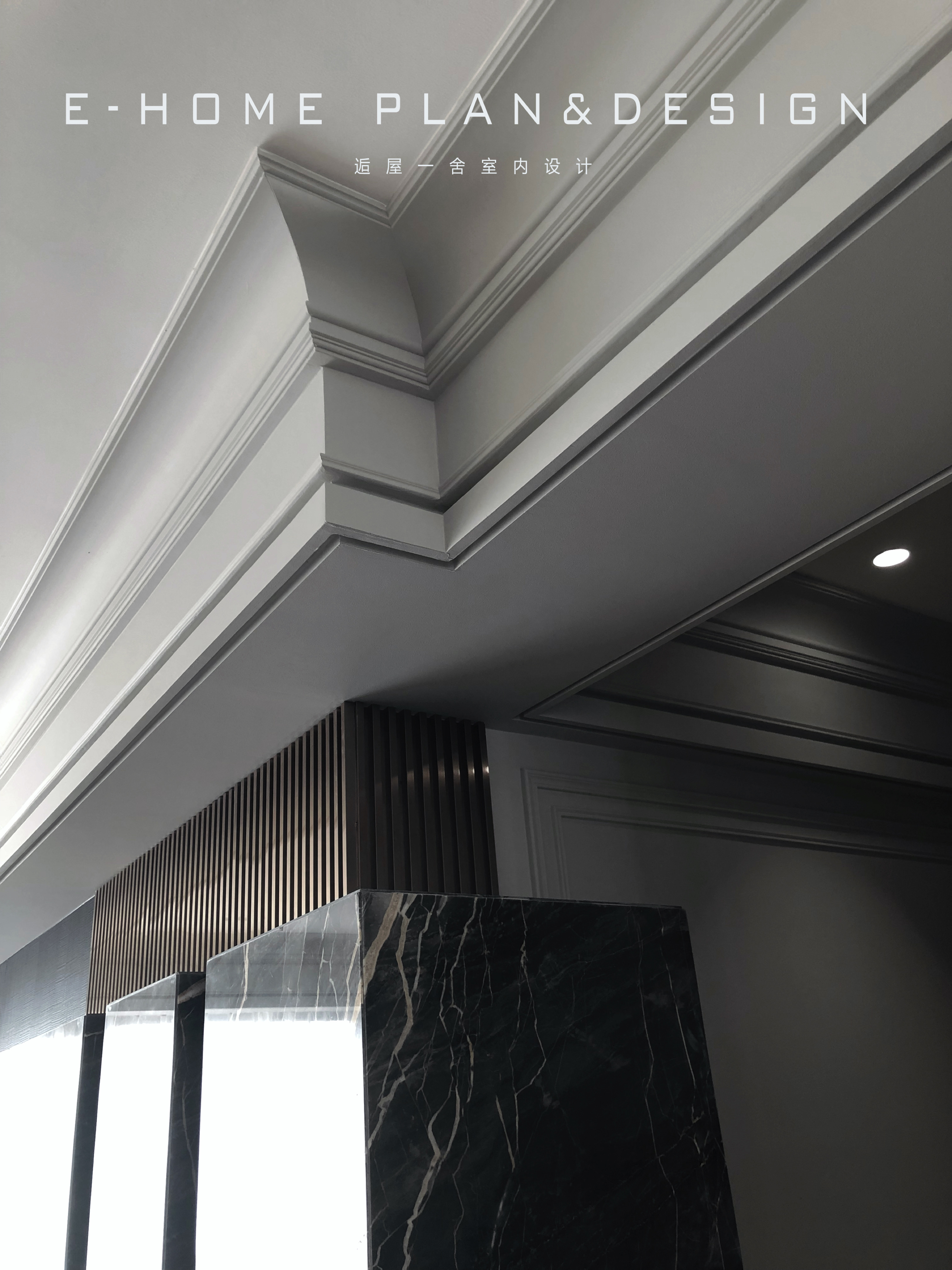 乳胶漆细节的处理,也让人瞩目。 线条像是向远处驶出的列车轨道,在墙面流畅延伸,又精确无比地汇合在一起,极致感受。