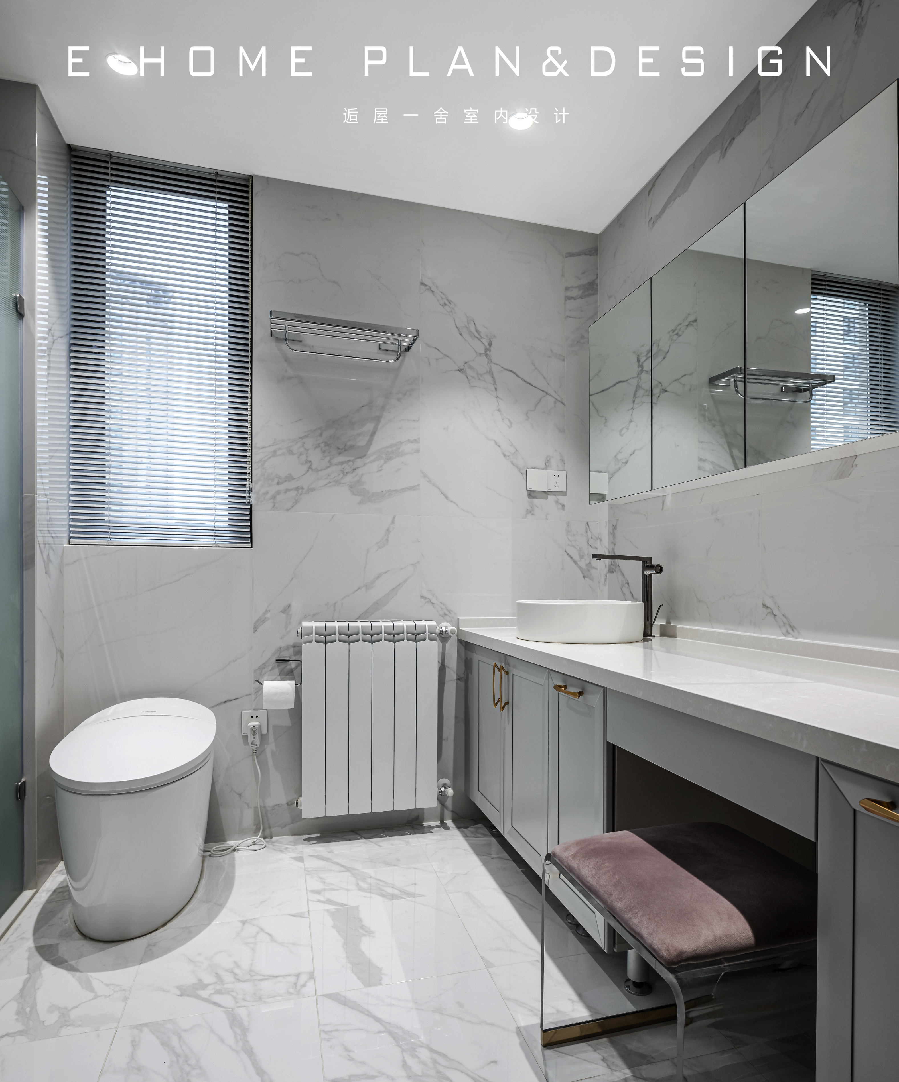 大面积材质的出现,工艺的精巧铺贴,使小空间里也洋洋大气。 台面专注于功能,留白意味明显,镜柜和地柜的存储井井有条,这里是身心都洁净。