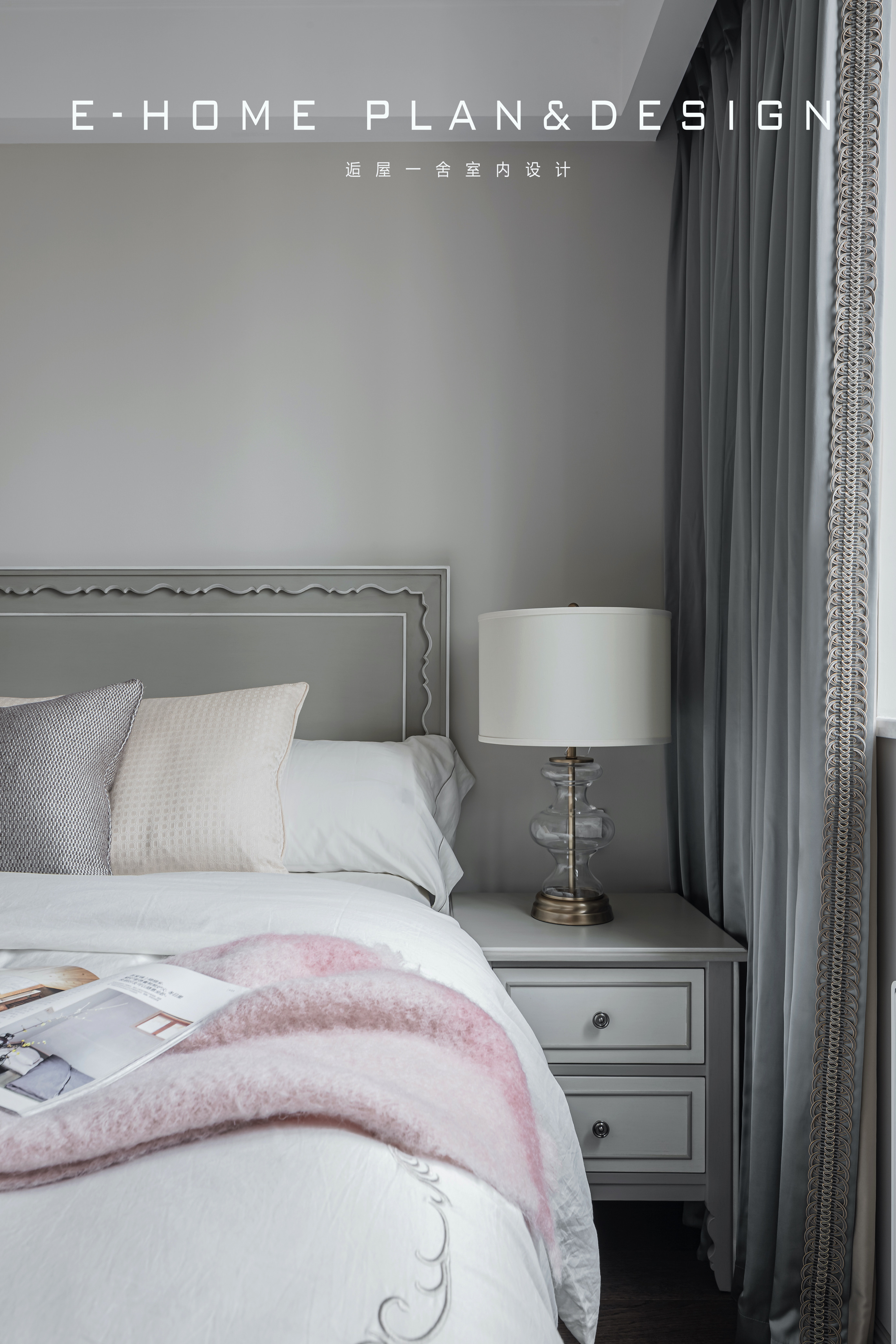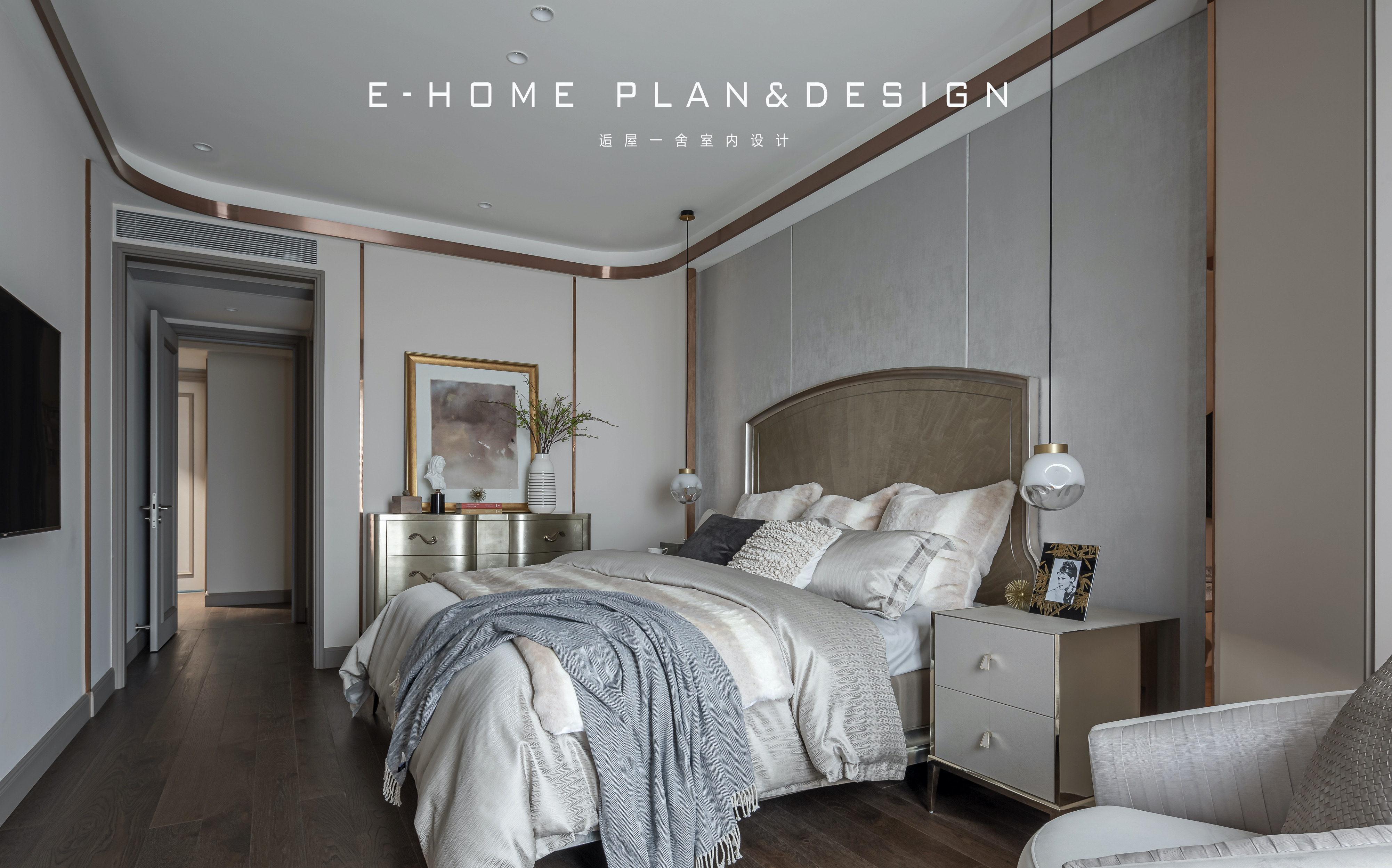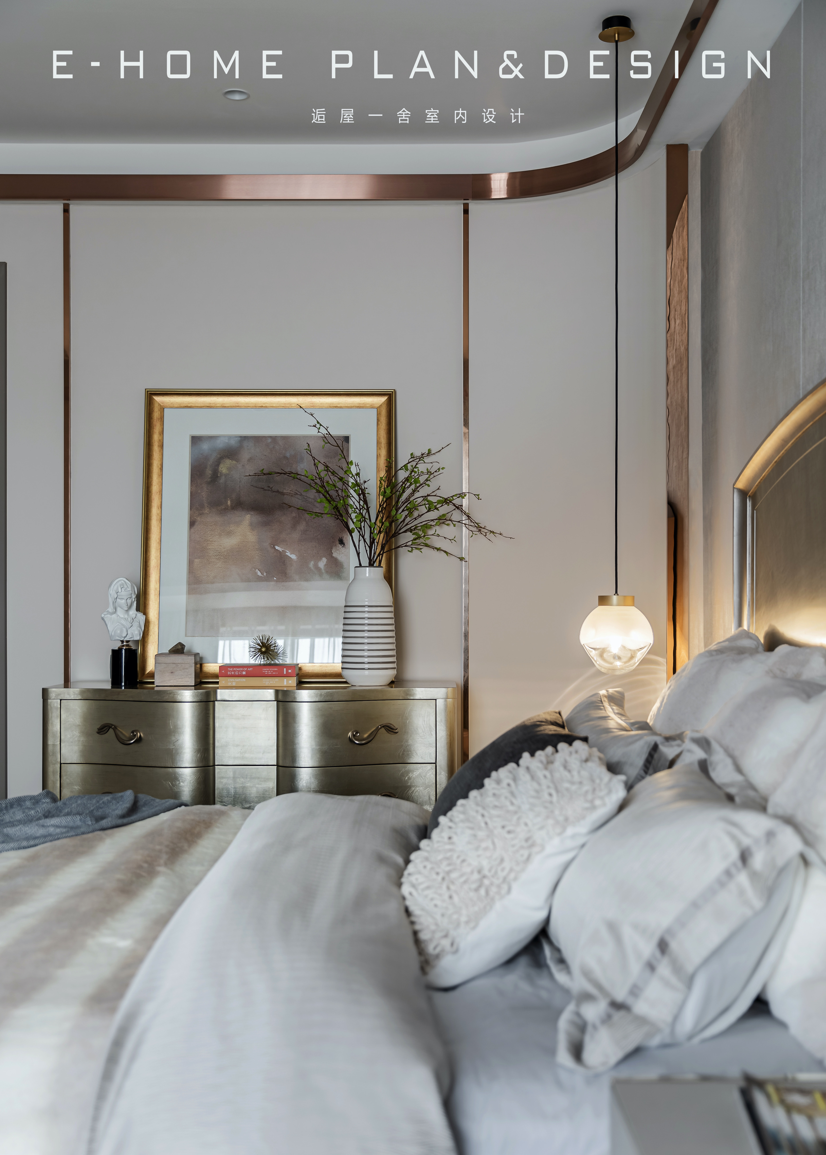 延续无主灯风格,简洁明快,弧形墙面处理,香槟粉为卧室增添情趣。 在平常的卧室布局中,弧形的选择,本身就是一个非常睿智的决定。女性的优雅温润、男性的力量都尽显,香槟粉的选择,在这里显得非常中性、和谐。