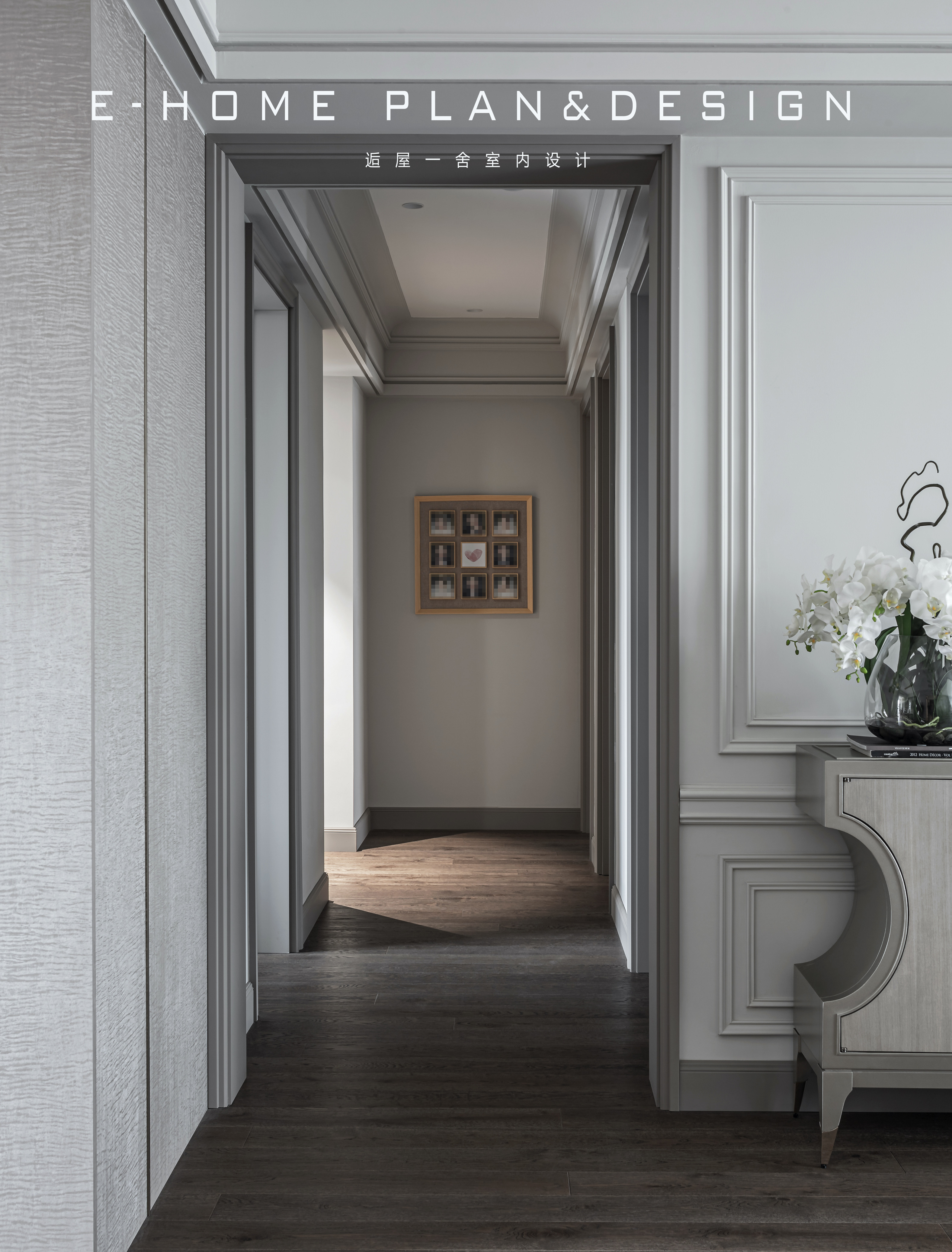 过道本不起眼,极窄的门套线使这里纤细、亭亭玉立,翻涌着层次。 走廊尽头九宫格的婚纱照,尽显温暖,也带来岁月悠悠的启示。