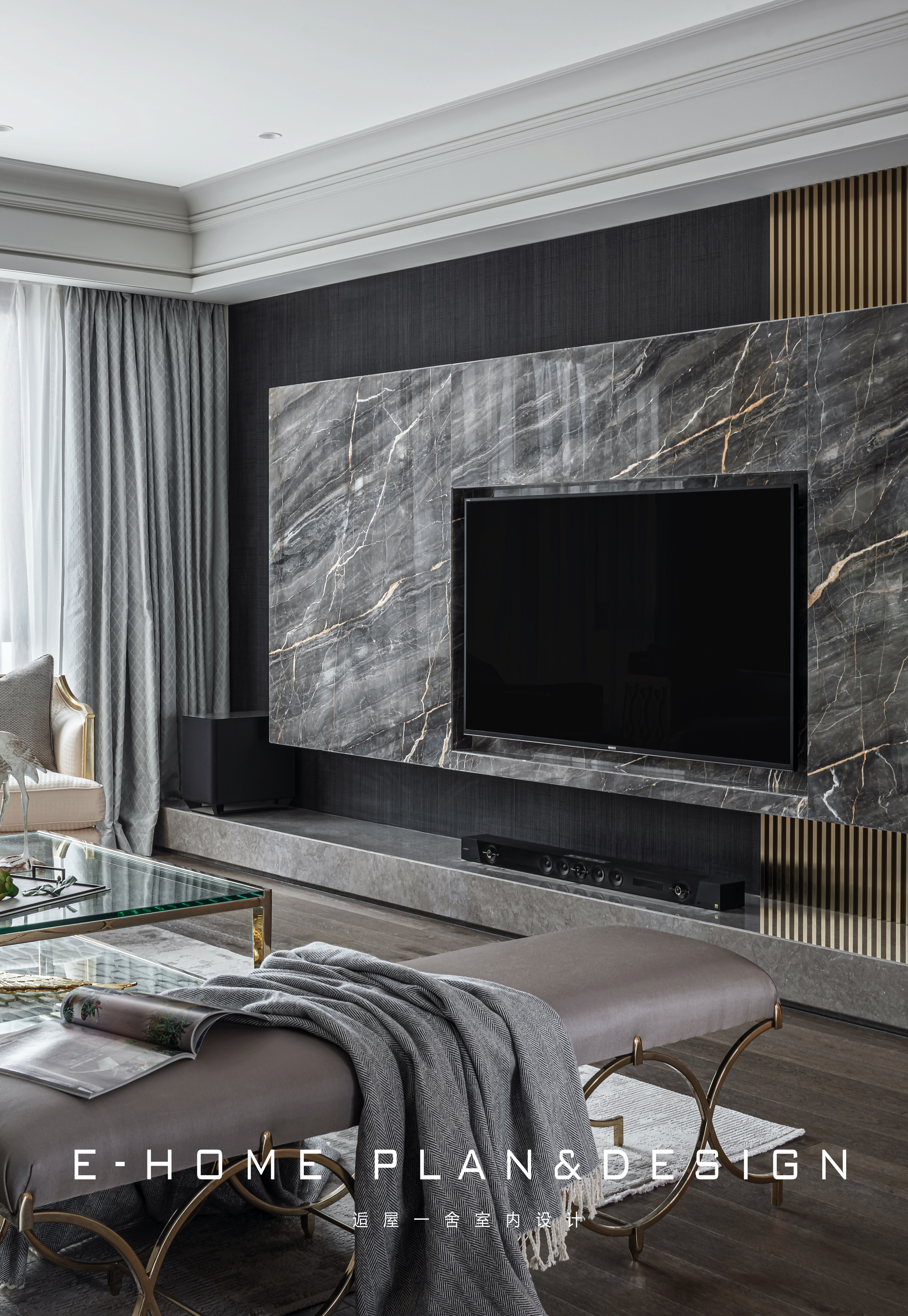 设计师对尺寸和材质,有清楚的排列和规划。 电视机内嵌在纹路自然的石材里,“凿壁”而来的粗狂质朴,被蜂蜜色的不锈钢细条及时收住,和雨雾色的涂装板相映衬,磅礴气势中有细腻的处理。