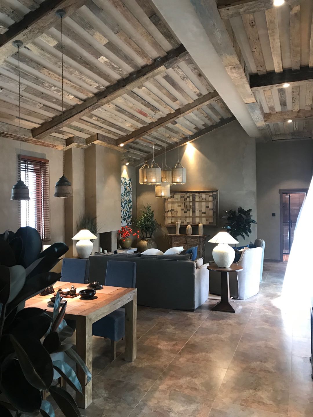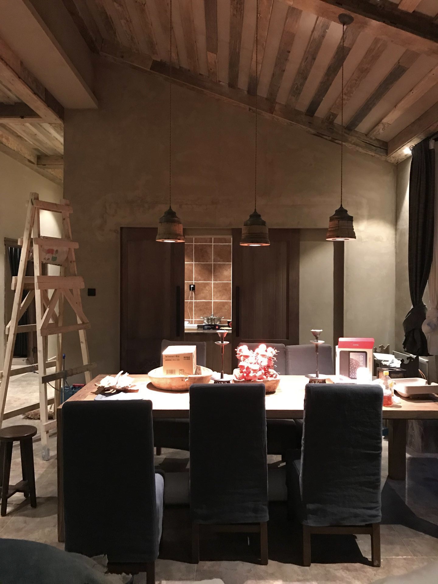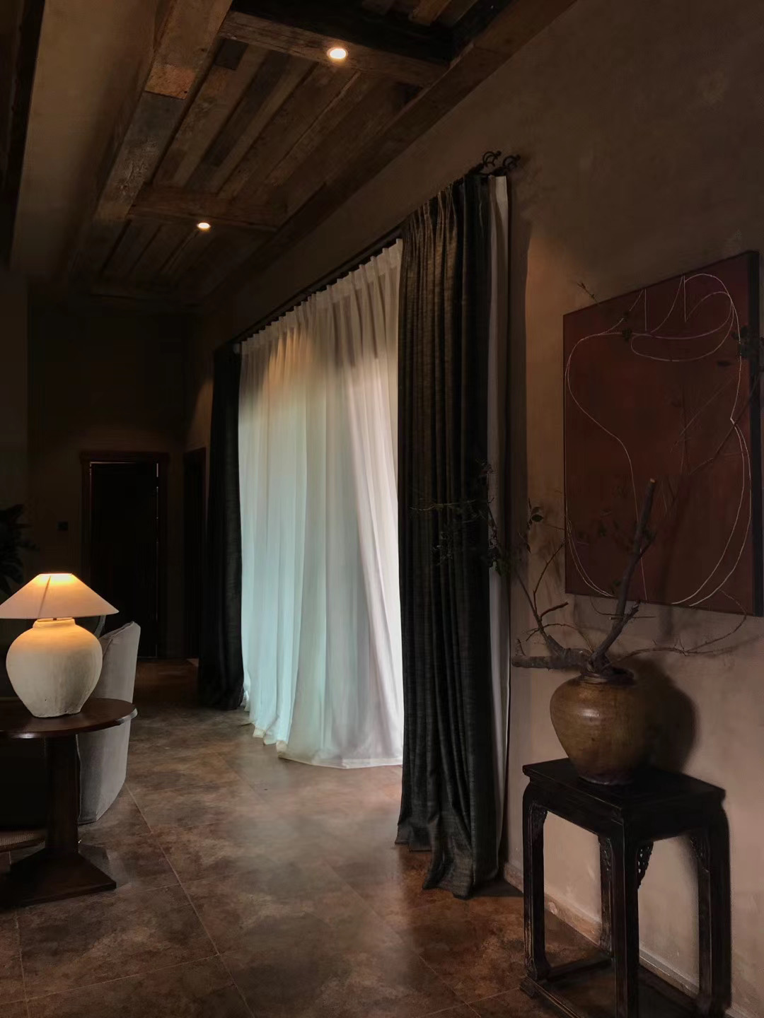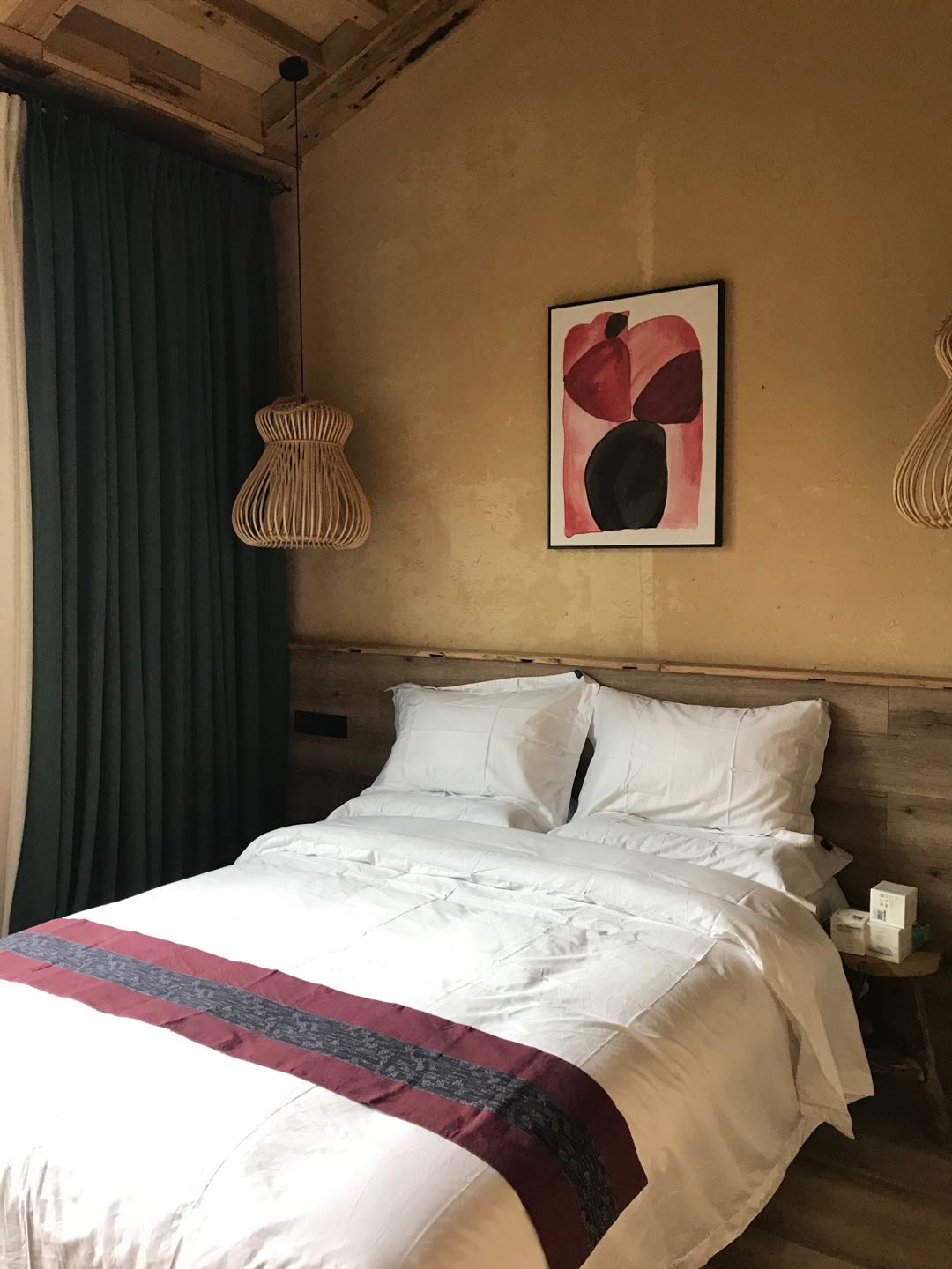 设计选材:设计团队就地取材,从山里搬来的毛石被平整地放置在夯实的地基上,砌成自然而原始的围墙,以呼应西北地区粗犷的乡土气质。空间墙面及原顶面选用稻草漆饰面,漆泥斑驳的肌理自带拙朴气质,让人想起田间慵懒的画面。