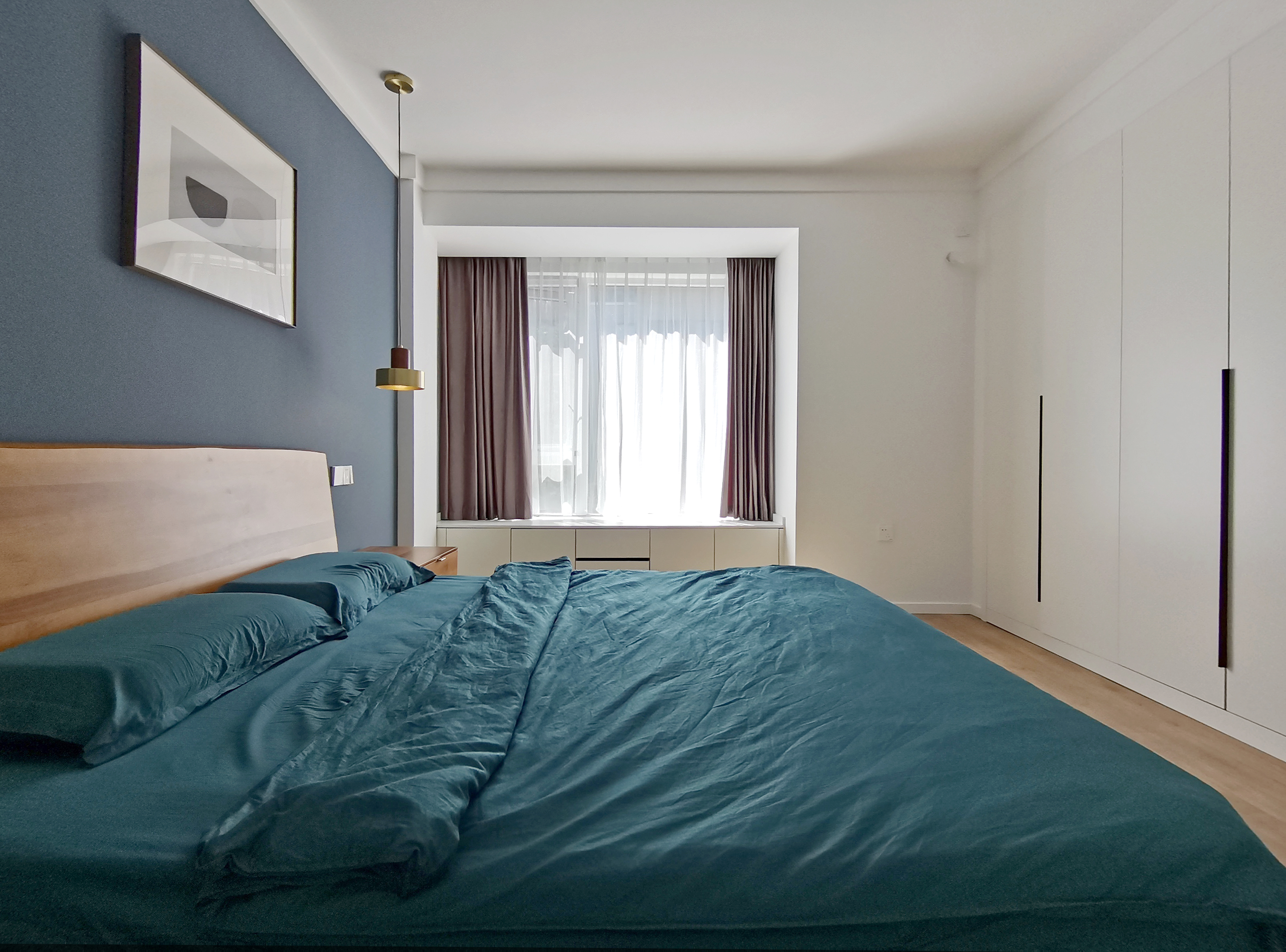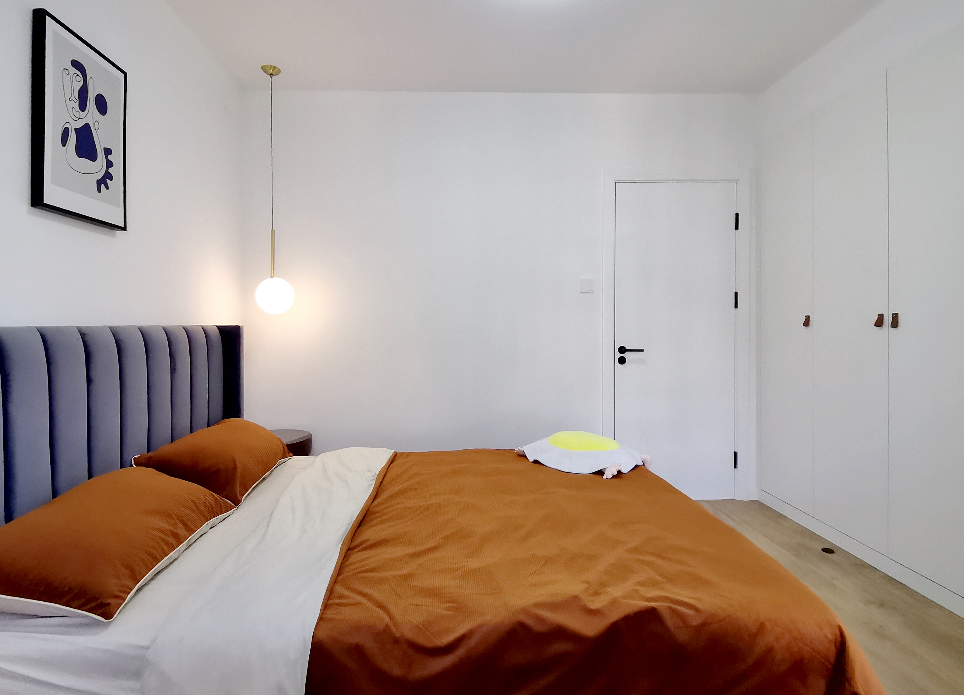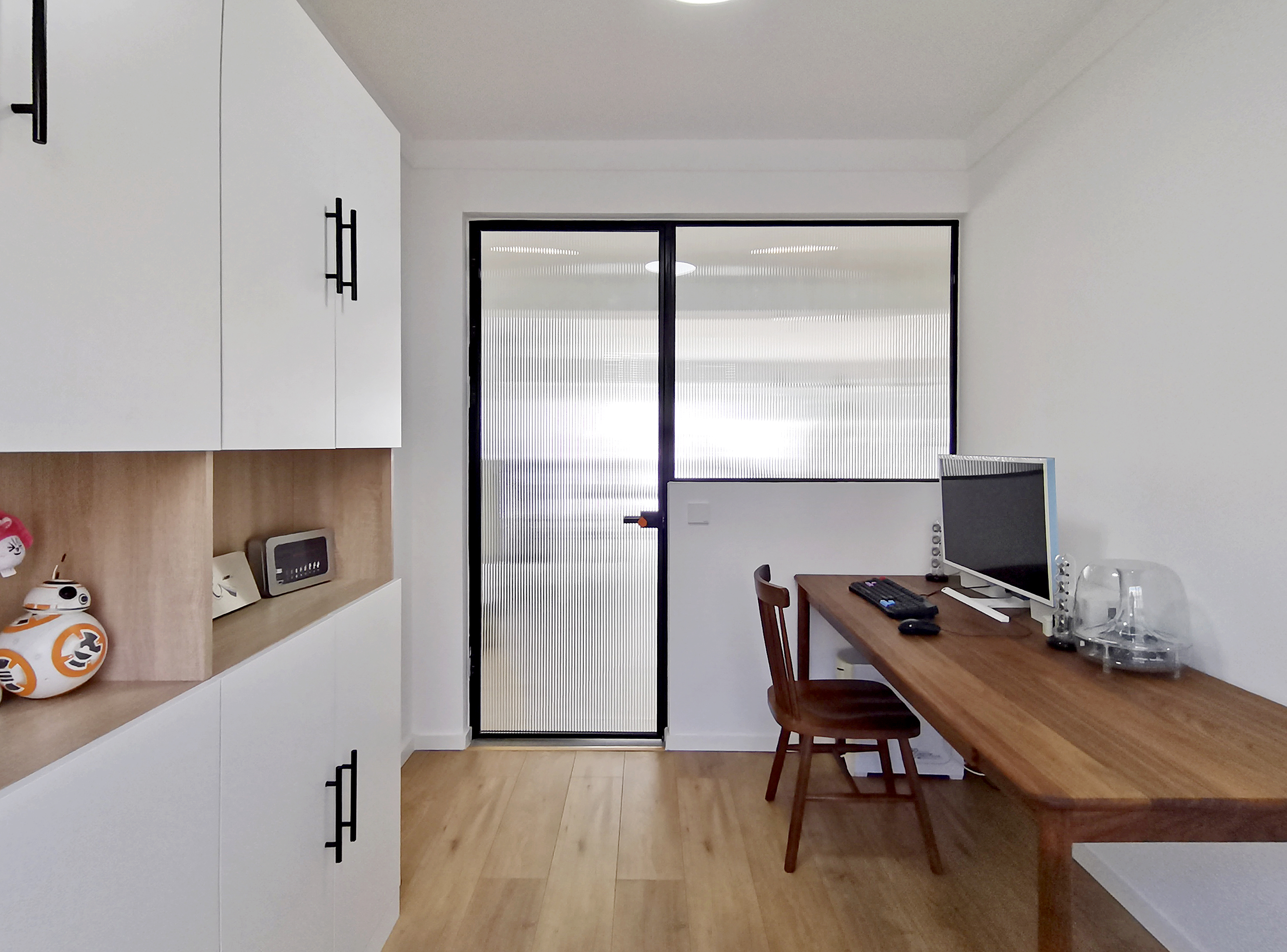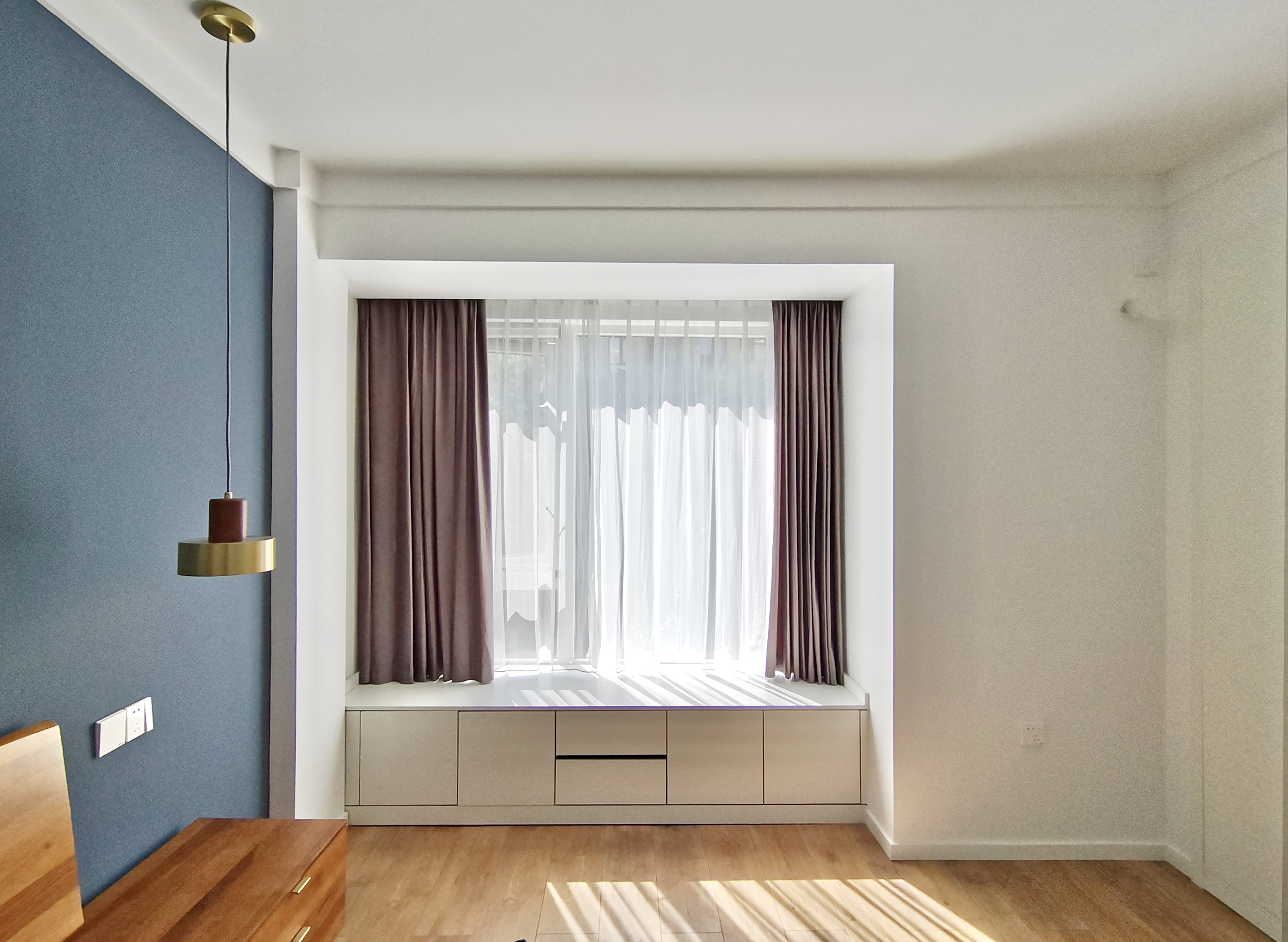空间布局:1.空间化整为零,重新划分空间比例。2.厨房的西厨功能与公共空间的过道相融合,解决了入户的鞋衣储物功能,利用吧台做了空间视线上的延伸。3.封露台,北方冬季寒冷为了更舒适的使用,加强了密封性,露台的融入扩大了餐厅的空间,解决了衣物晾晒的空间。4.卧室空间,利用柜子隐藏建筑角,取其方正。并给卧室空间分别增贴了两面墙的整体衣物收纳柜,解决衣物存放的紧张。