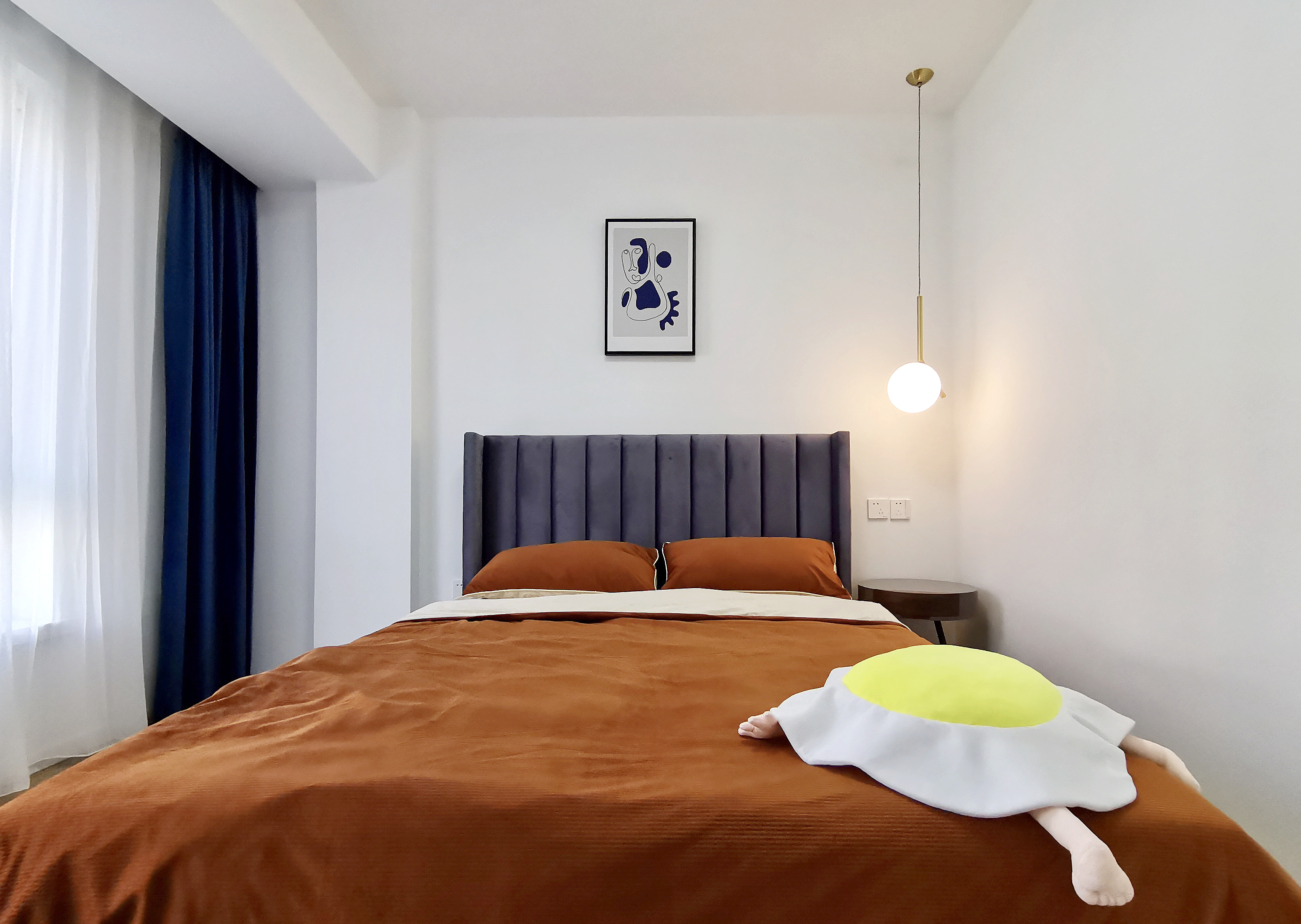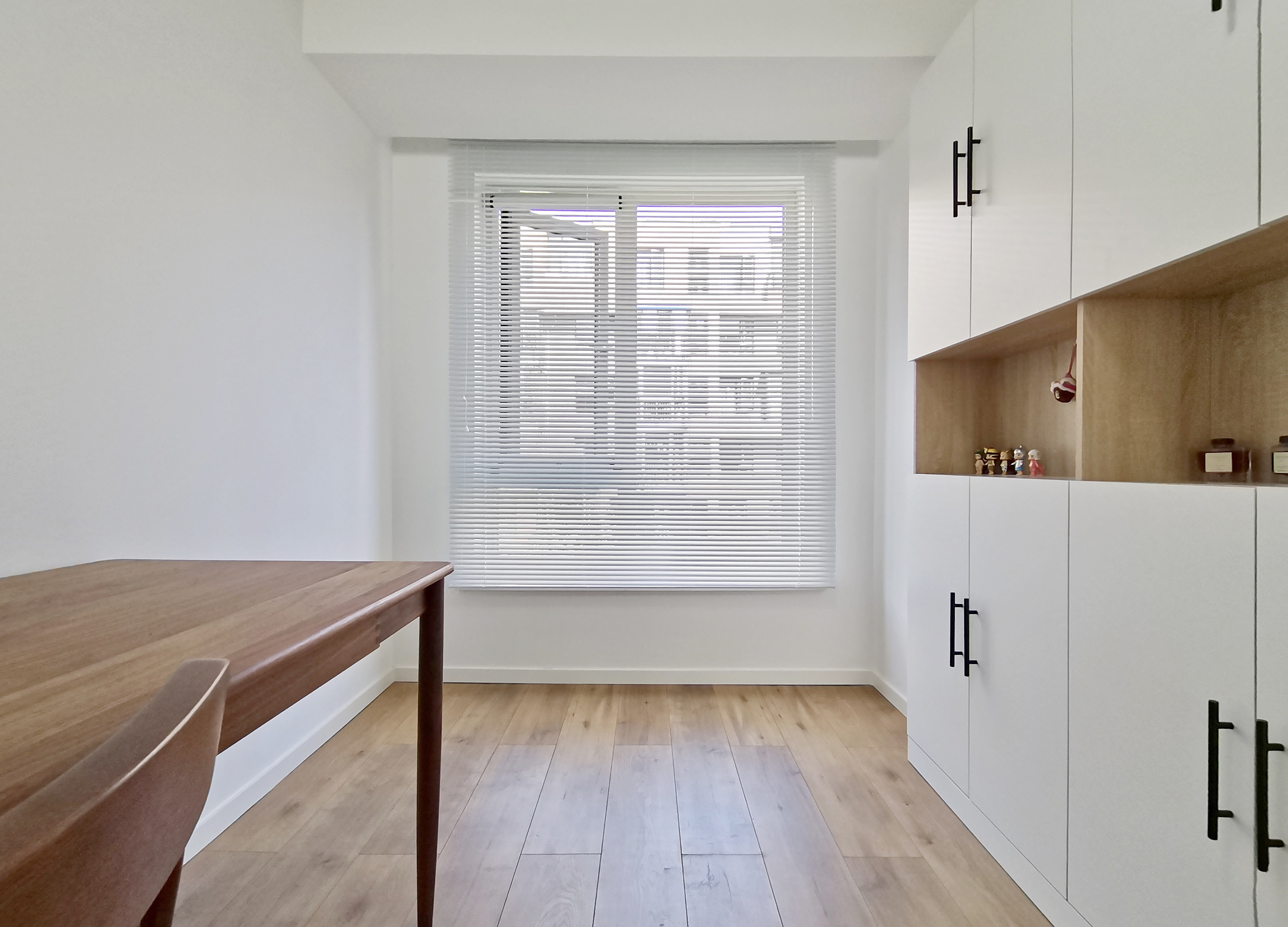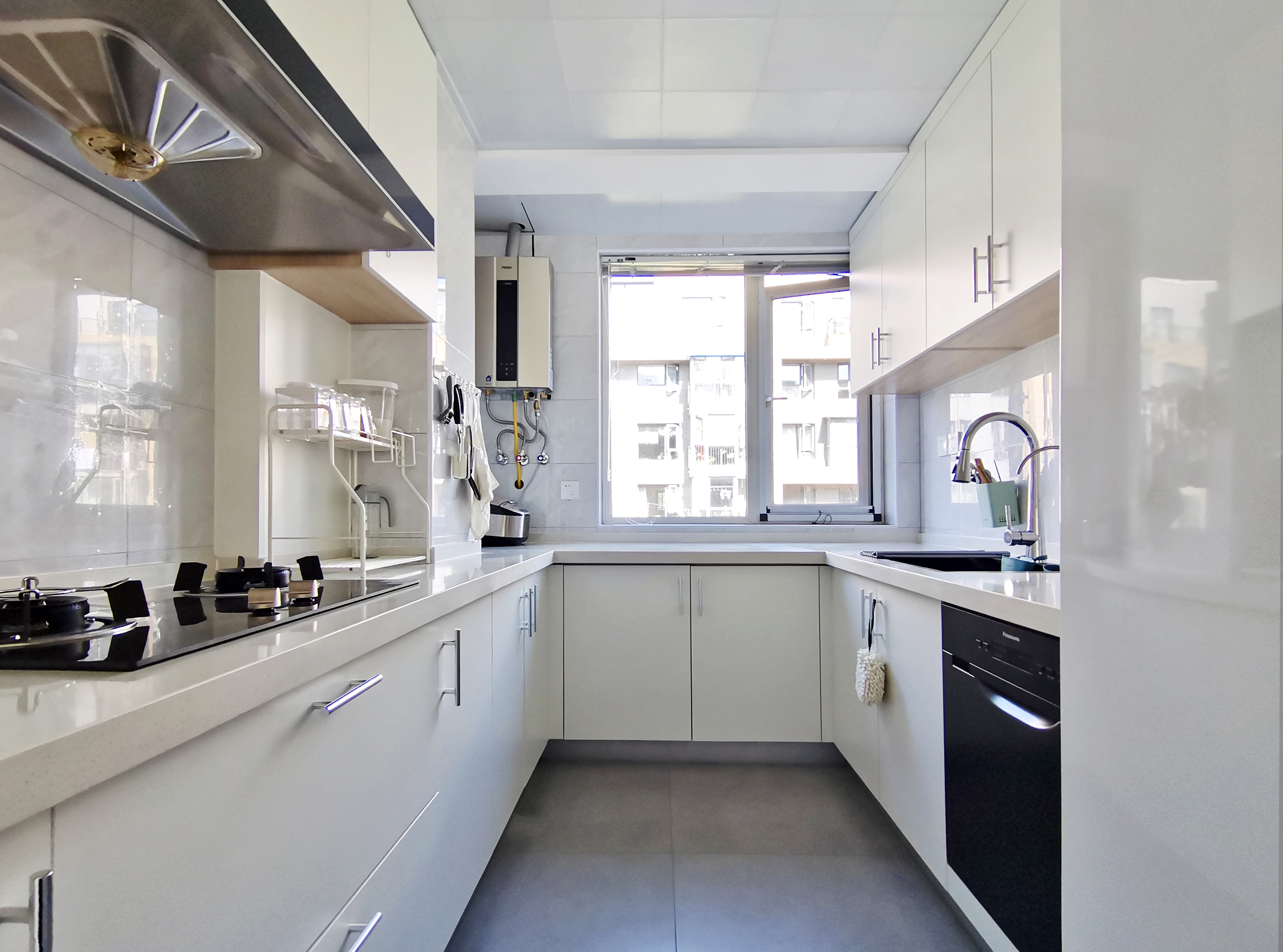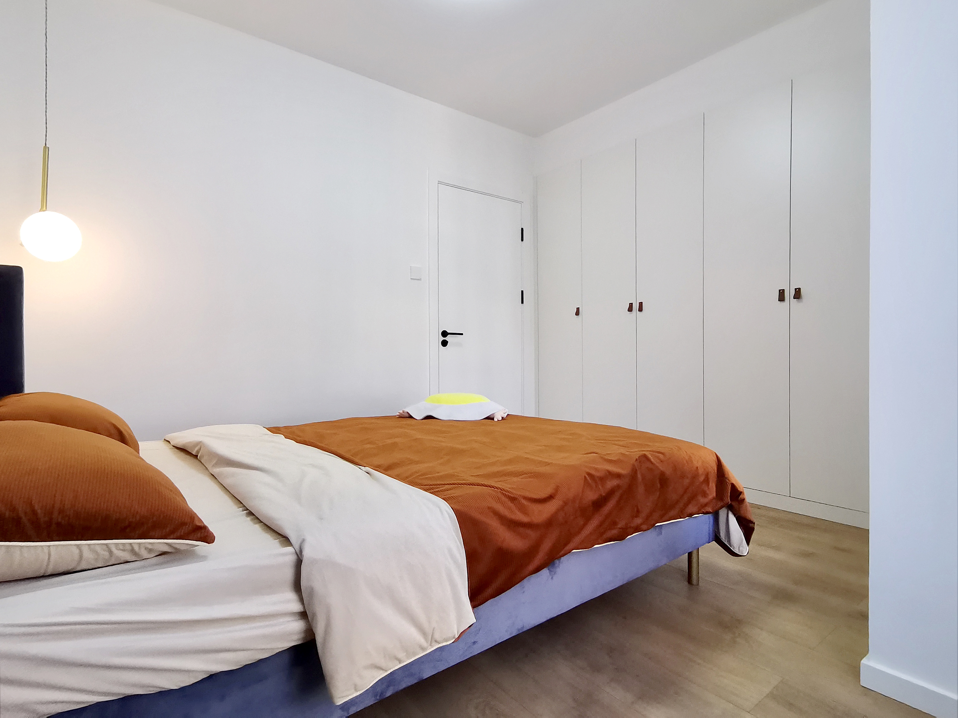 空间布局:1.空间化整为零,重新划分空间比例。2.厨房的西厨功能与公共空间的过道相融合,解决了入户的鞋衣储物功能,利用吧台做了空间视线上的延伸。3.封露台,北方冬季寒冷为了更舒适的使用,加强了密封性,露台的融入扩大了餐厅的空间,解决了衣物晾晒的空间。4.卧室空间,利用柜子隐藏建筑角,取其方正。并给卧室空间分别增贴了两面墙的整体衣物收纳柜,解决衣物存放的紧张。