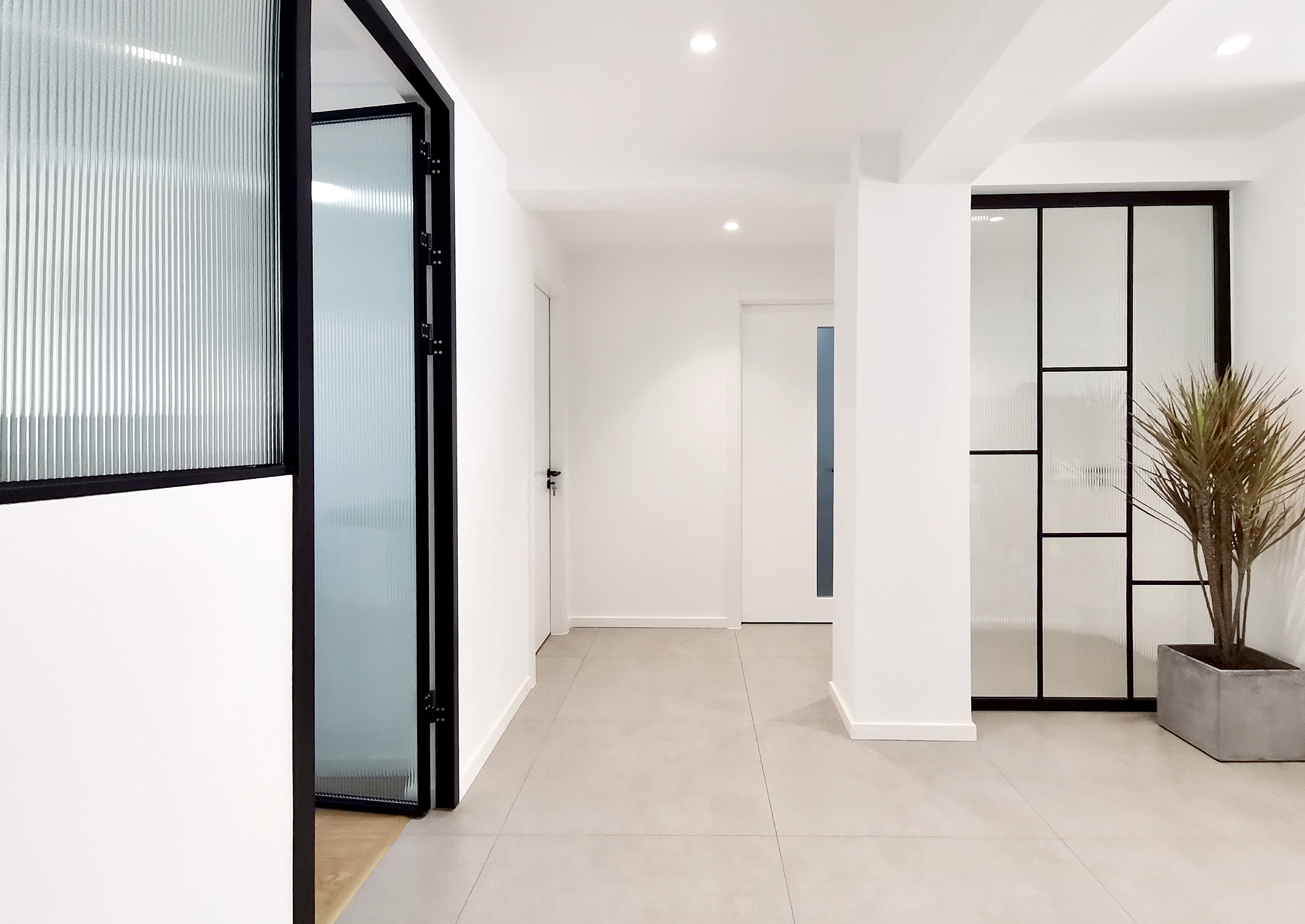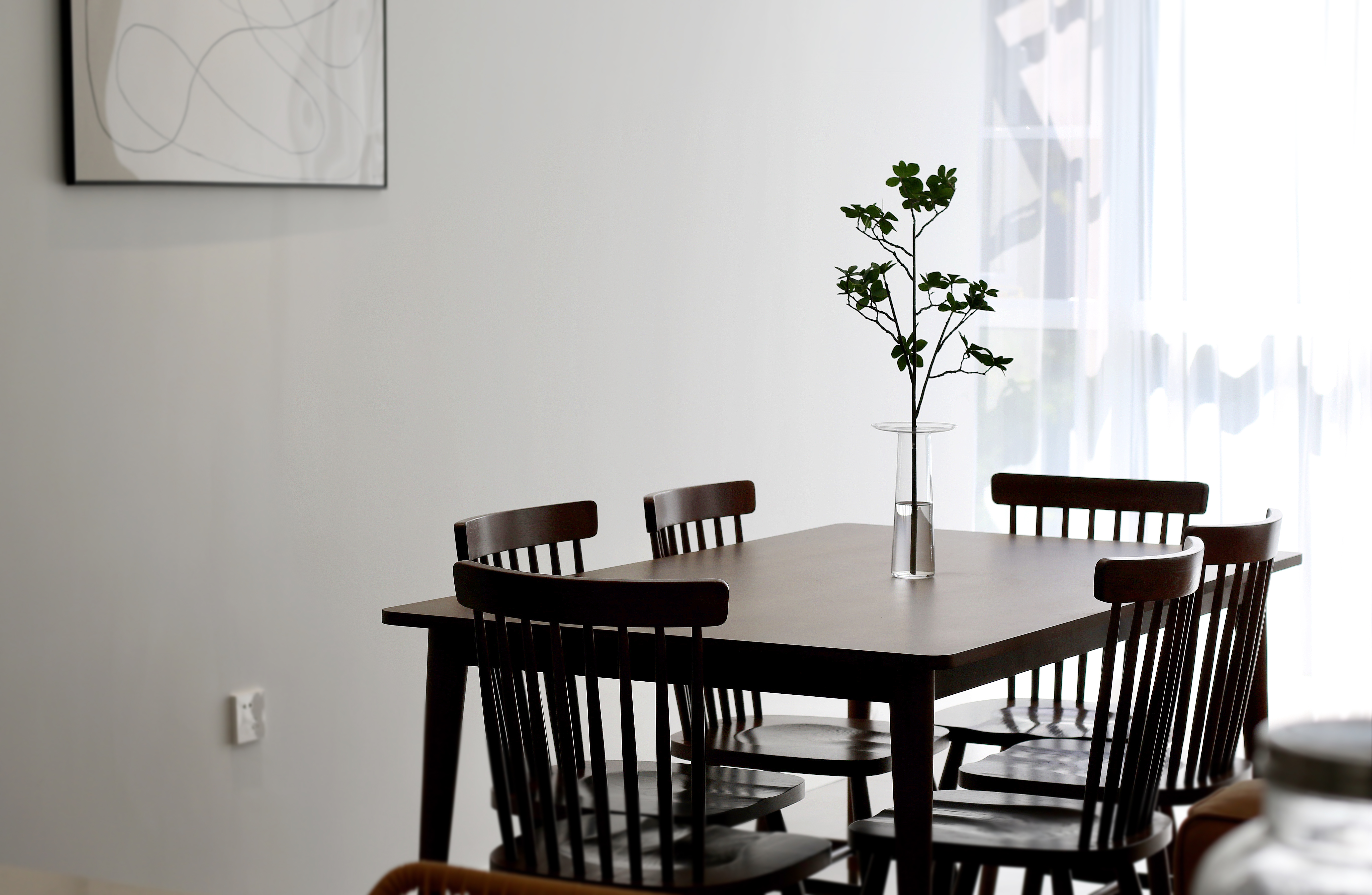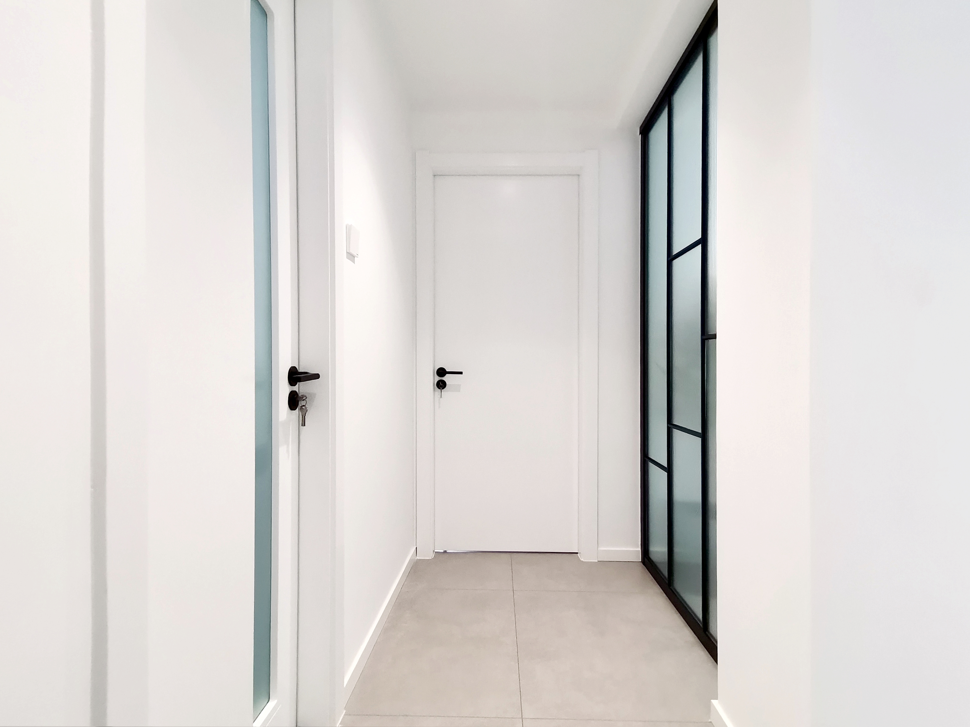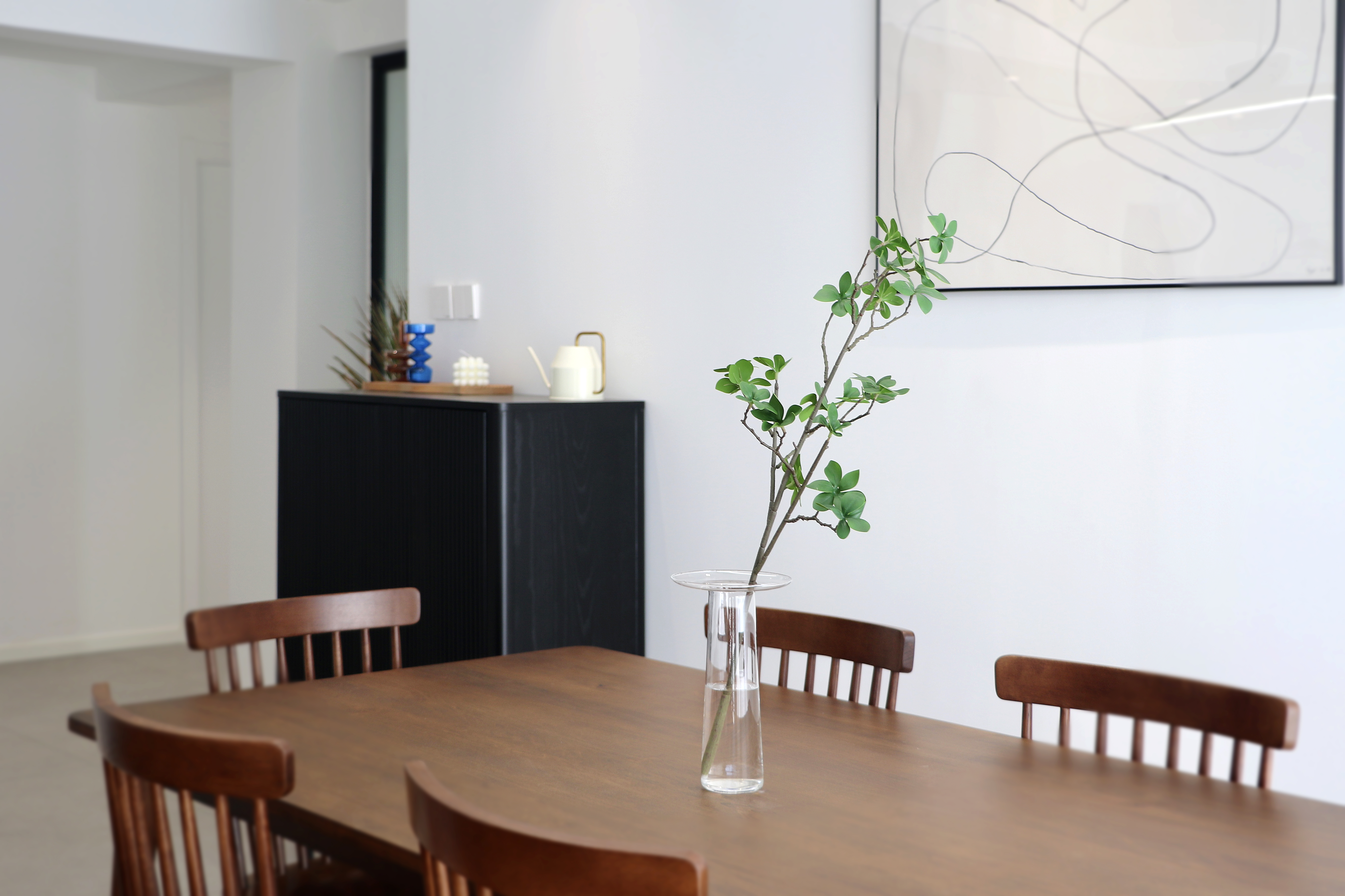 空间布局:1.空间化整为零,重新划分空间比例。2.厨房的西厨功能与公共空间的过道相融合,解决了入户的鞋衣储物功能,利用吧台做了空间视线上的延伸。3.封露台,北方冬季寒冷为了更舒适的使用,加强了密封性,露台的融入扩大了餐厅的空间,解决了衣物晾晒的空间。4.卧室空间,利用柜子隐藏建筑角,取其方正。并给卧室空间分别增贴了两面墙的整体衣物收纳柜,解决衣物存放的紧张。
