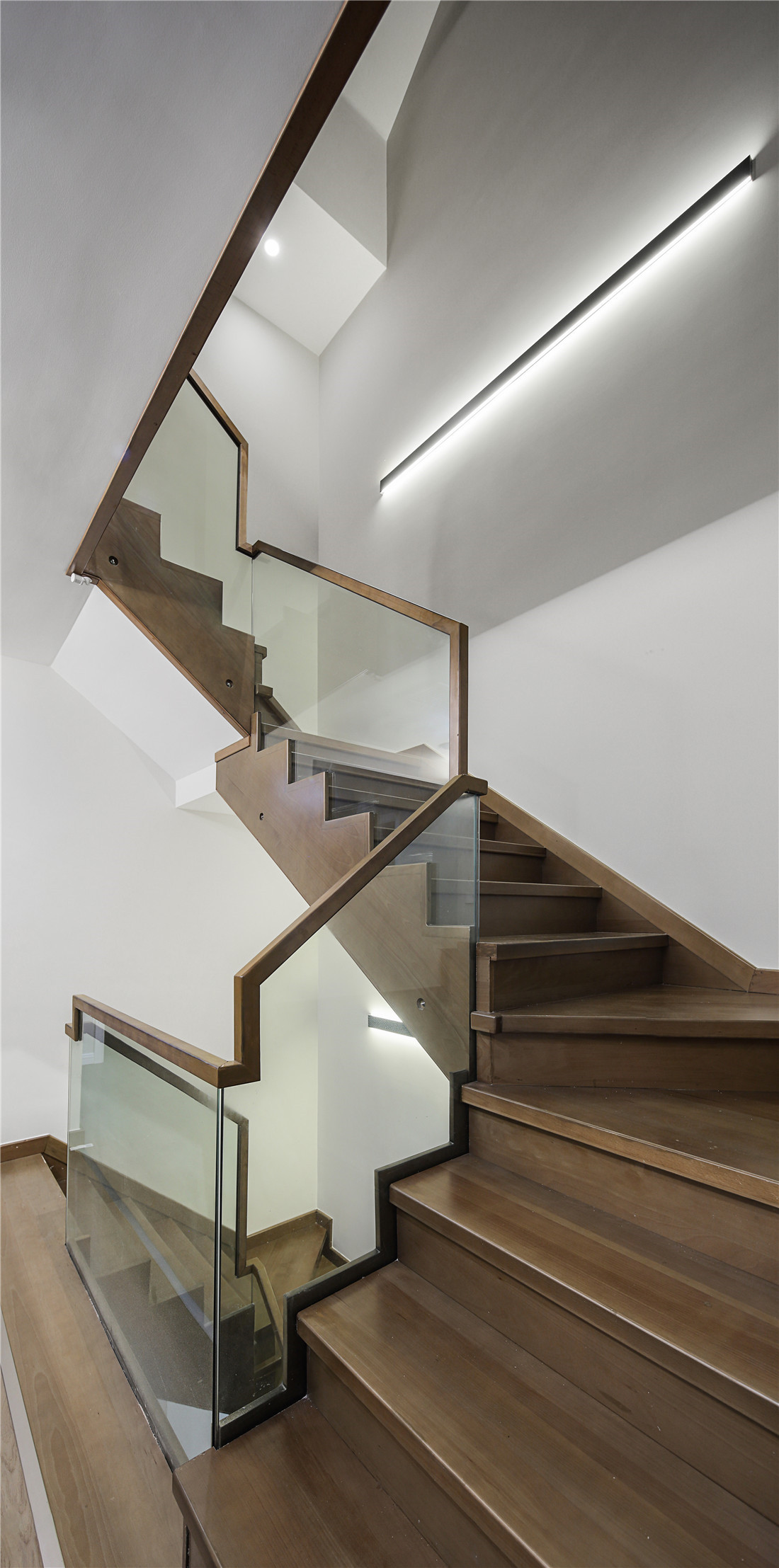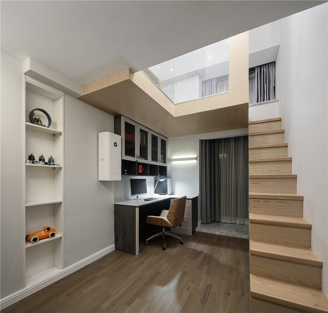 超高的书房,设计一强大收纳功能的楼梯,满足孩童楼中楼的阅读娱乐空间;