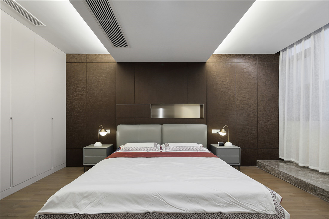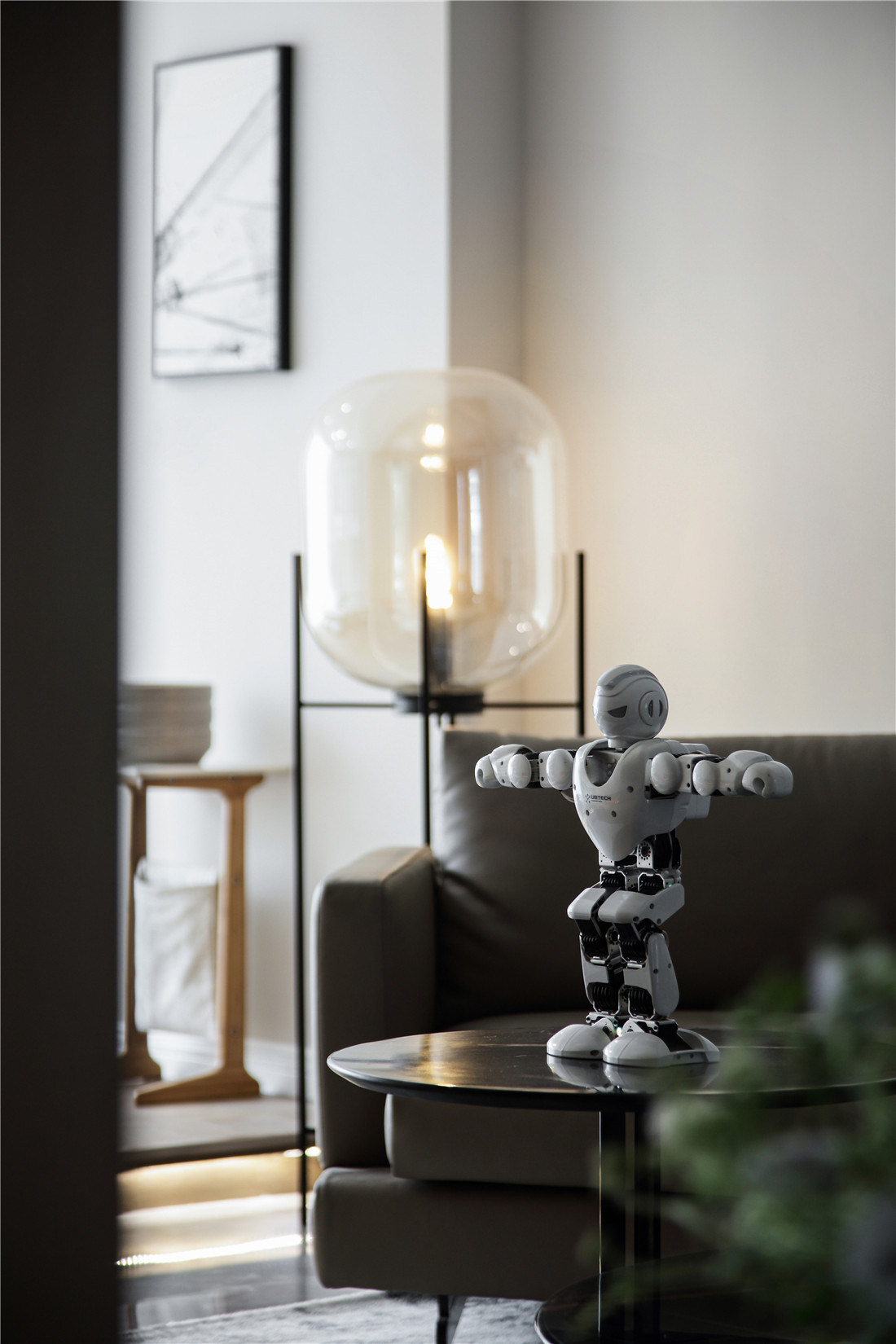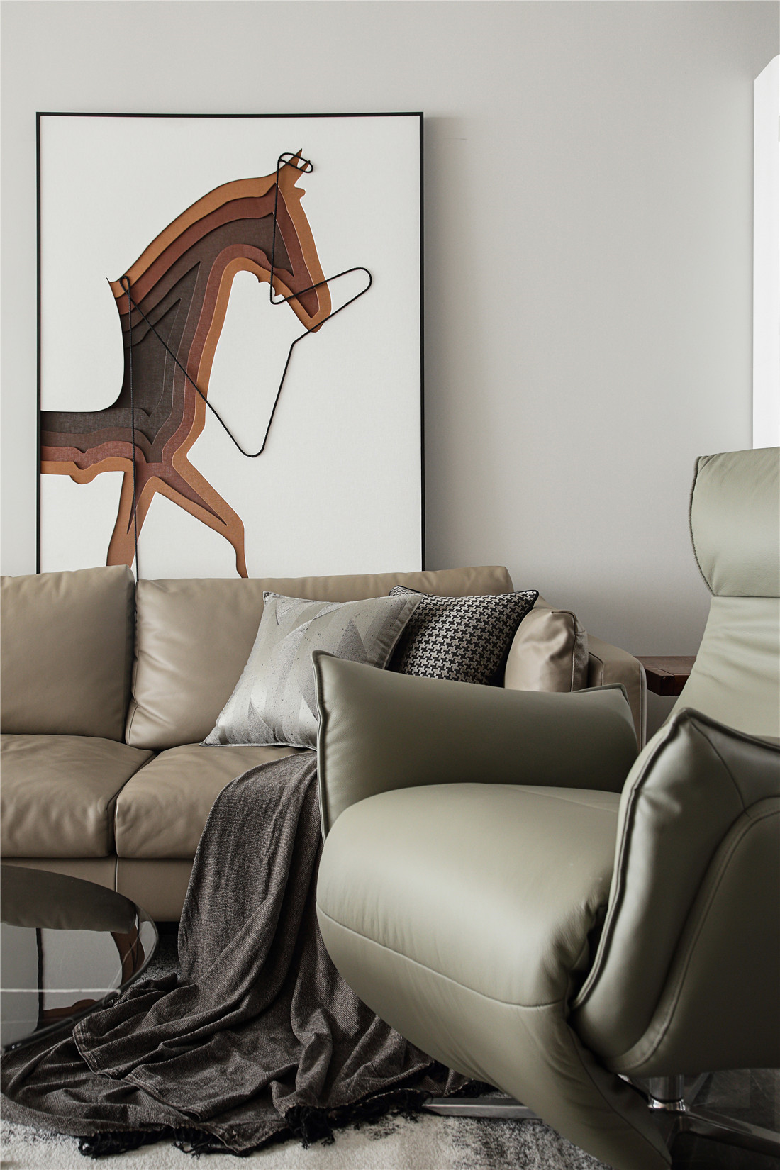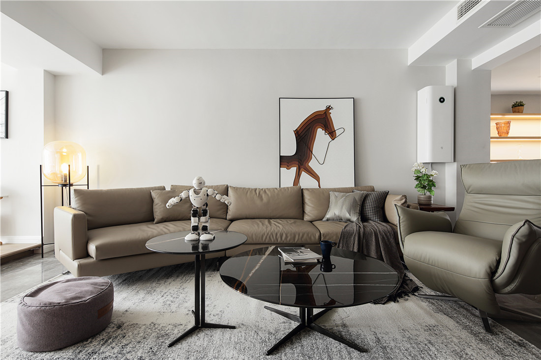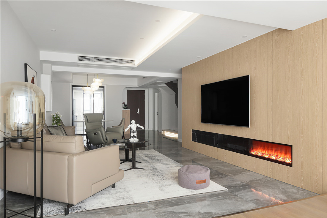 客厅以简洁纯粹的现代感呈现,摒弃华而不实的修饰,取而代之的是简单纯粹的线条和块面,以白灰为主调铺陈空间,大面的留白,适度增加木质温润,些许火光点缀以调和空间温度;