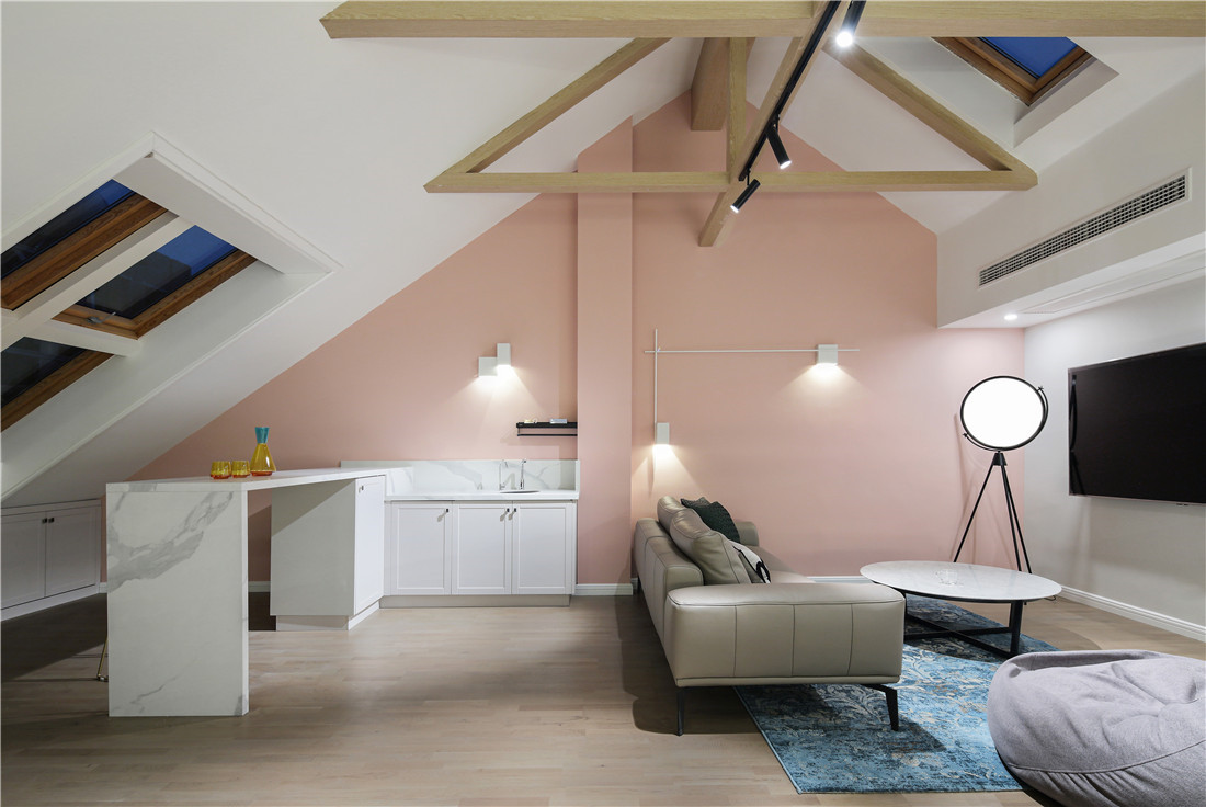 超高的阁楼,设计师依势而做,设计廊架式木梁,以轨道灯结合线光源、壁灯光源照明以解决照明功能,落地灯增加装饰性,功能和美学结合同时设计一升降楼梯并将天窗改成门,屋顶的户外自然纳入家中,亦可观星赏月;