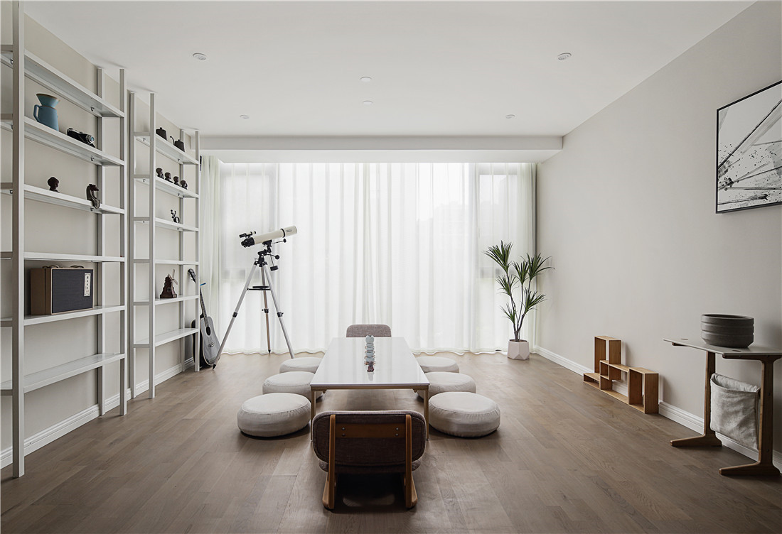 微许抬高的木质地台,现代凝练的钢结构的茶架为背景,人临窗席地而坐 ,拉开窗帘,随着日光和时间变化,在家中即可享受自然美景;