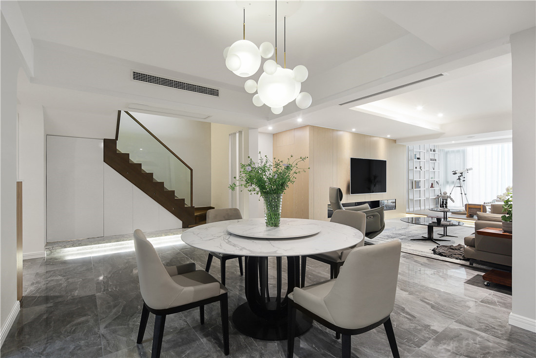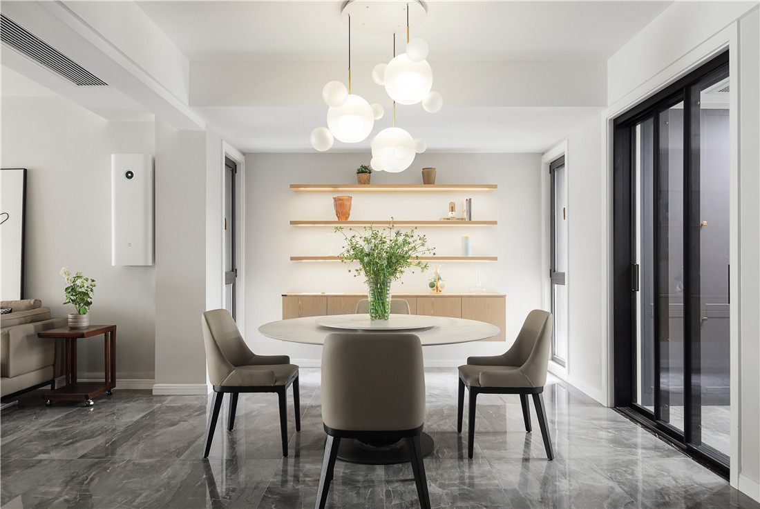 餐厅围桌而坐,以线光为景的陈列架映衬球形吊灯,注入空间灵动;