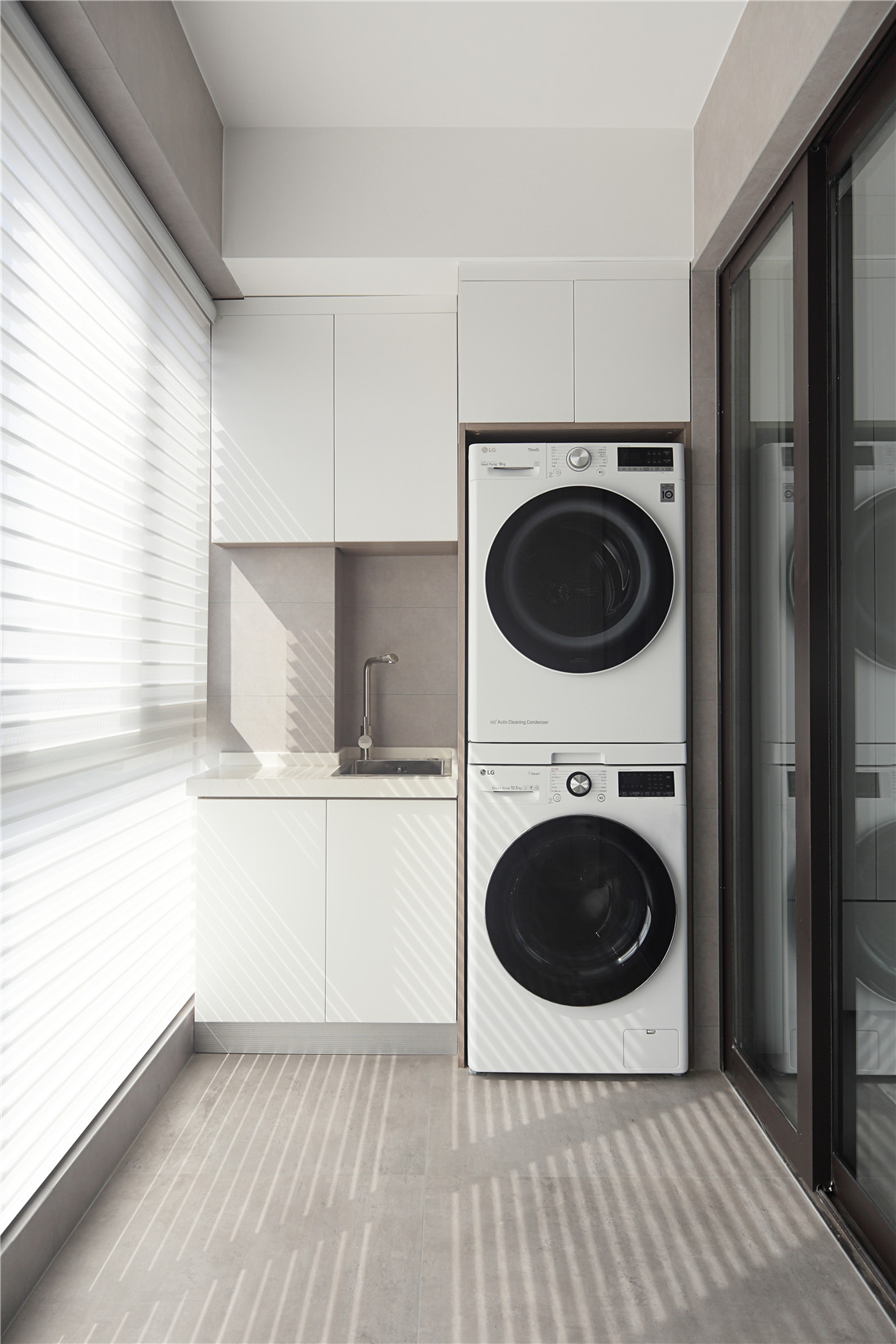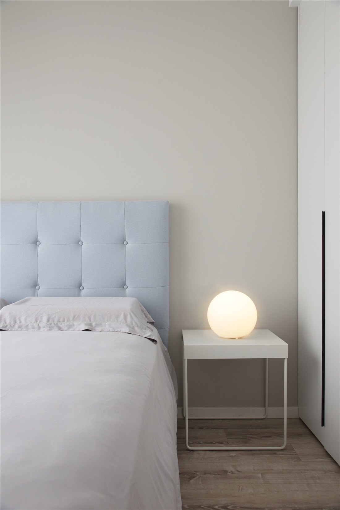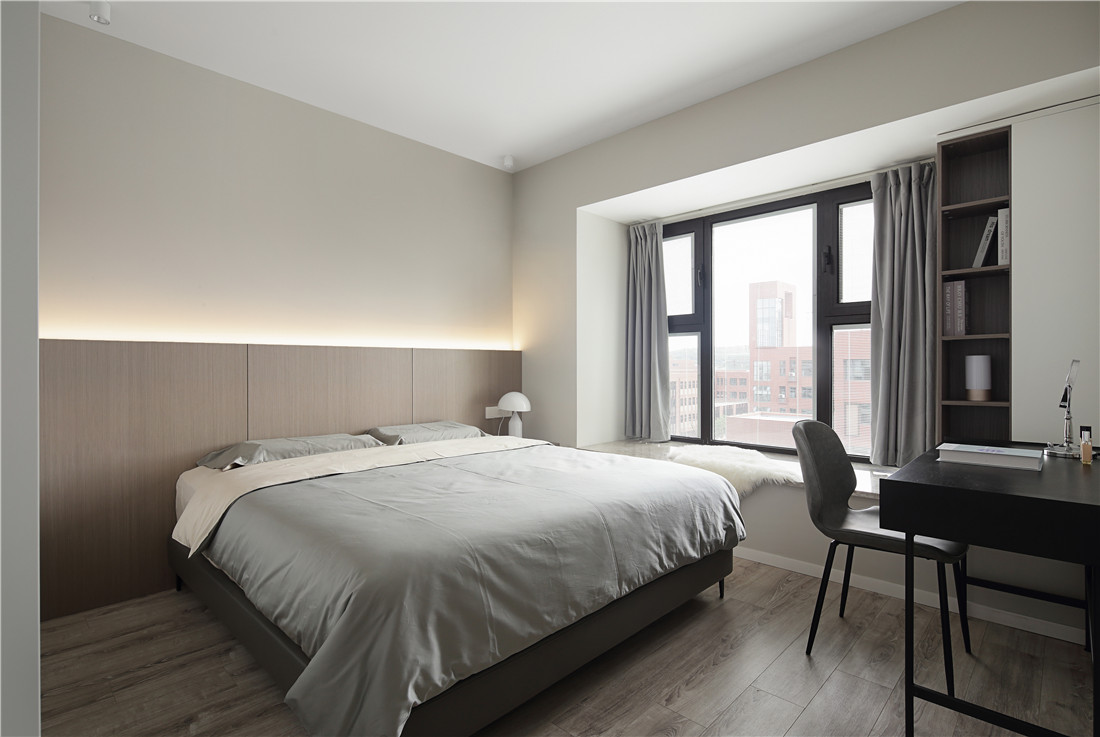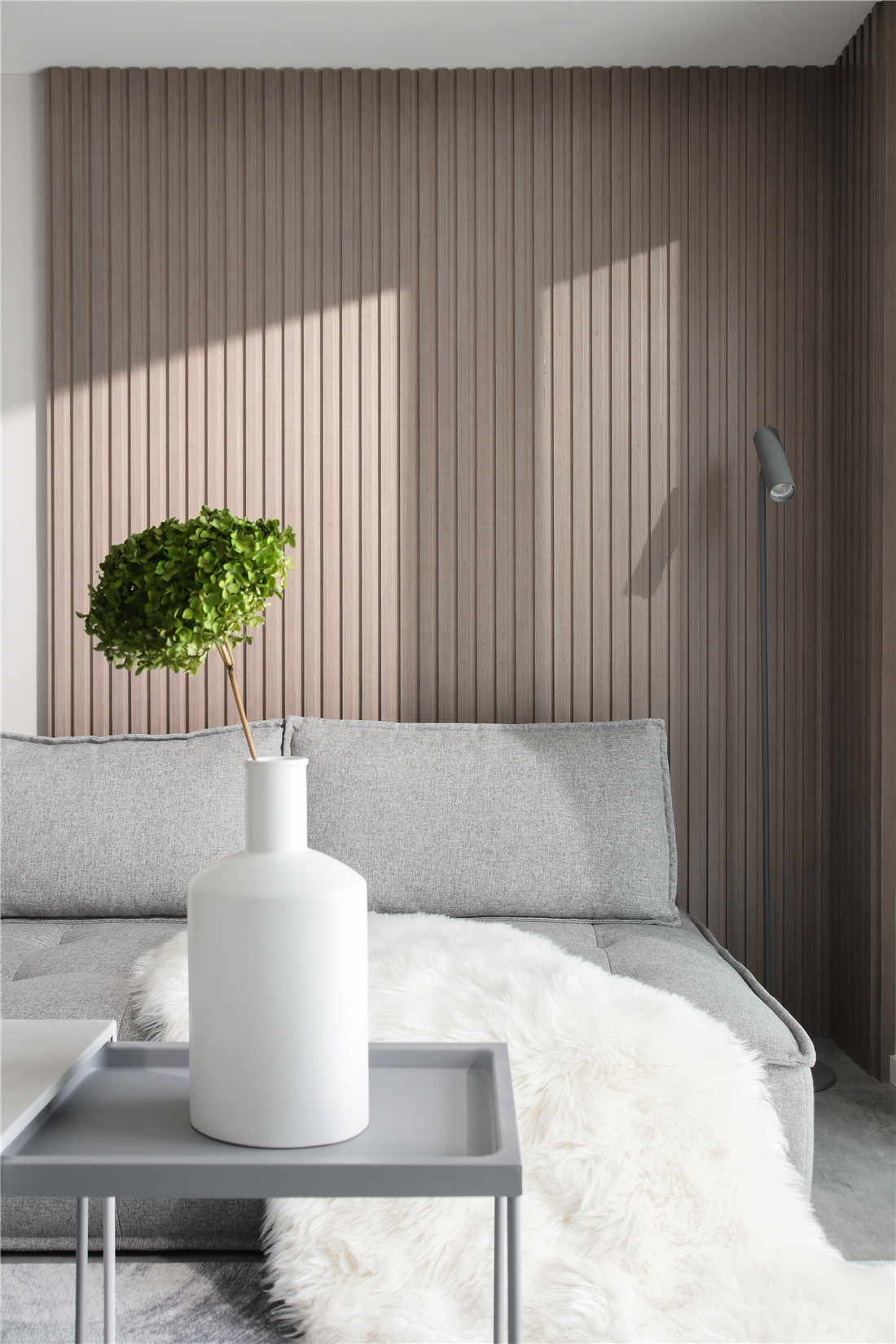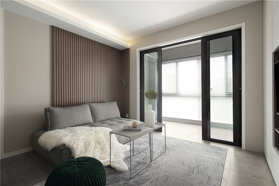 以灰白为背景,竖条木板铺陈,灰色棉麻质地的布艺穿插其中,阳光洒落,自然而然,光和爱应运而生,根本无需多余的修饰;