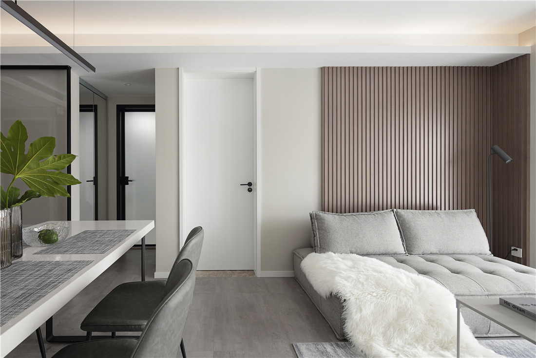 玄关墙面采用温润木板结合镜面,增加空间延续性,到顶鞋柜延展至书房,和书柜巧妙结合形成整体,换繁琐为简单,让小空间更为洗练干净;