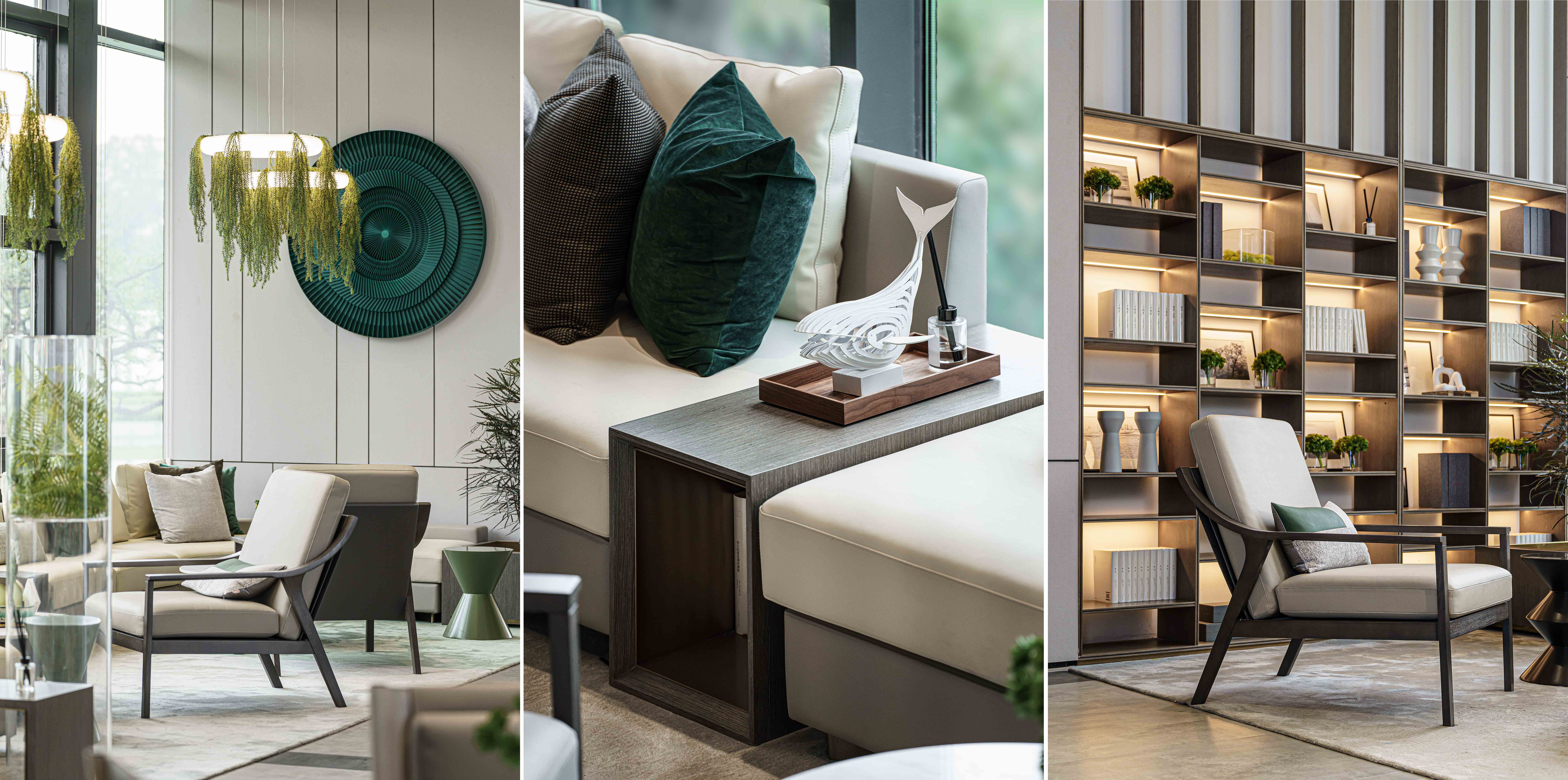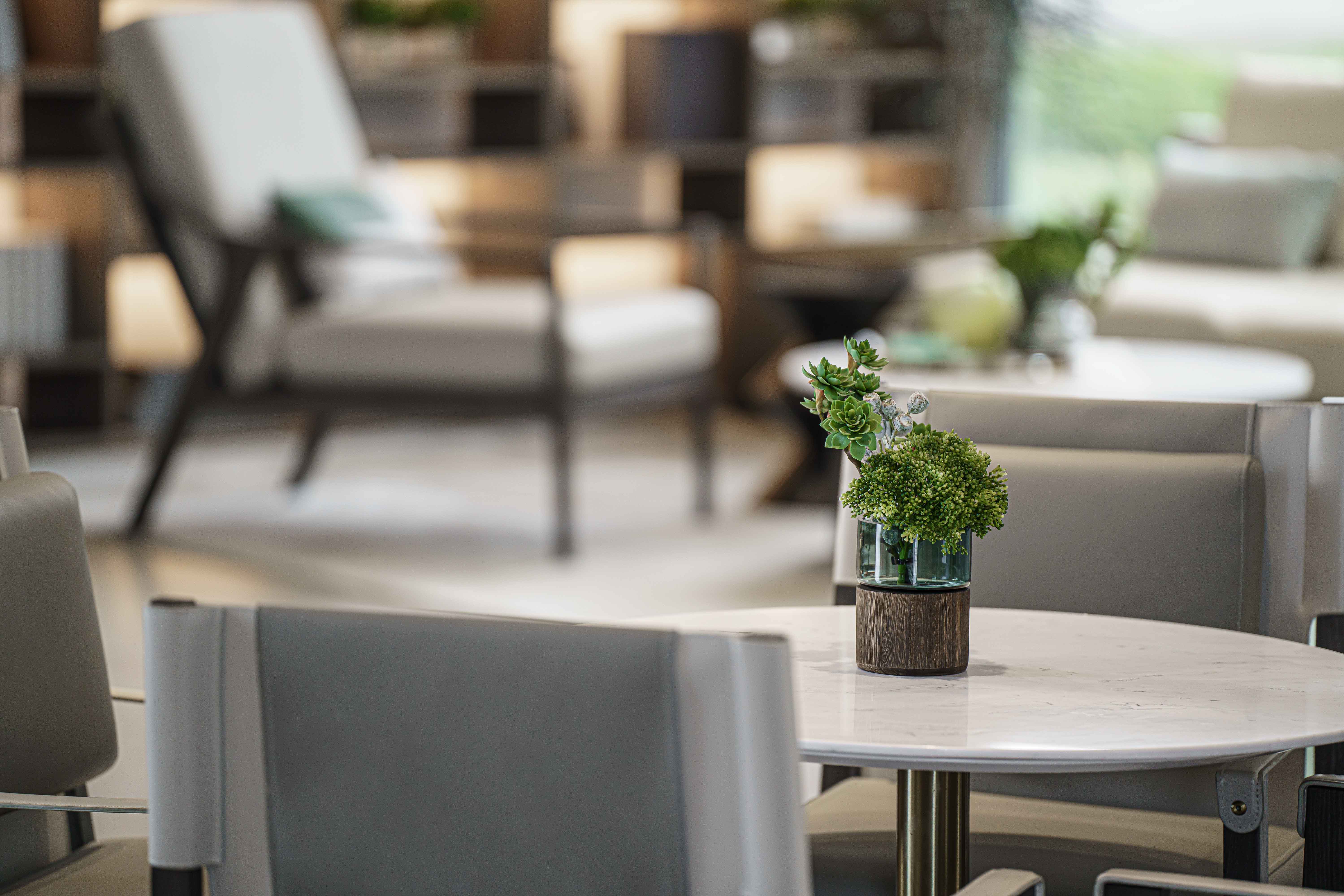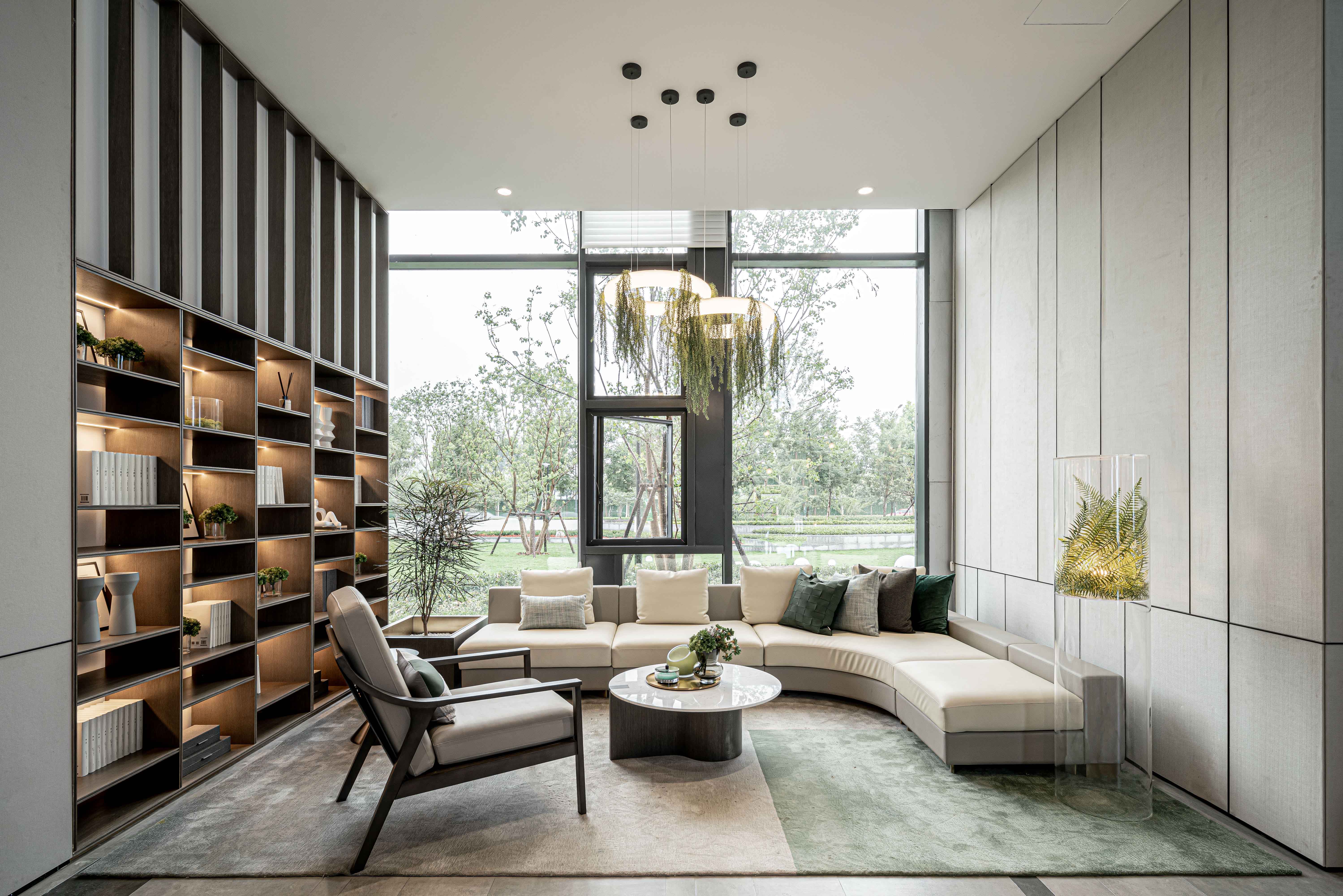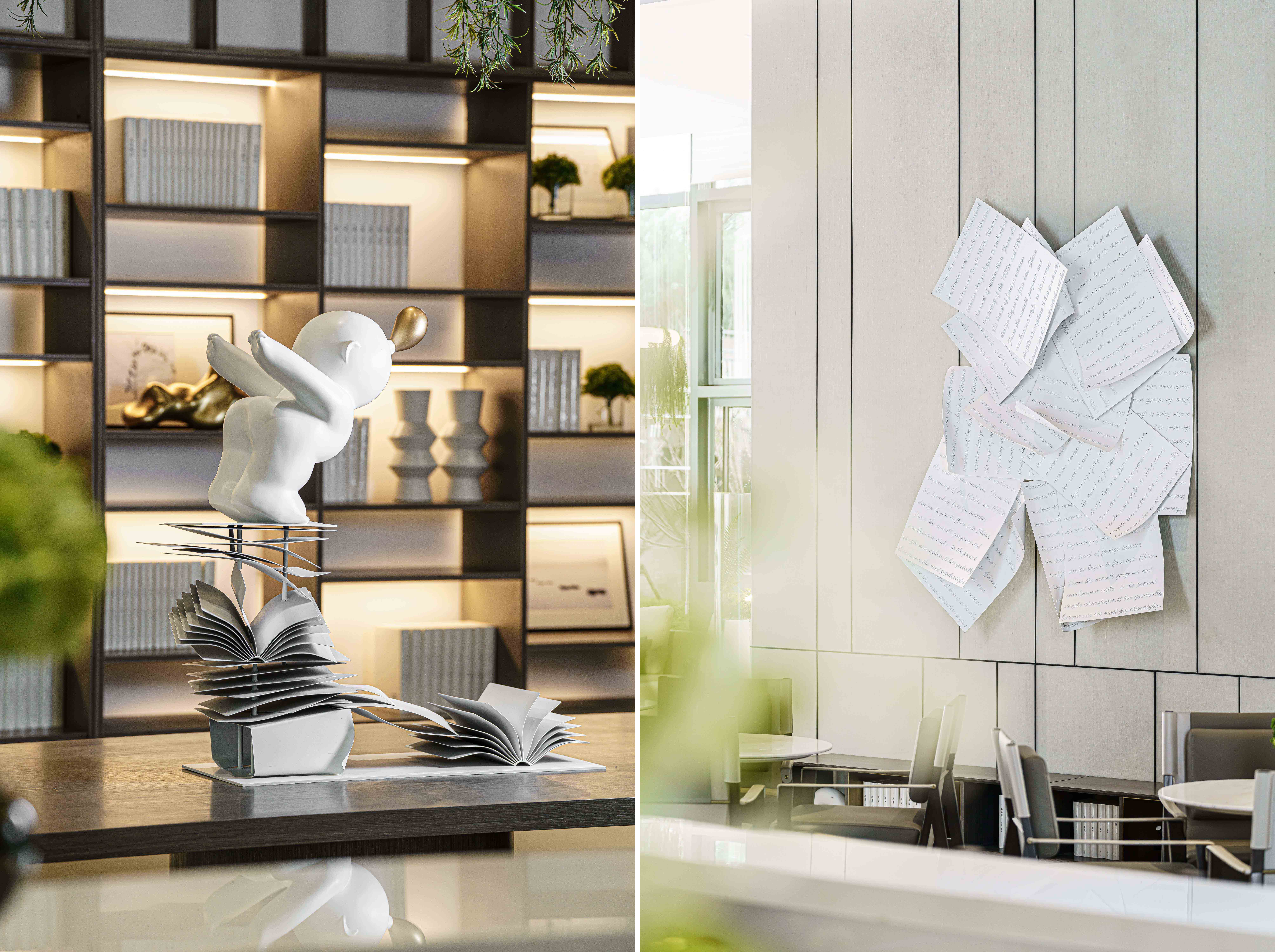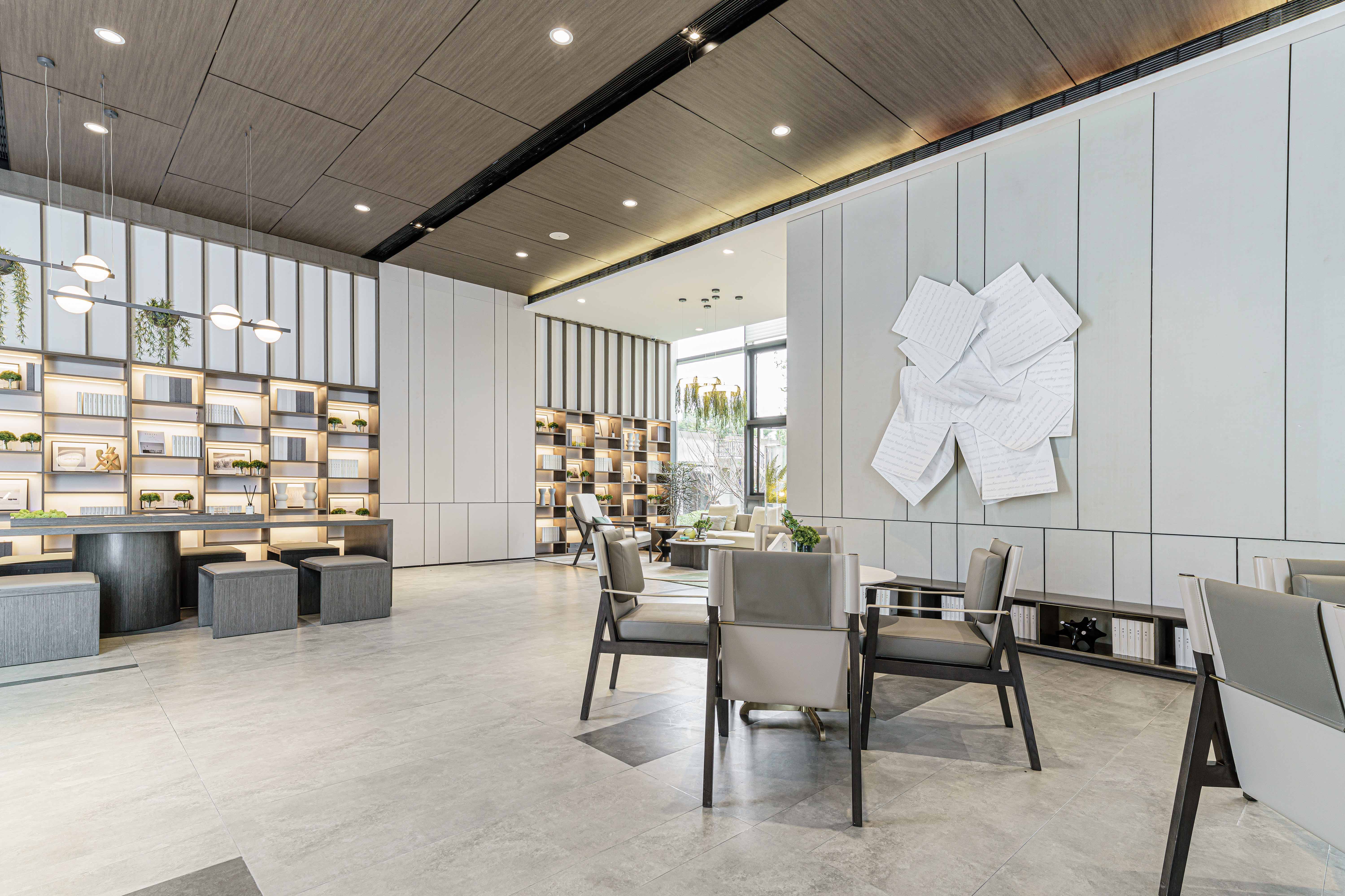 山水湖城售楼处 洽谈区 走入洽谈区就像走入了艺术走廊,这里用了荷兰艺术家Levi Van veluw 的艺术作品,将当代艺术融入自然空间,给空间体验者带来美轮美奂、赏心悦目的视觉体验。此处也将植物运用到各类灯具中,让光影也成为一种自然元素之一,赋予空间以灵动之美。