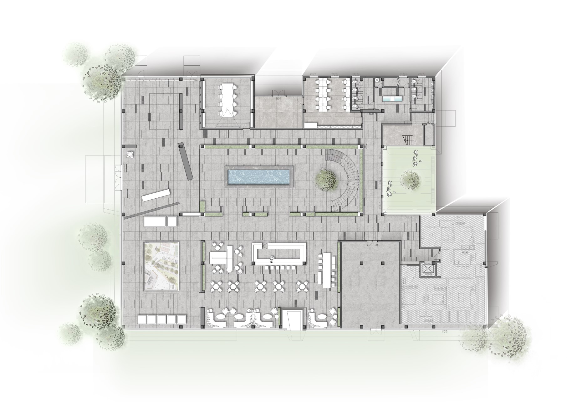 空间意境:设计以人与自然和谐相处为出发点,在空间中打造了一个中央花园。流动性的线条结合有机绿植,为人们营造出一个伊甸寻梦、绿叶丛林的感官空间。